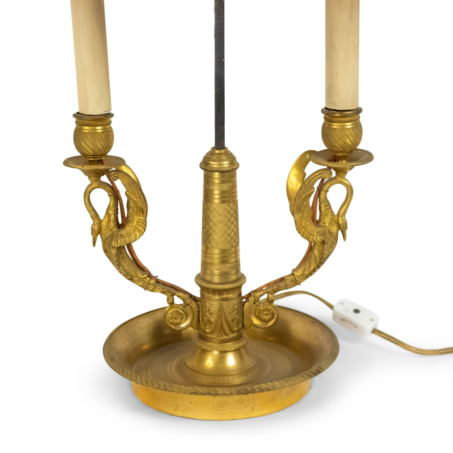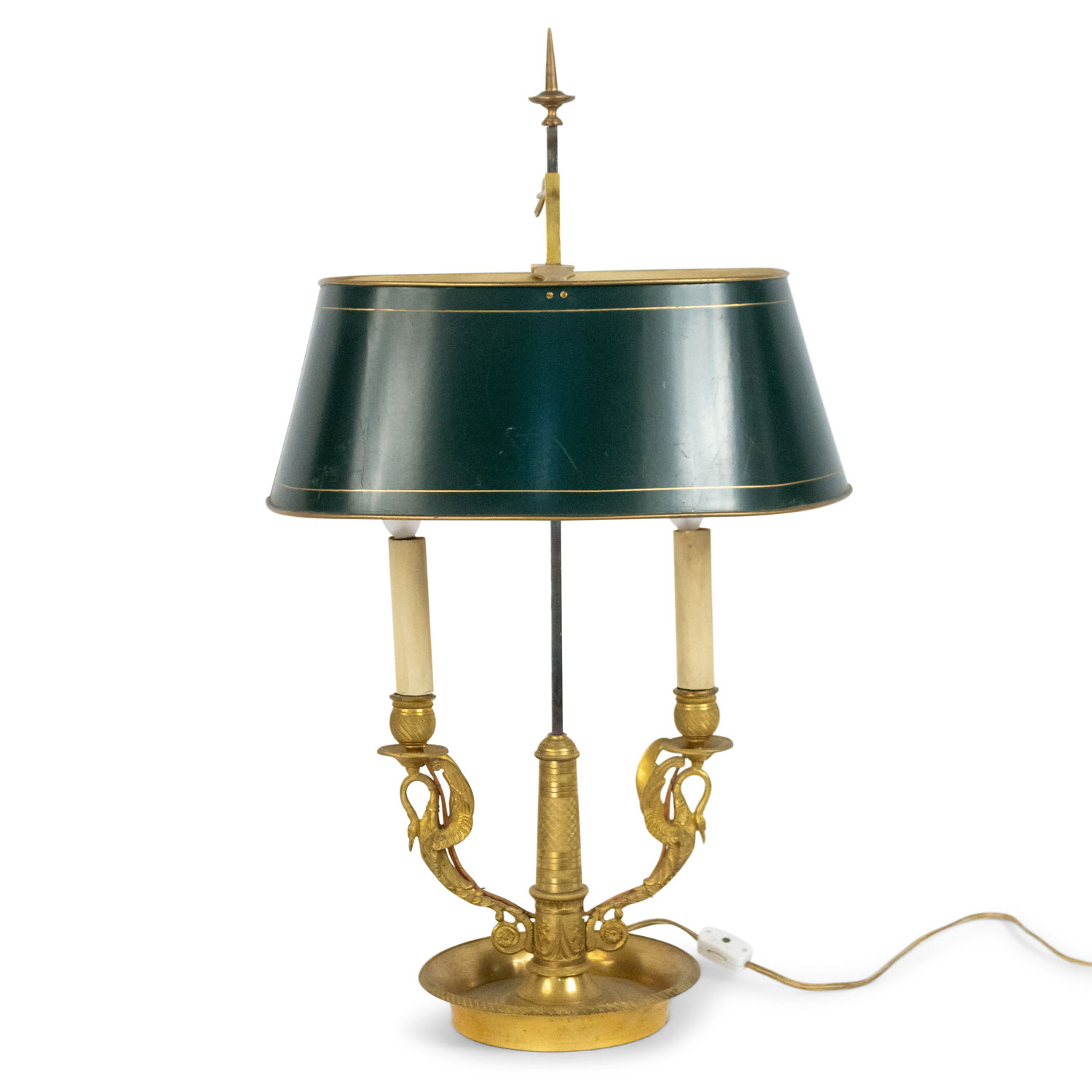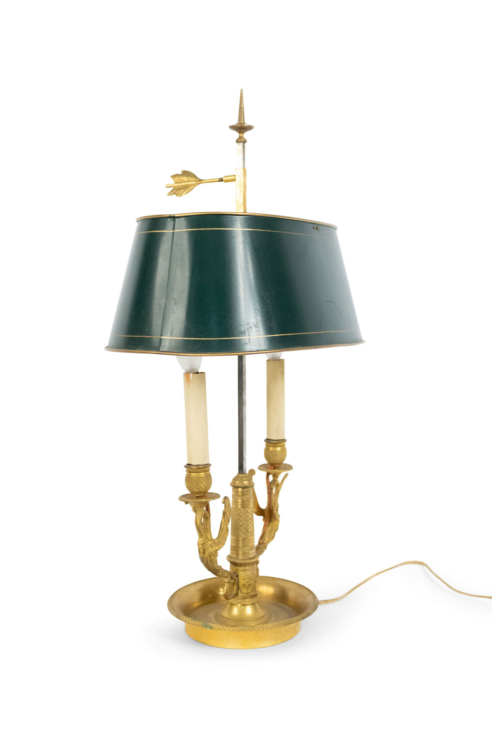 French Empire style (20th Century) bronze dore 2 swan arm round base bouillotte table lamp with oval green tole shade.