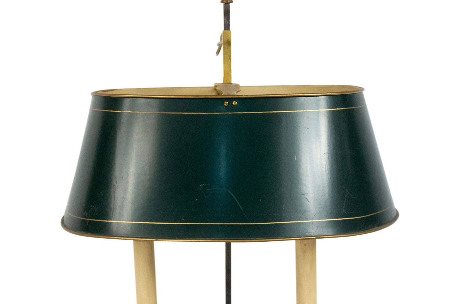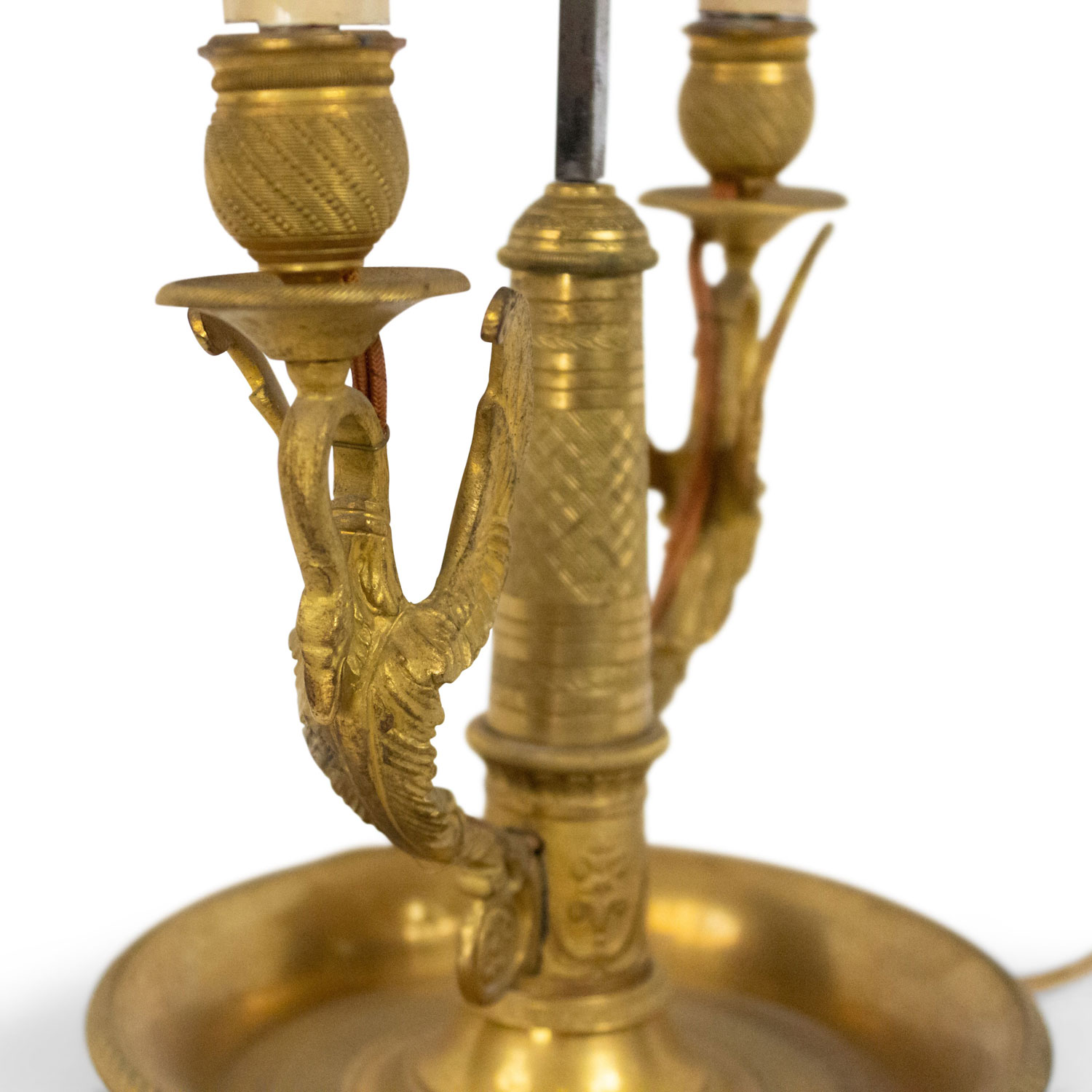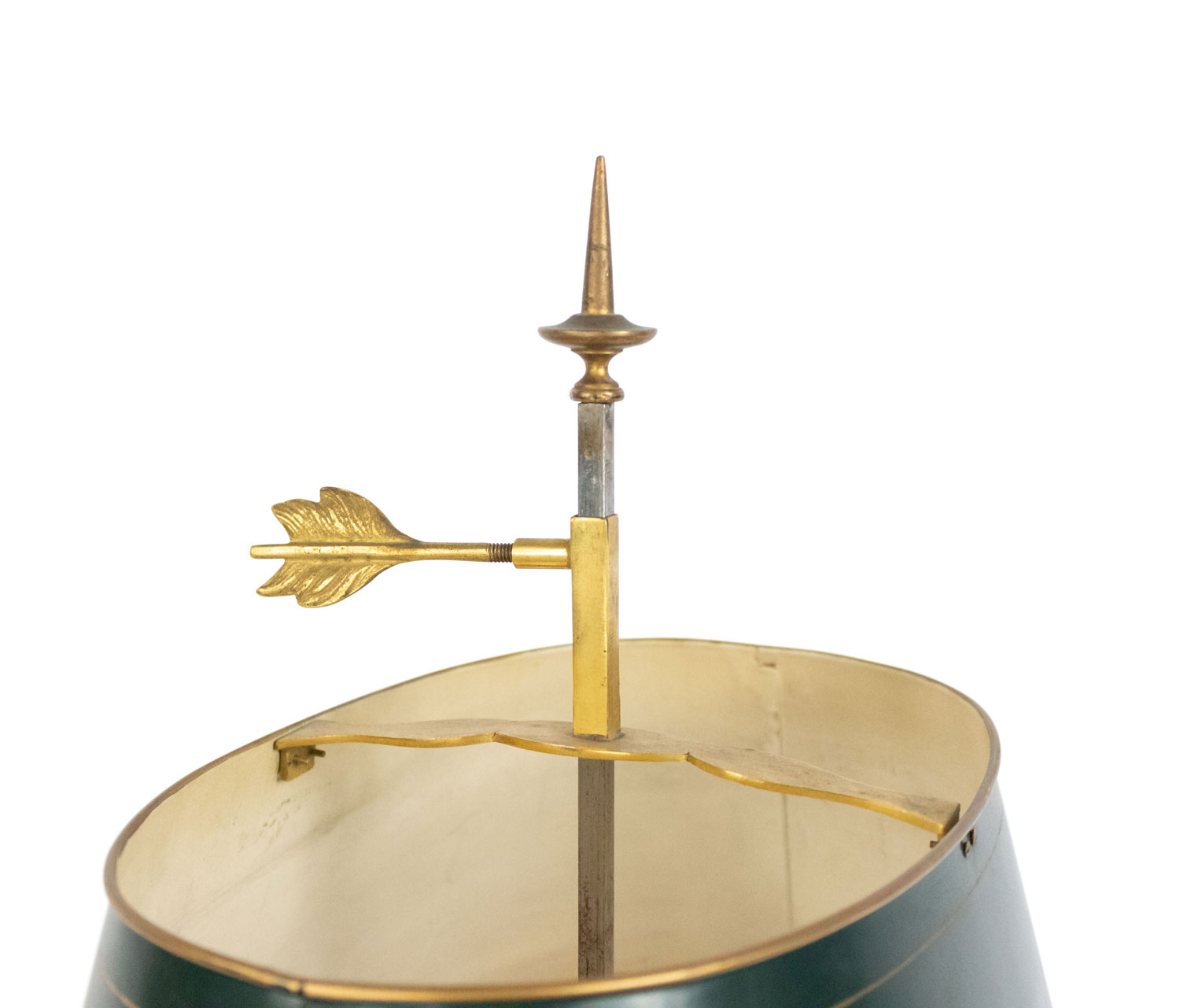 French Empire style (20th Century) bronze dore 2 swan arm round base bouillotte table lamp with oval green tole shade.