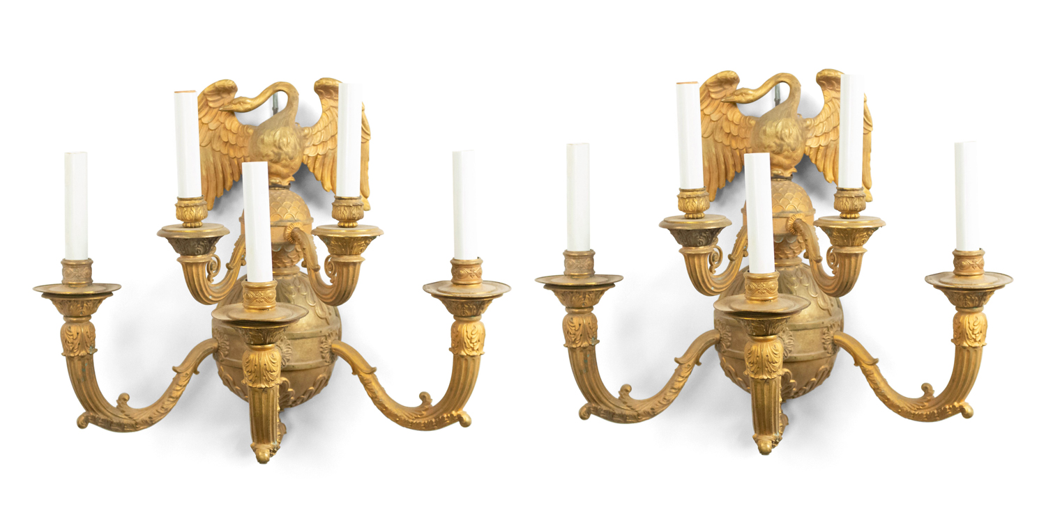 PAIR of French Empire-style (19th Century) bronze wall sconces with 5 arms, swan tops and a double ball design (PRICED AS PAIR).