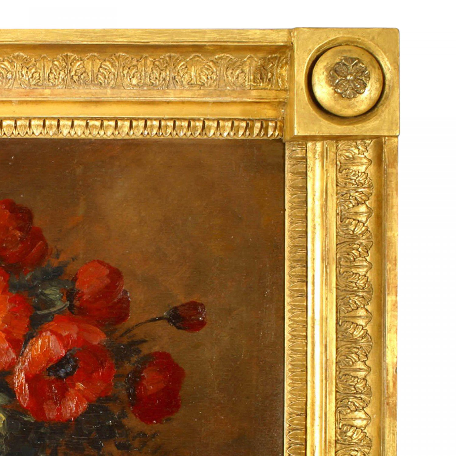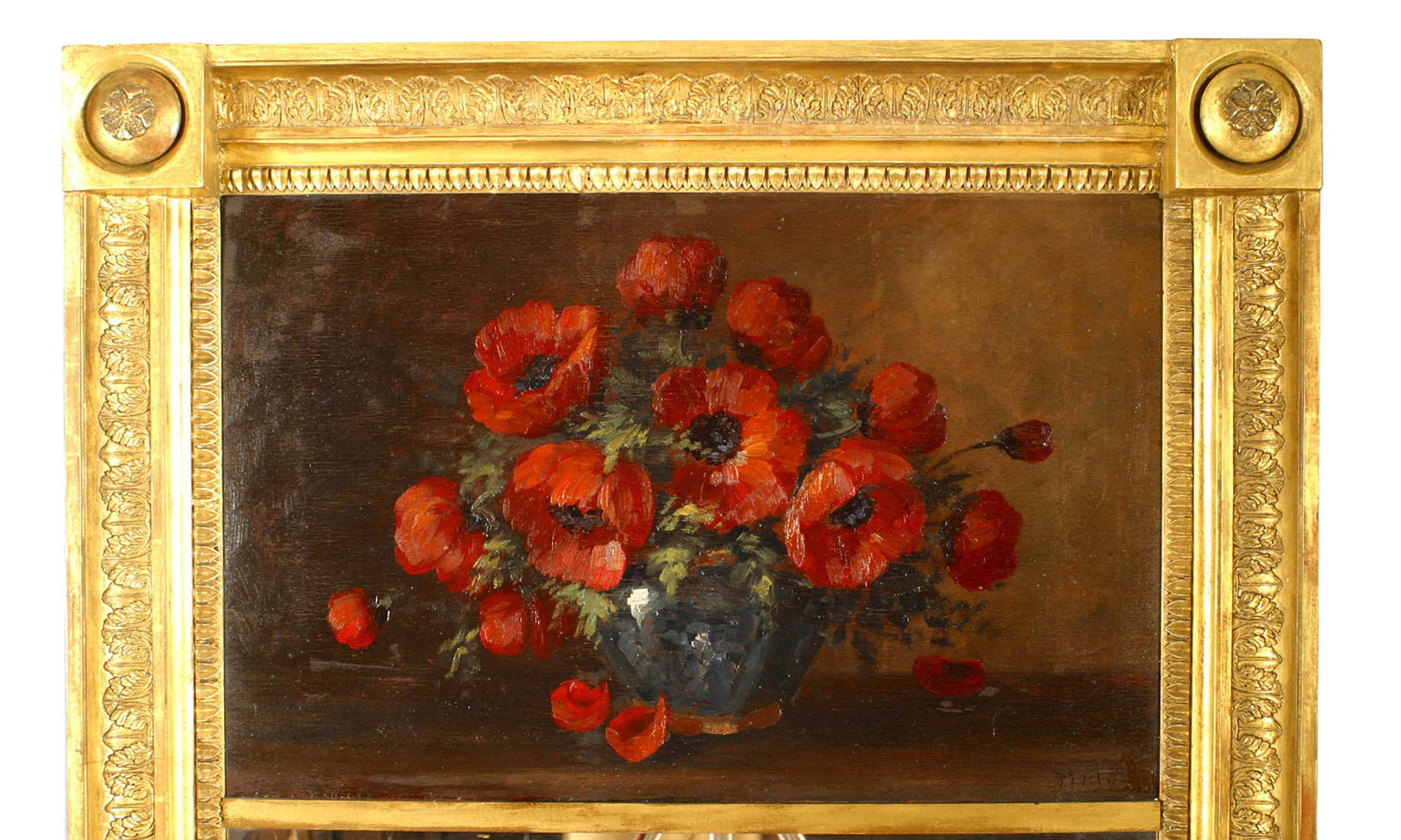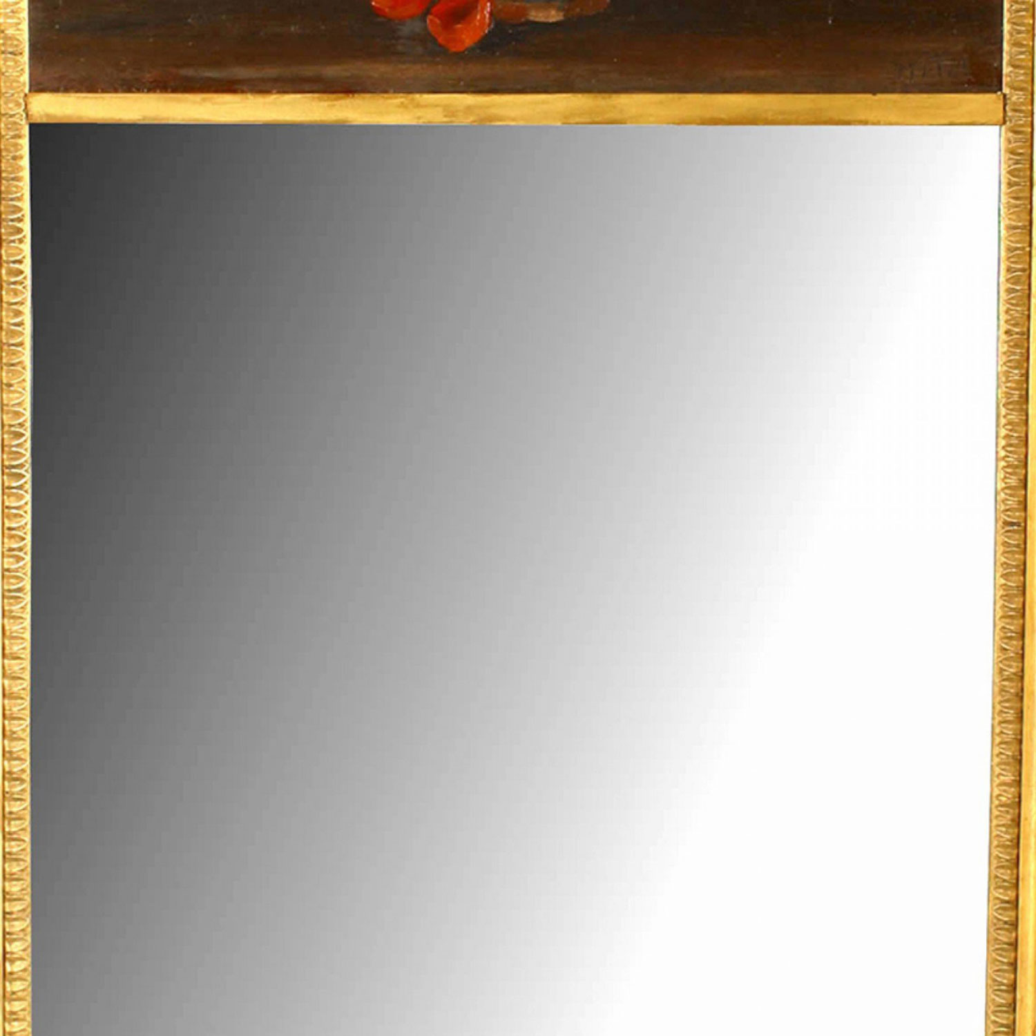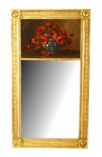 French Empire-style (19th Century) carved giltwood trumeau / wall mirror with painted upper panel of red poppies and flowers (signed)..