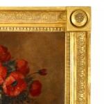 French Empire-style (19th Century) carved giltwood trumeau / wall mirror with painted upper panel of red poppies and flowers (signed).