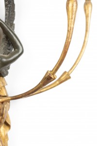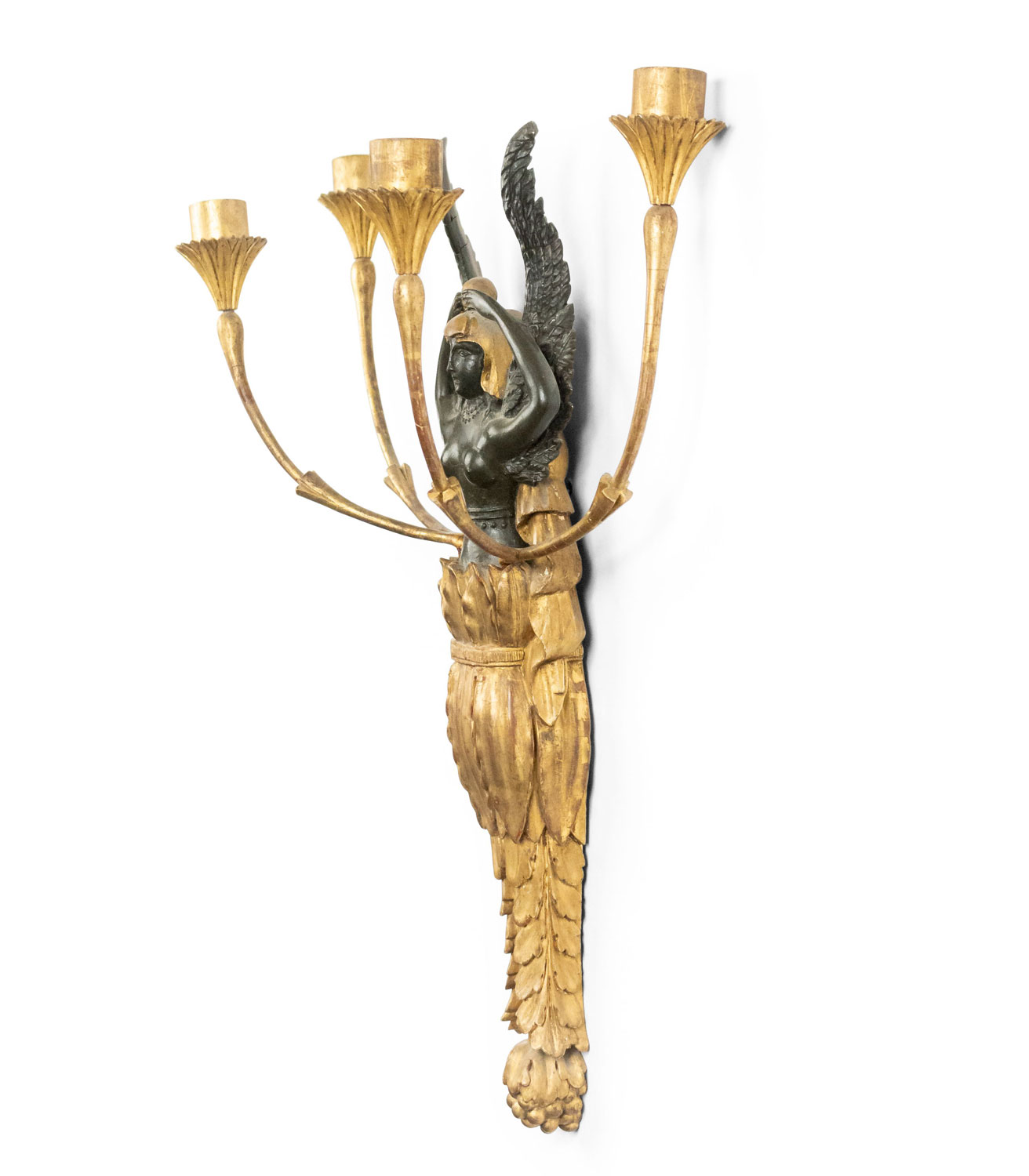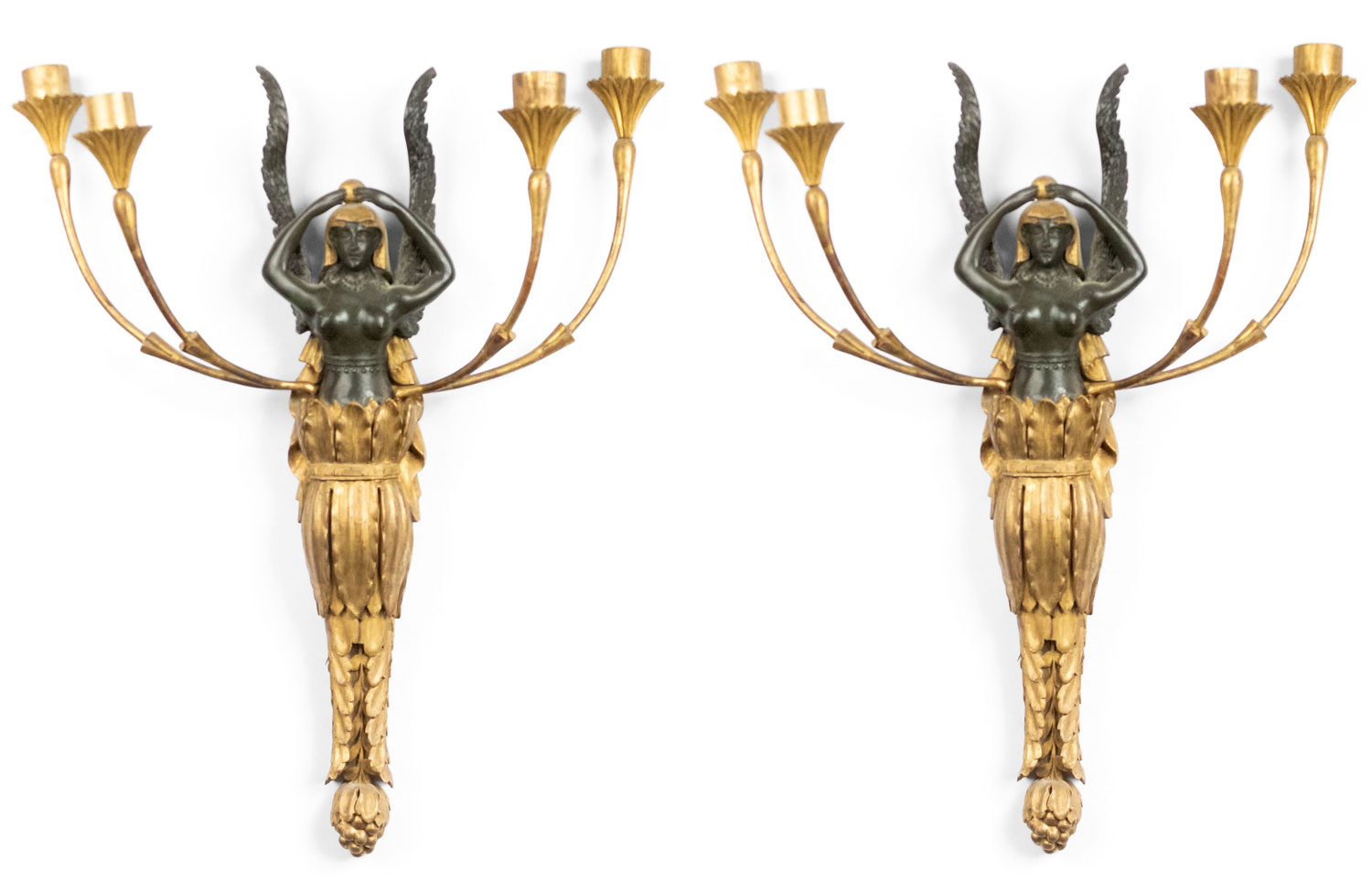 PAIR of French Empire-style (19th Century) giltwood and black lacquer wall sconces with four arms and figural winged ladies (PRICED AS PAIR)