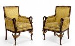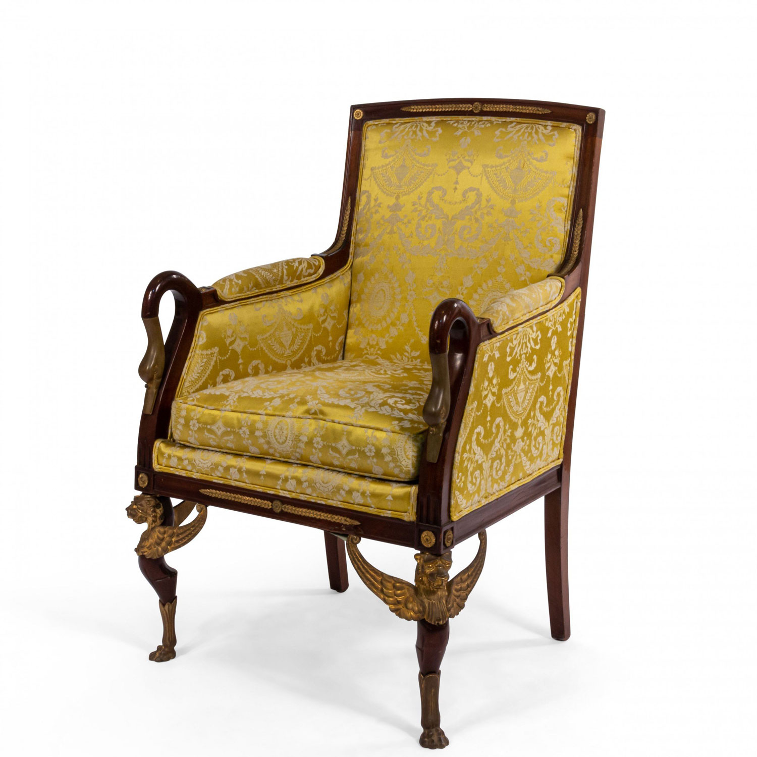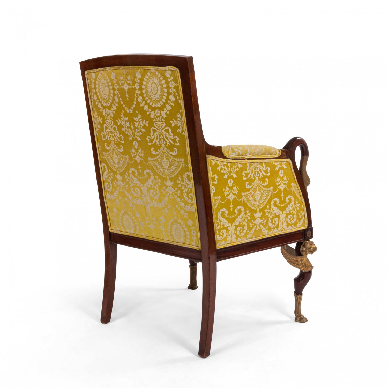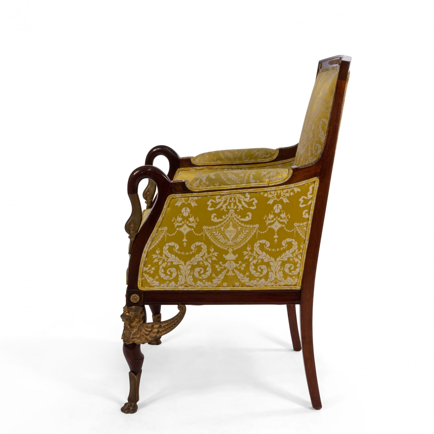 PAIR of French Empire-style (19th Century) mahogany swan design bergere Armchairs with bronze trim, griffin legs, and gold upholstery (PRICED AS PAIR)
