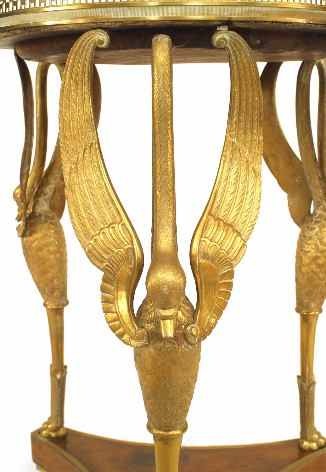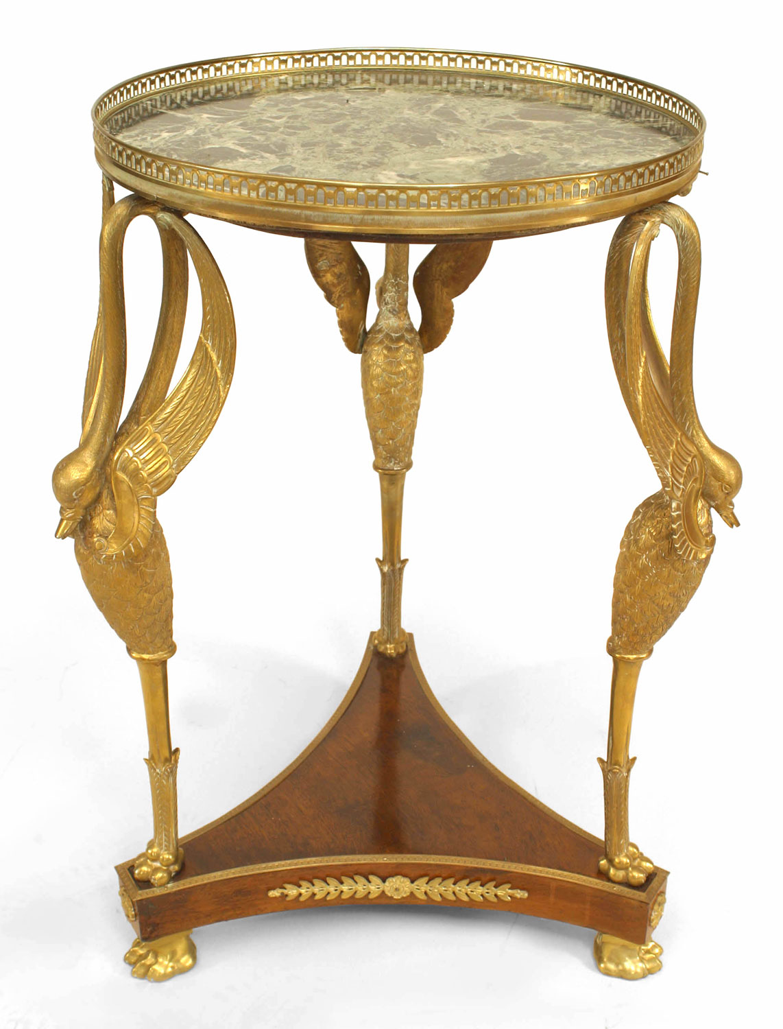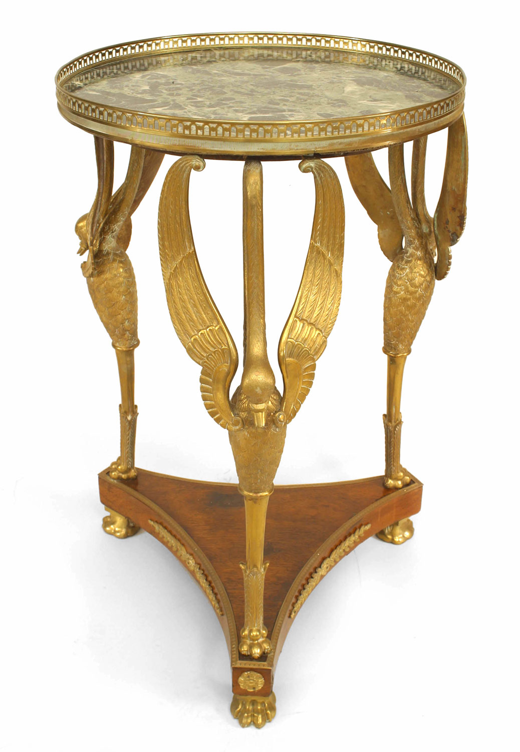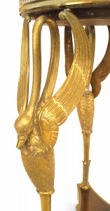 French Empire-style (19th Century) mahogany and bronze gueridon table on triple swan leg platform with stretcher, gallery, and green marble top.