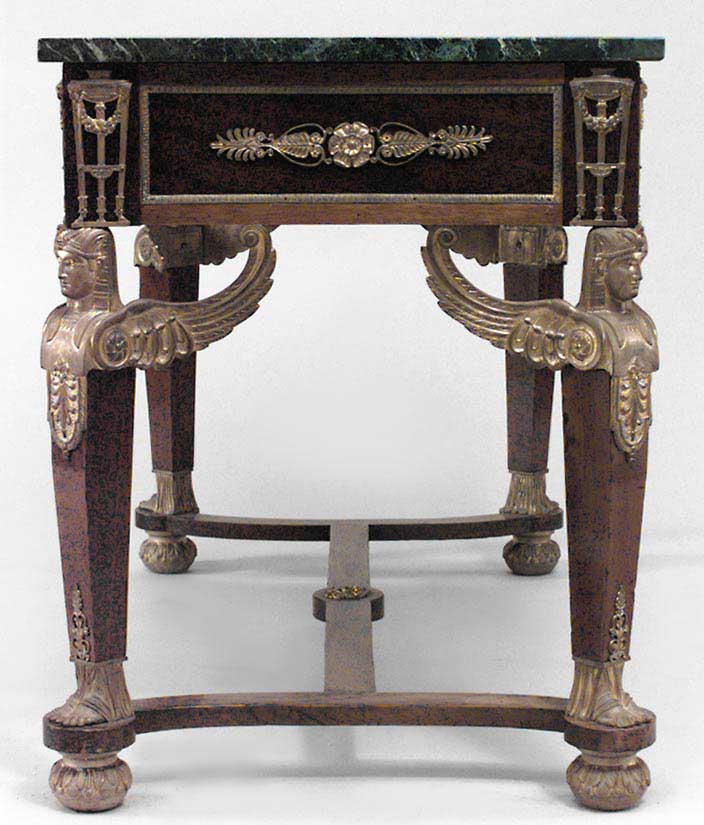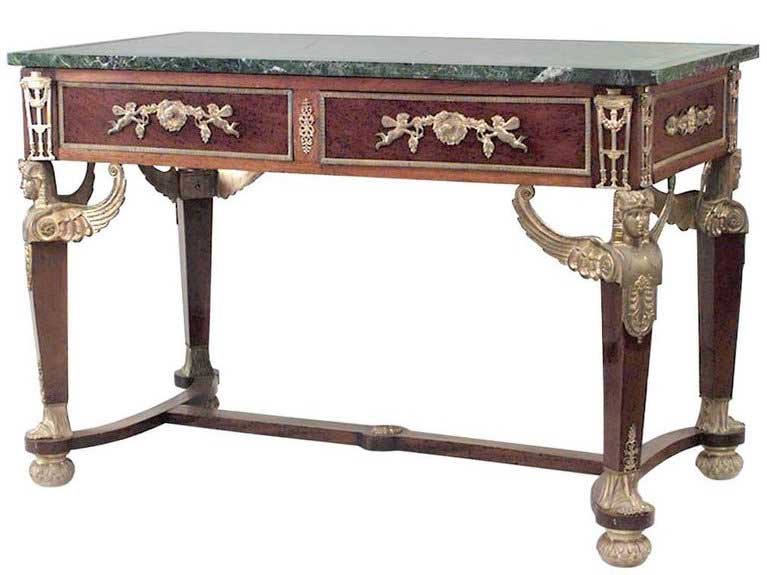 French Empire style (19th Century) mahogany and bronze trimmed 2 drawer table desk with stretcher, griffins, and green marble top.