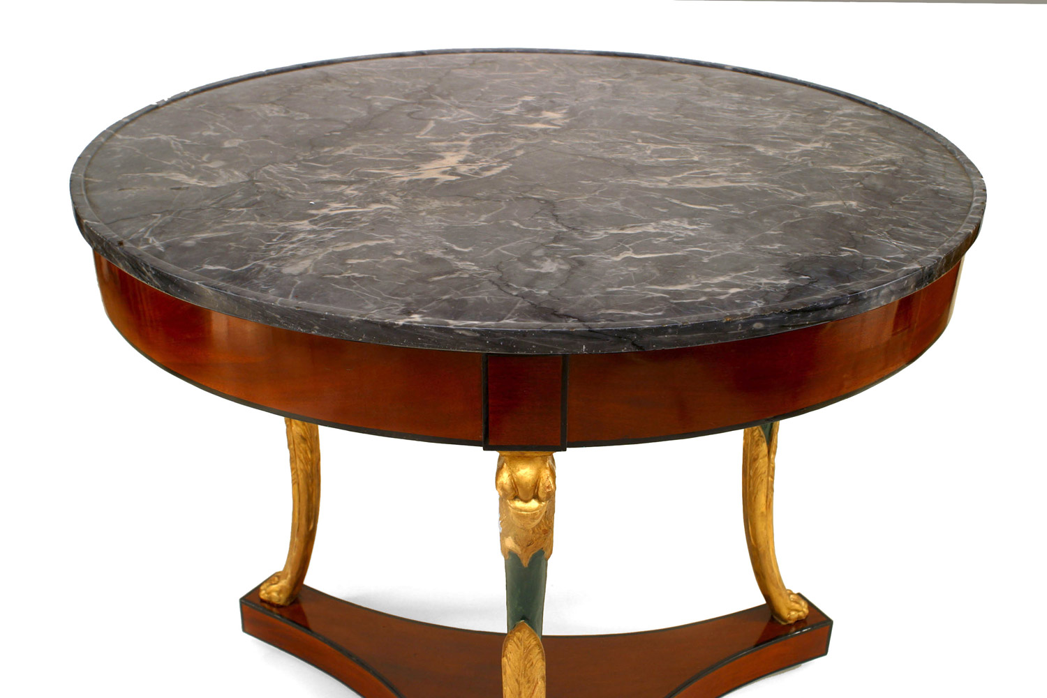 French Empire style (Circa 1825) mahogany and gilt round 3 legged center table on platform base with green lacquered bird heads and grey marble top..
