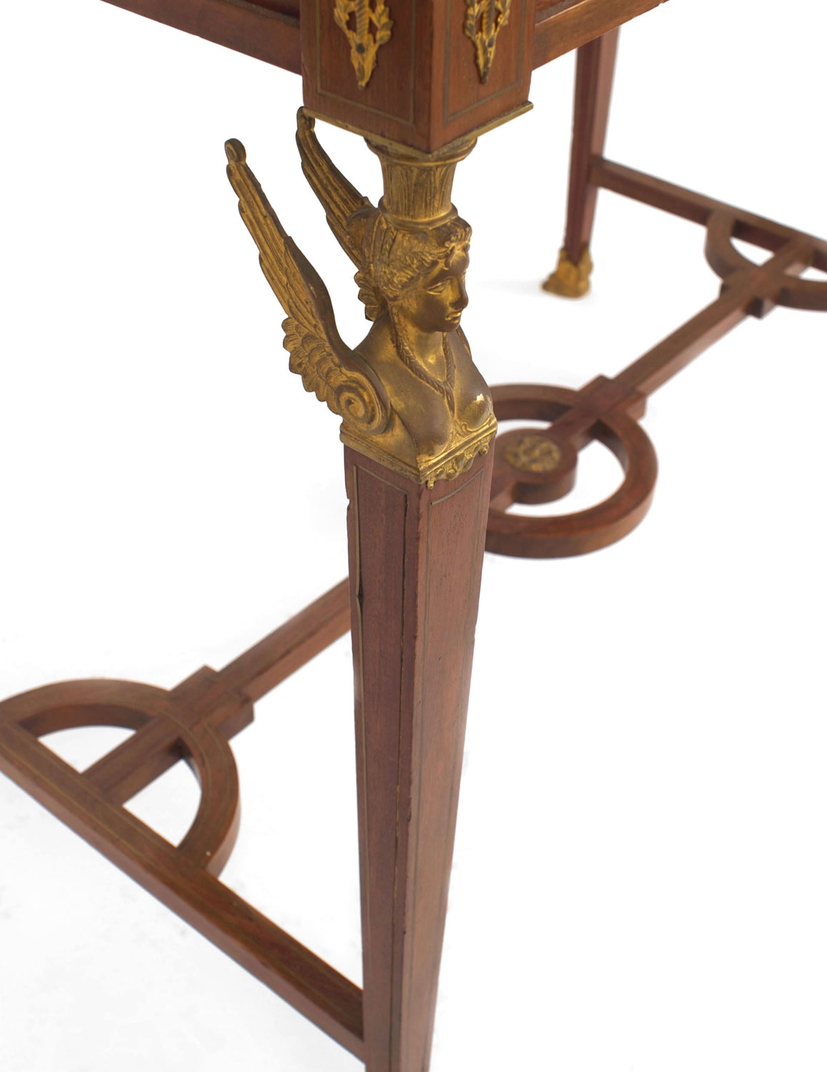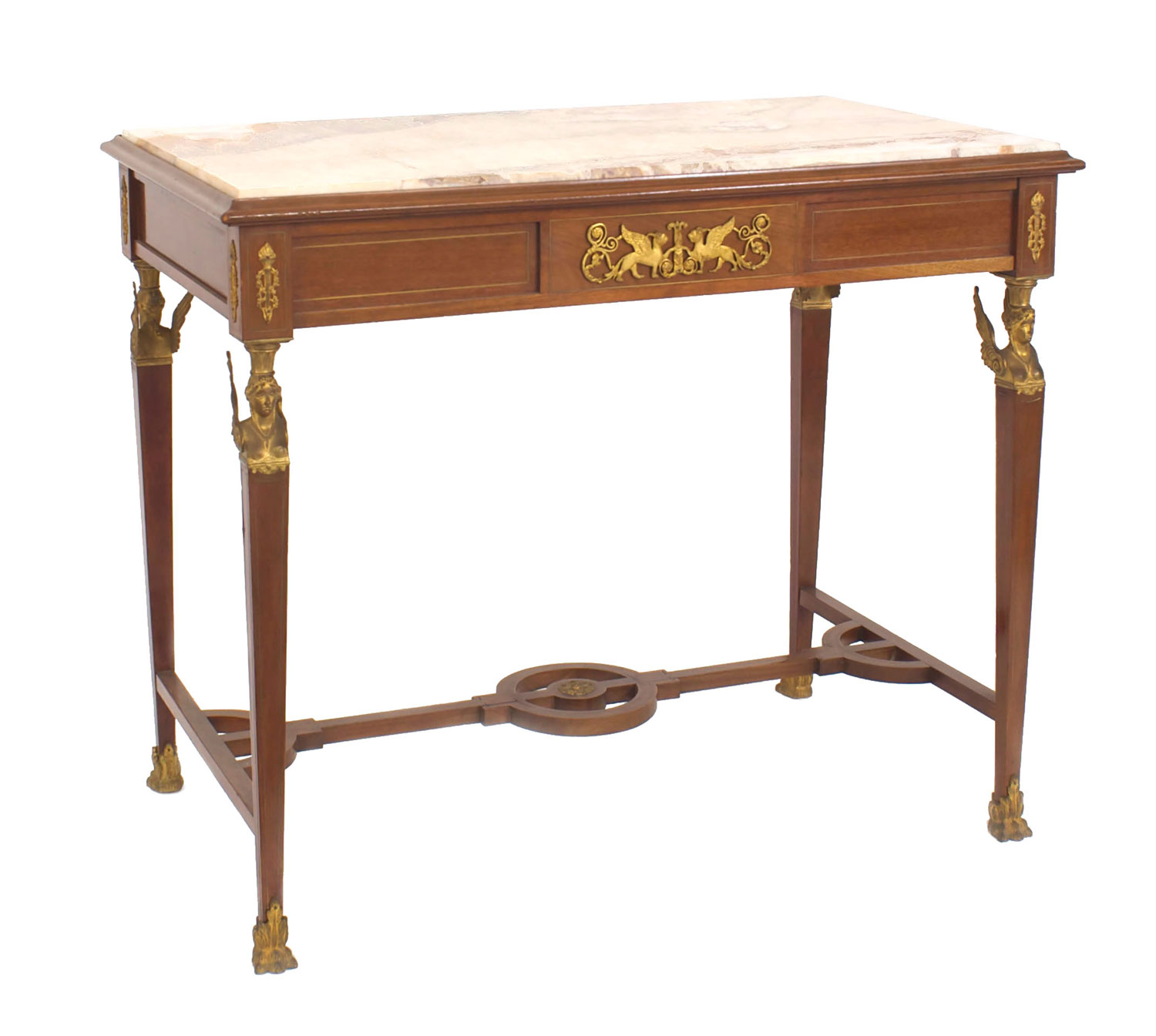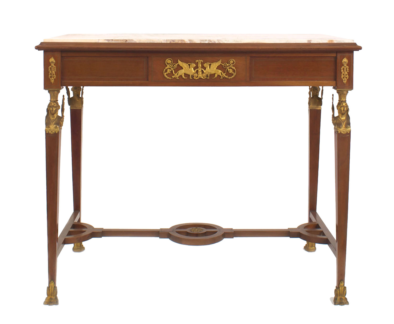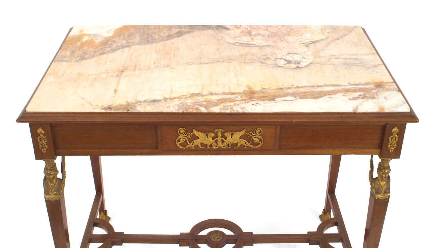French Empire style (19th Century) mahogany and bronze trimmed rectangular center table with winged females, open stretcher, and onyx top.