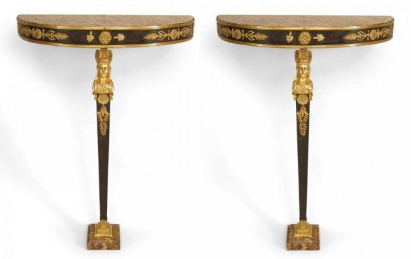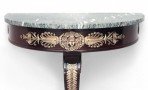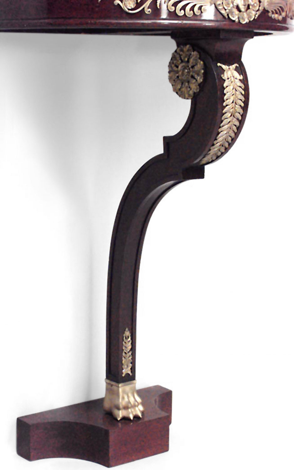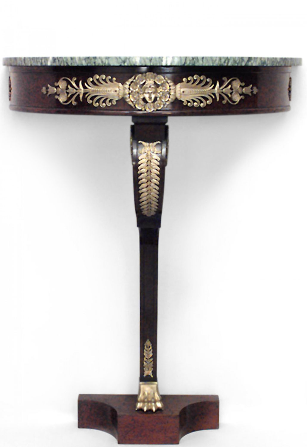 French Empire-style (19th Century) mahogany half round bracket console table with bronze dore trim and green marble top