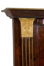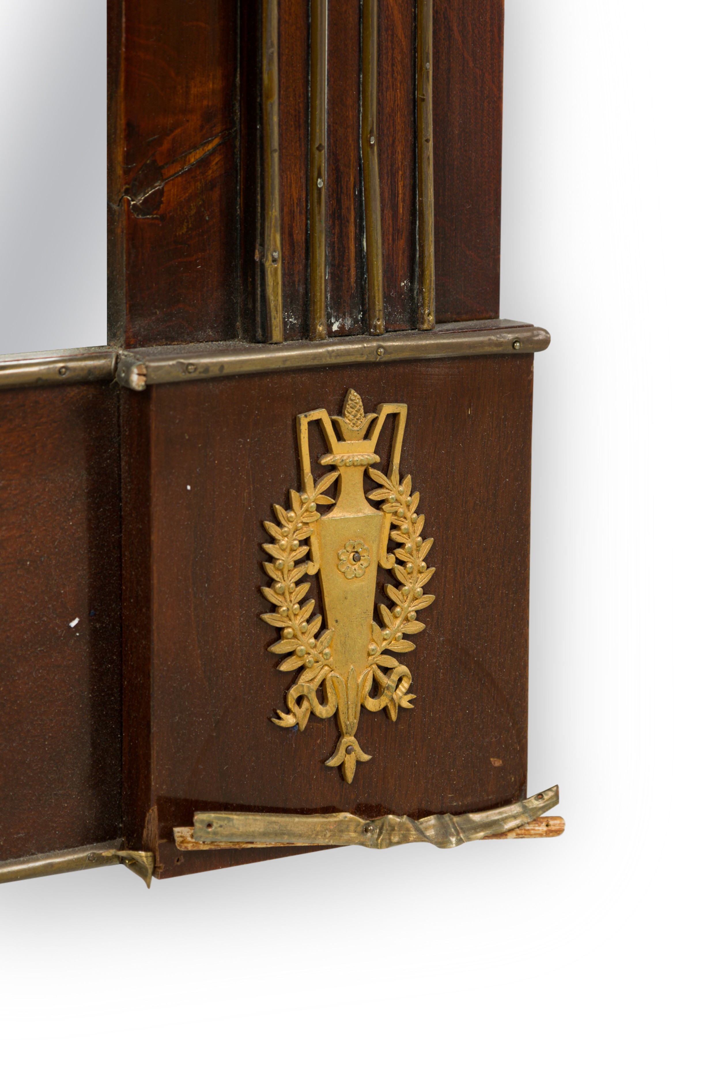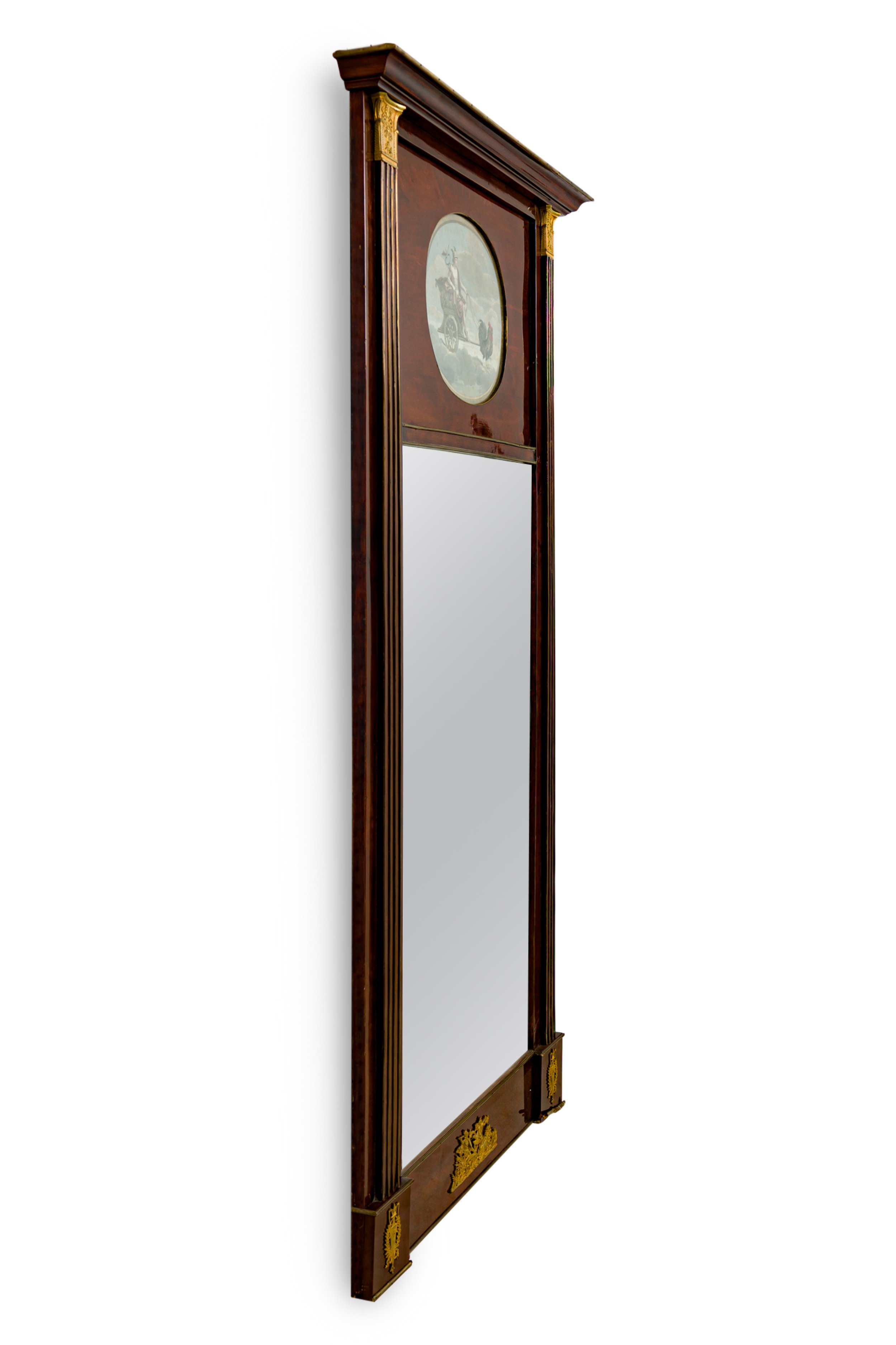 French Empire (1st quarter 19th Century) mahogany vertical wall mirror with gilt bronze trim and fluted column sides have a top section with a small oval painting of Hermes on a chariot with two roosters