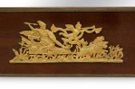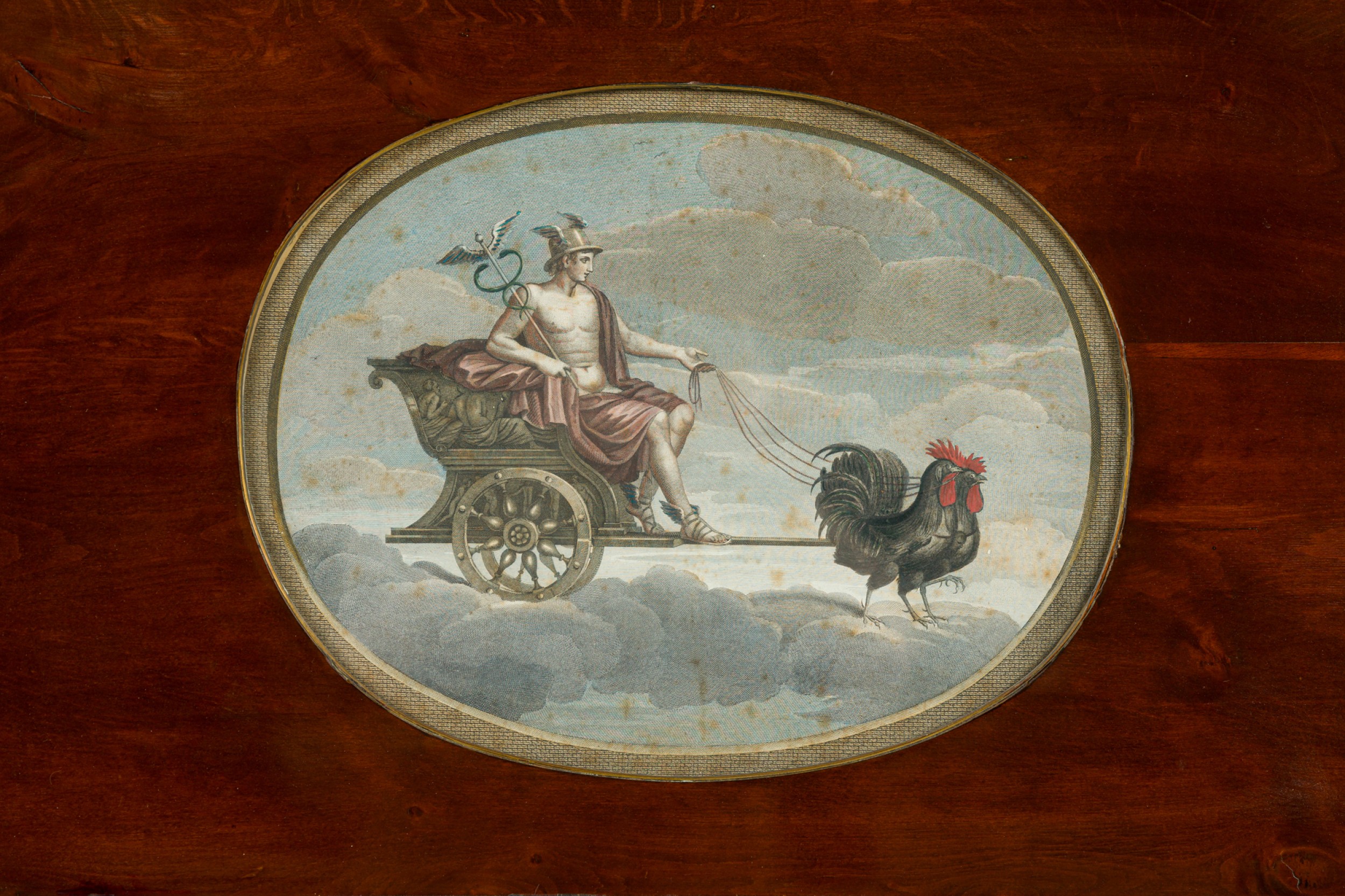 French Empire (1st quarter 19th Century) mahogany vertical wall mirror with gilt bronze trim and fluted column sides have a top section with a small oval painting of Hermes on a chariot with two roosters.