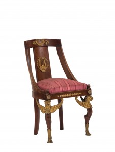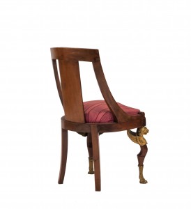 French Empire style (19th Cent) mahogany sleigh back side chair with bronze griffin legs and trim and red seat.