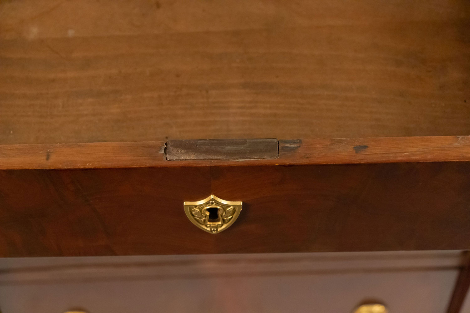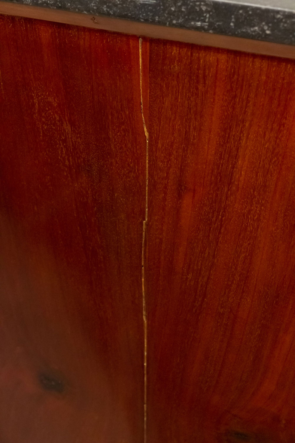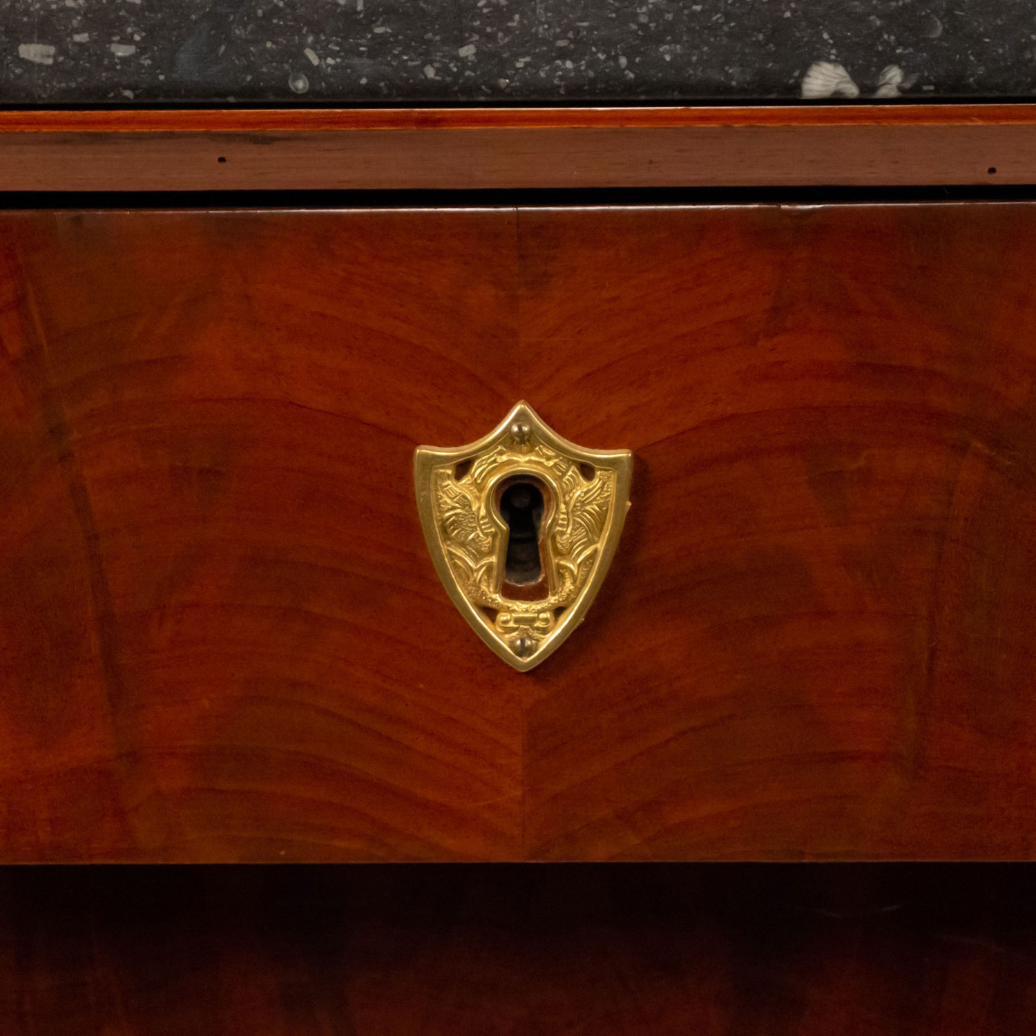 Style: French Materials & Techniques: Marble, bronze, mahogany Category: Cabinets & Case Goods, Bedroom Condition: There are splits in the wood at the side of the piece.