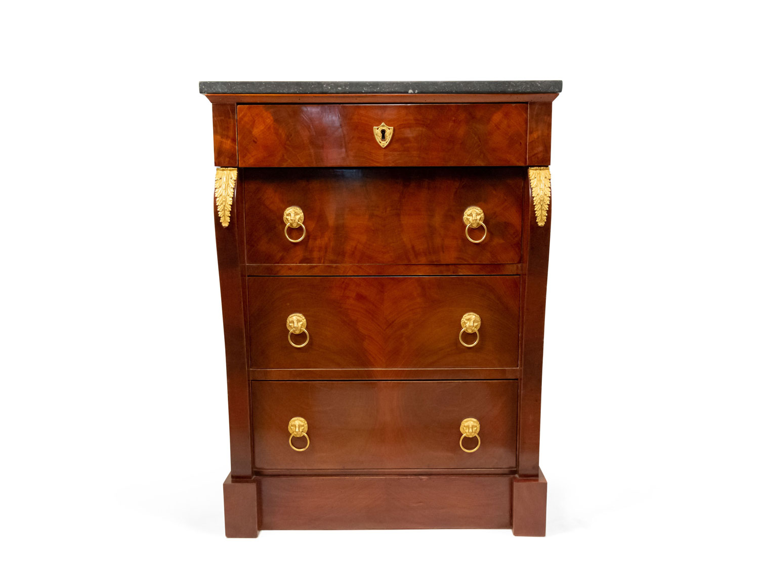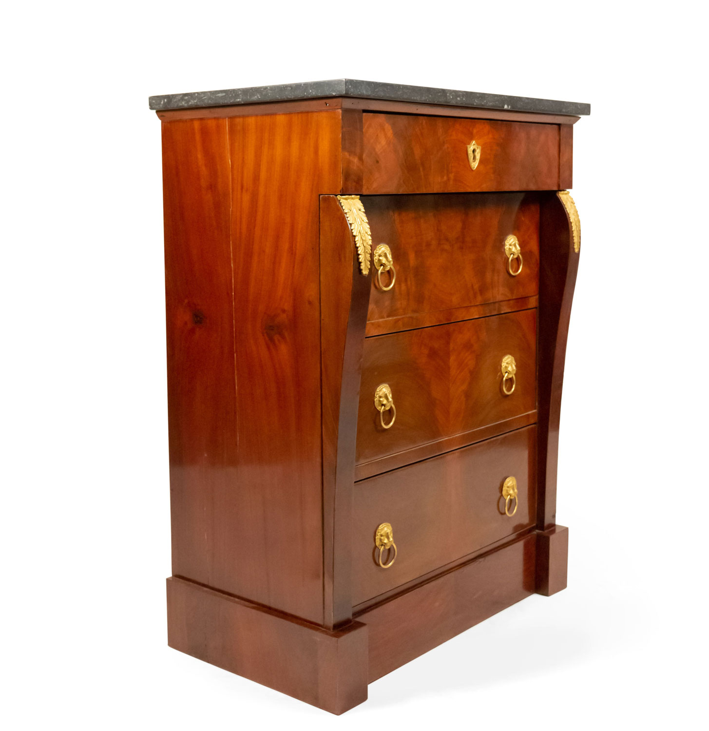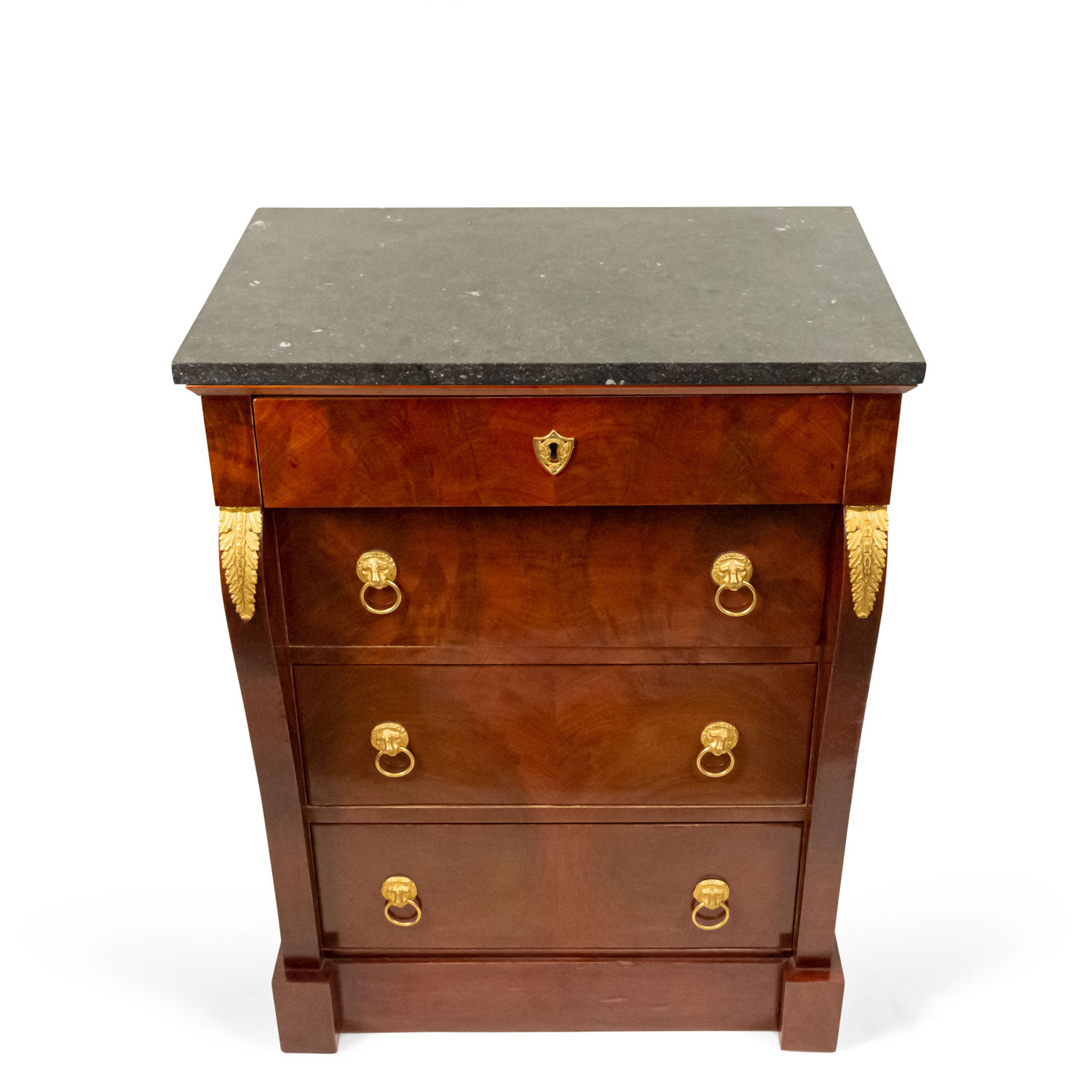 French Empire style (late 19th Century) mahogany small chest with 4 drawers and bronze trim with a black marble top.