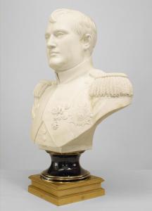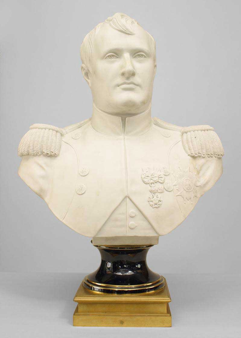 French Empire style (late 19th Century) life size Parian bust of Napoleon on blue porcelain socle and square ormolu base (signed HOUDON, 1805).
