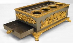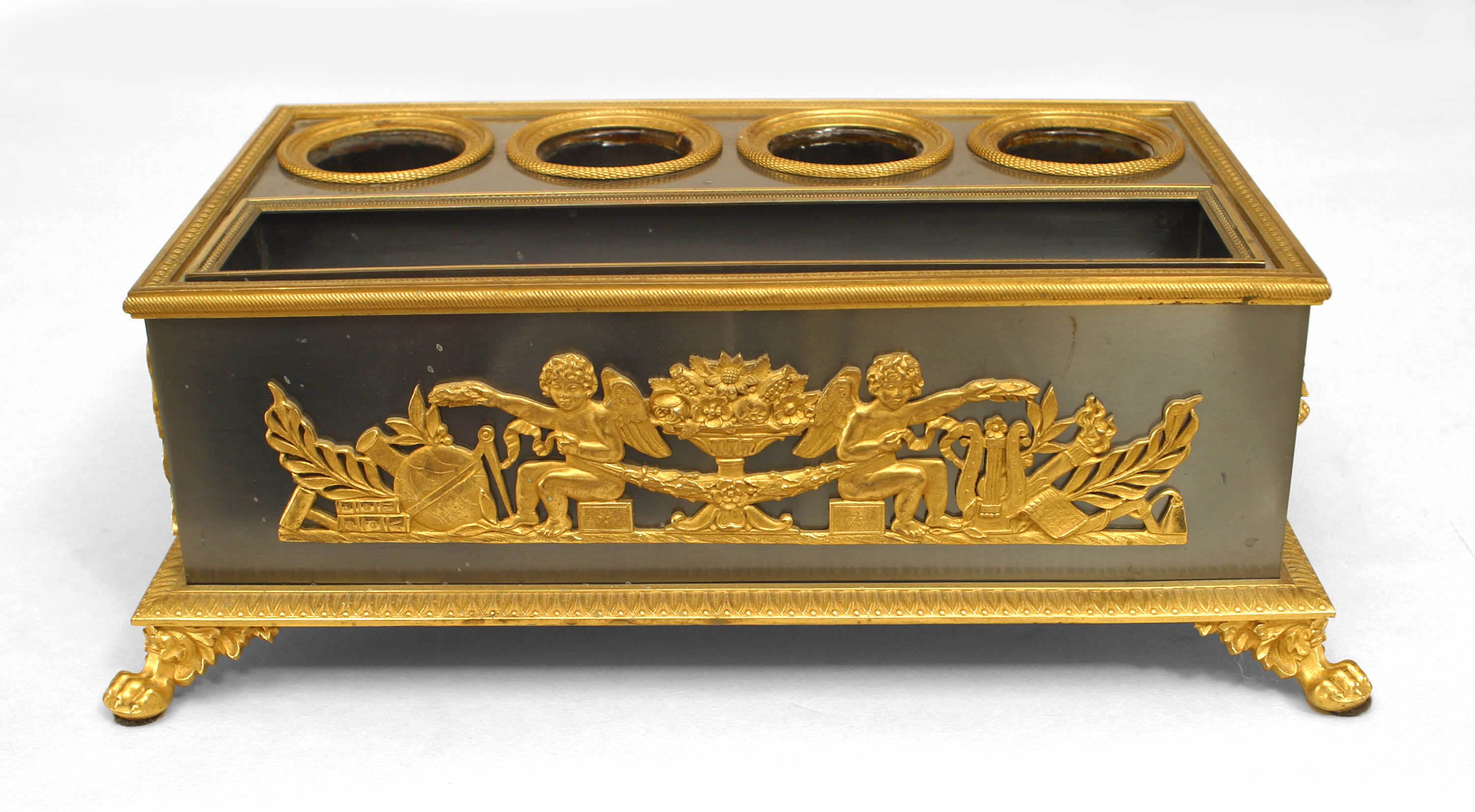 French Empire (19th Century) steel inkwell with gilt bronze trim with four original glass inserts and a side drawer.