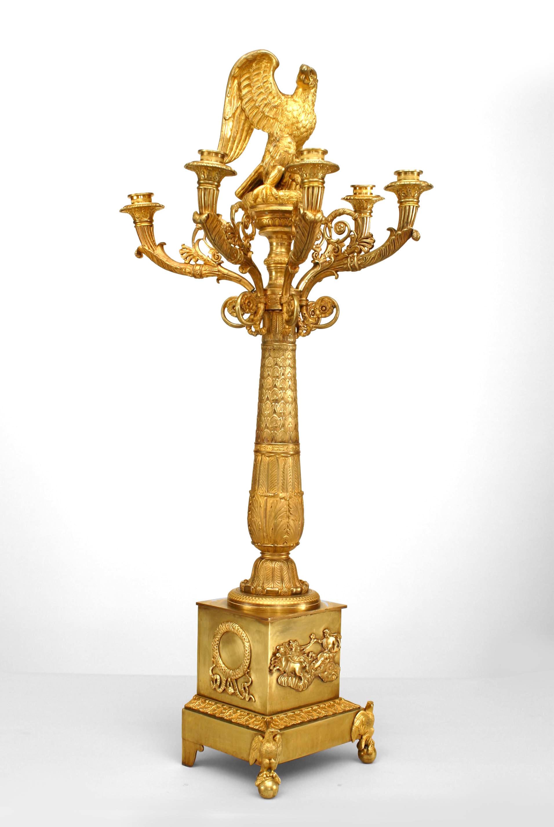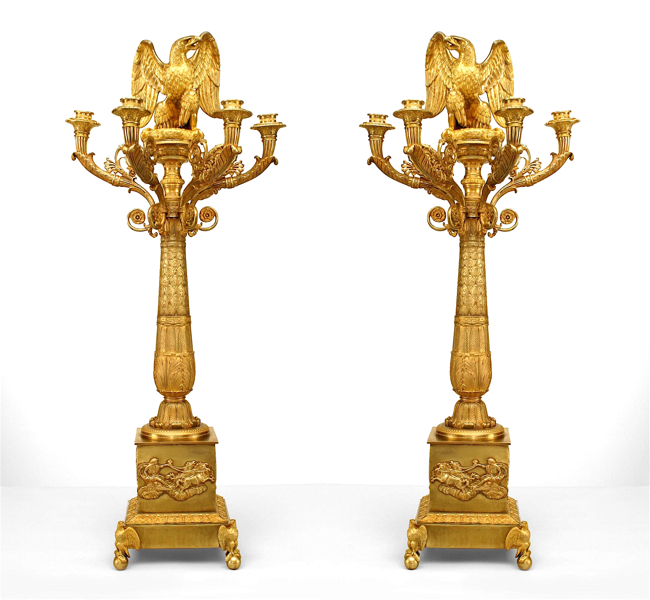 PAIR of French Empire-style (19th Century) bronze dore 5 arm candelabras with eagle tops and legs. (PRICED AS PAIR).