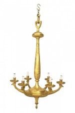 French Empire-style (19th Century) bronze dore chandelier having 6 arms with eagle heads emanating from a 6 sided tapered center post with a bottom acorn finial.