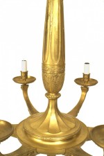 French Empire-style (19th Century) bronze dore chandelier having 6 arms with eagle heads emanating from a 6 sided tapered center post with a bottom acorn finial..