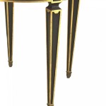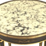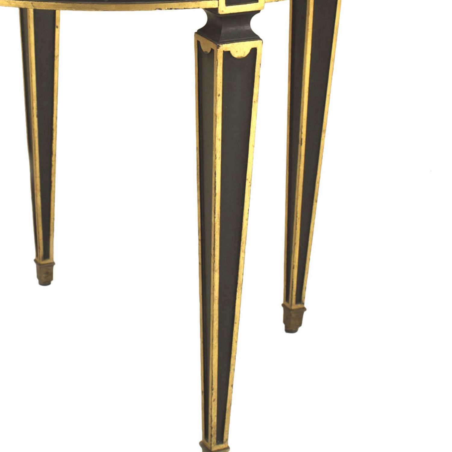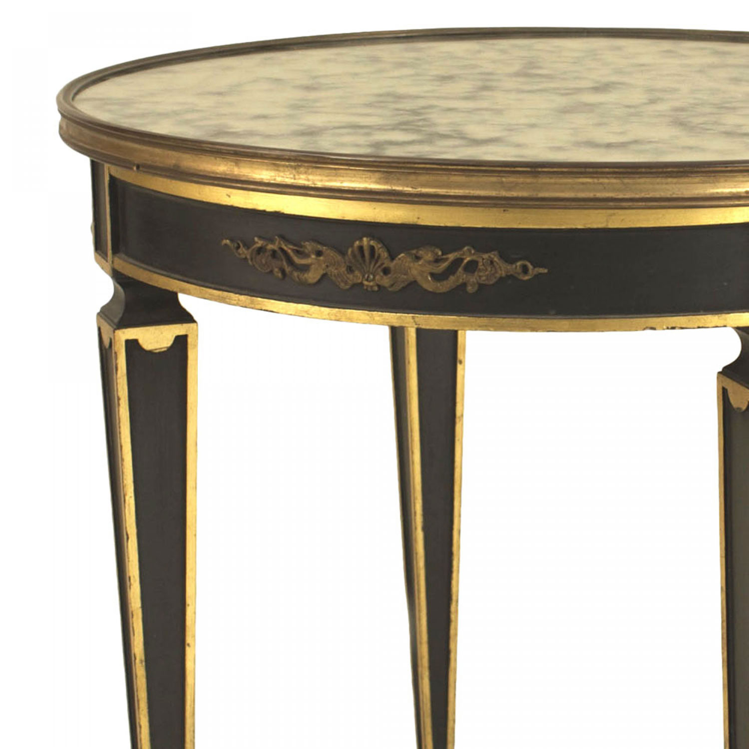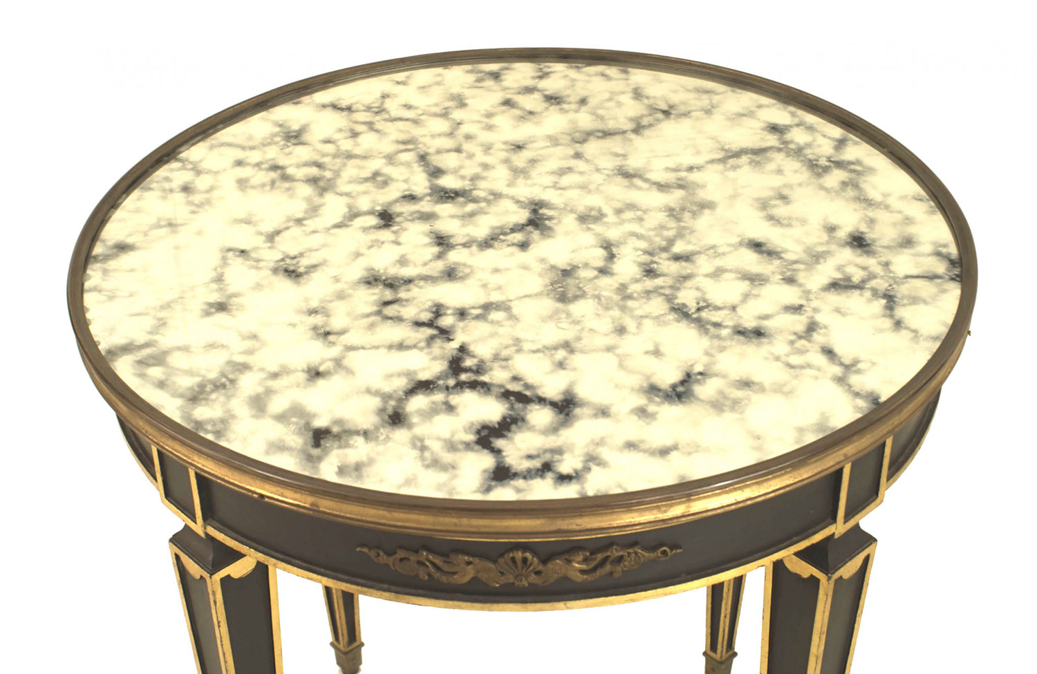 French Empire-Style (1940s) ebonized and gilt trim round end table with bronze trim on apron and a top rim surrounding a mottled mirrored round top. (Attributed to MAISON JANSEN).