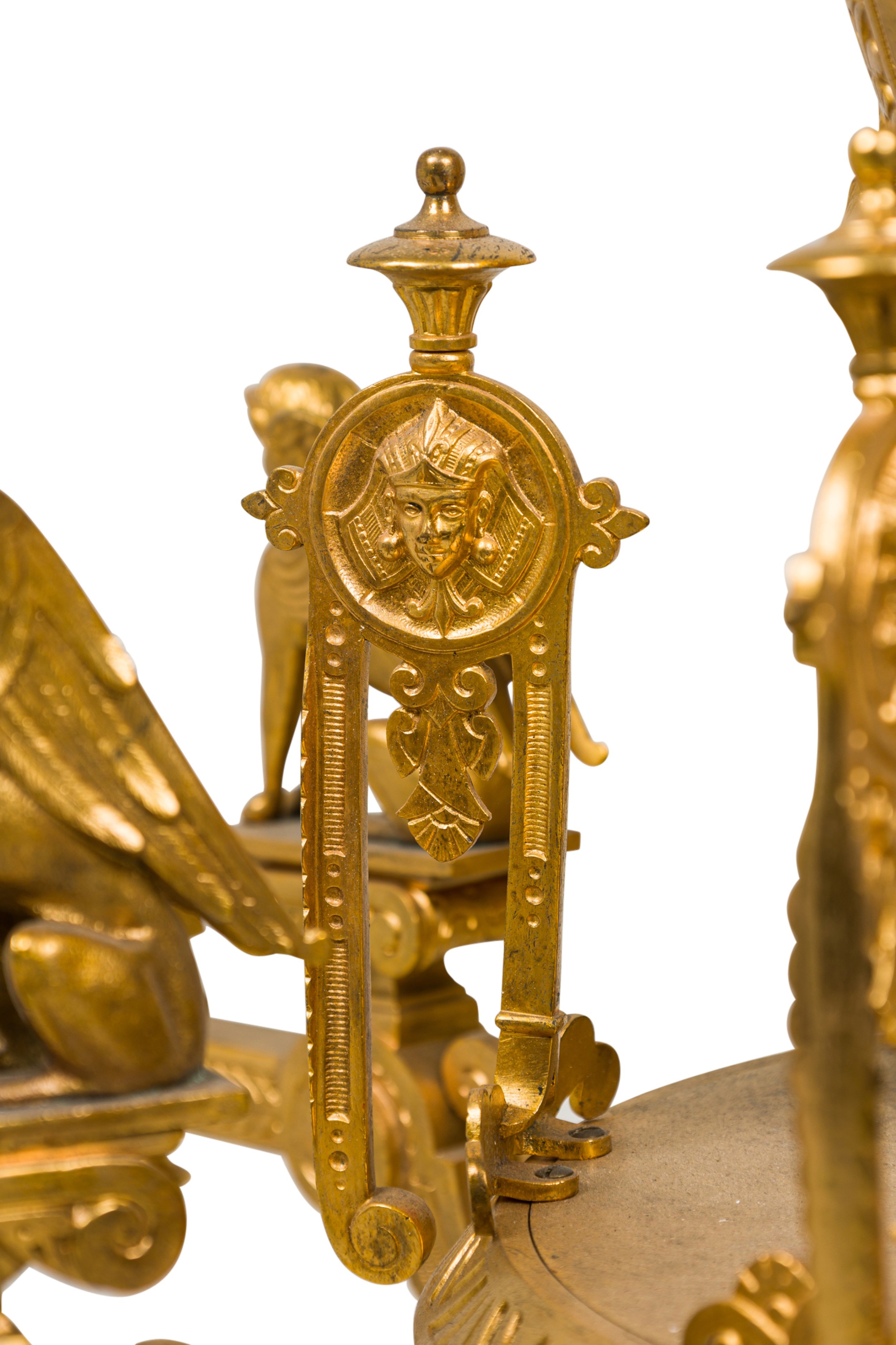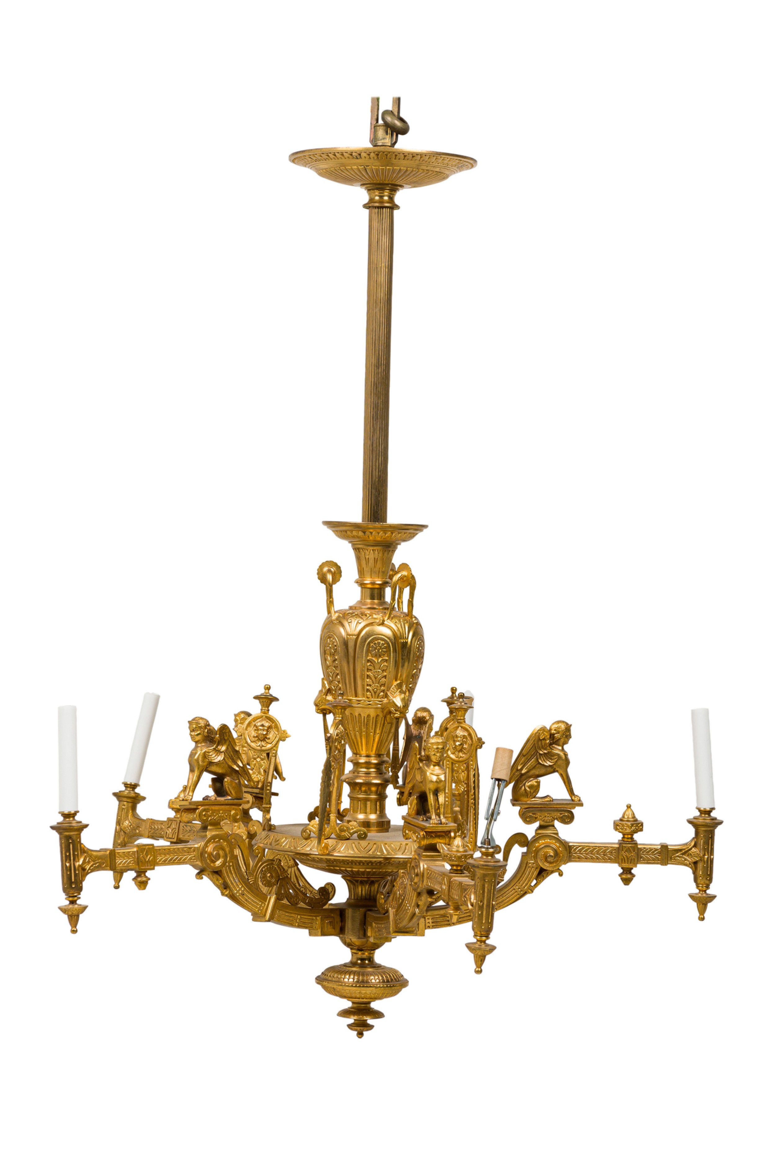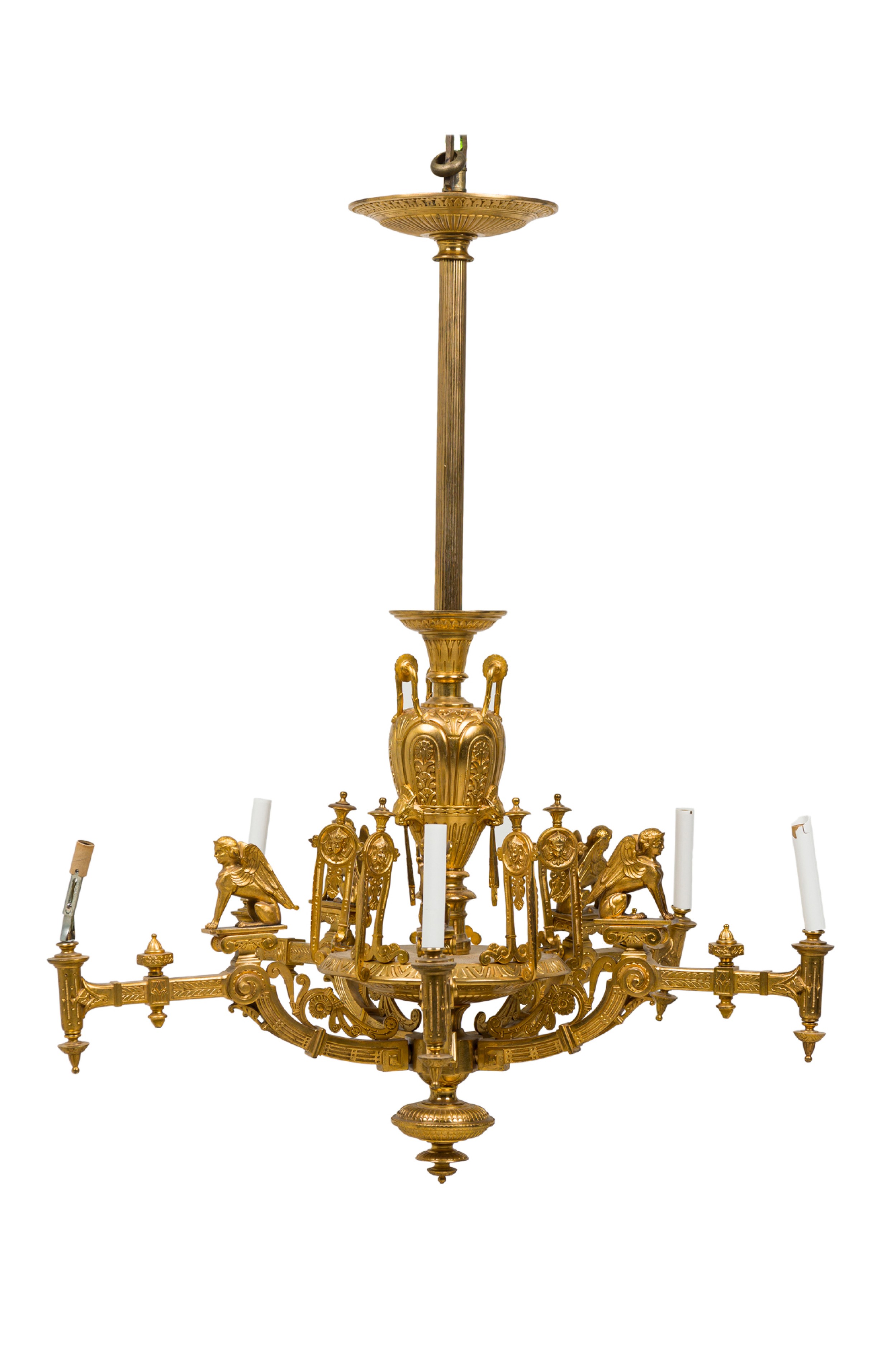 French Empire Style (1880) gilt bronze chandelier in Neo-classic form having a center post with an urn form surrounded by 5-arms having sphinx figures and a finial bottom.