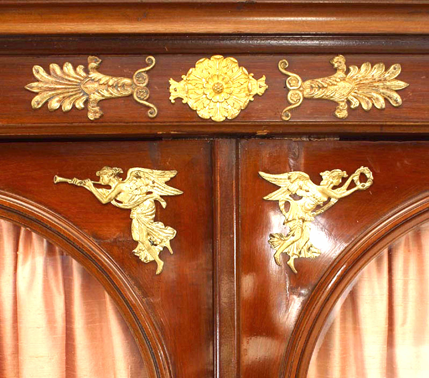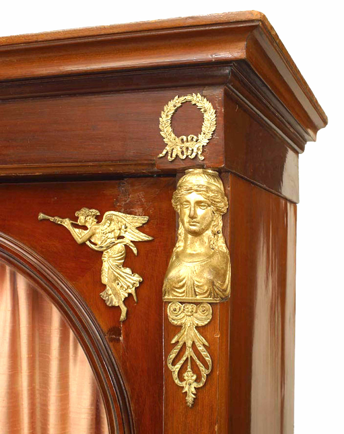 French Empire-style (19th Century) mahogany bookcase cabinet with bronze trim and 2 glass doors..