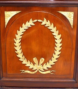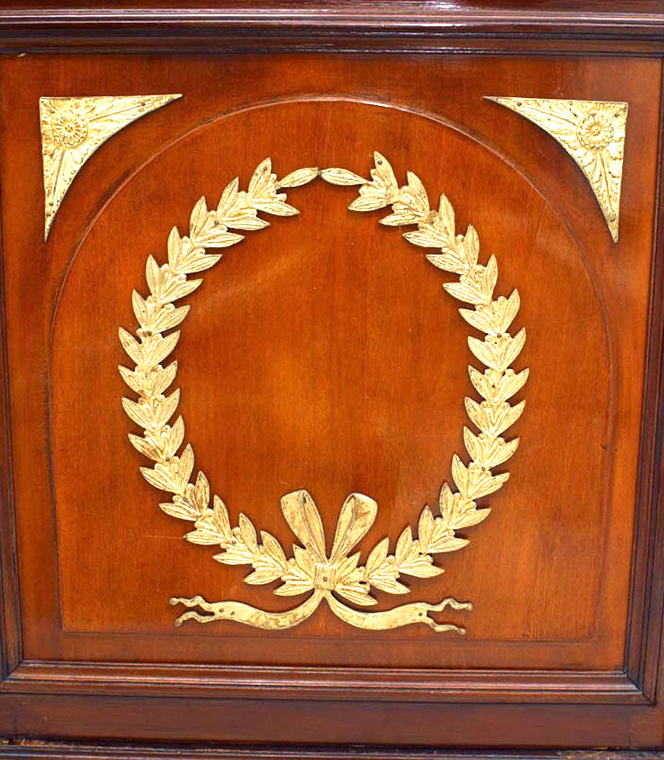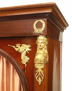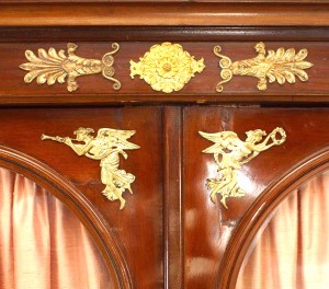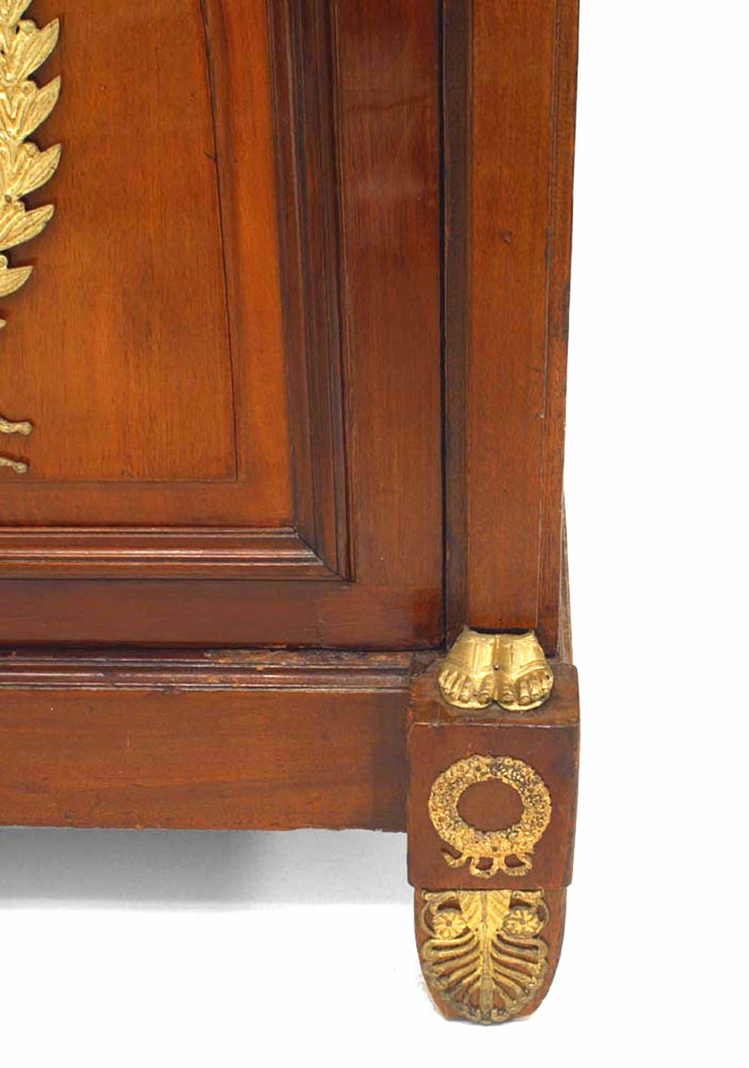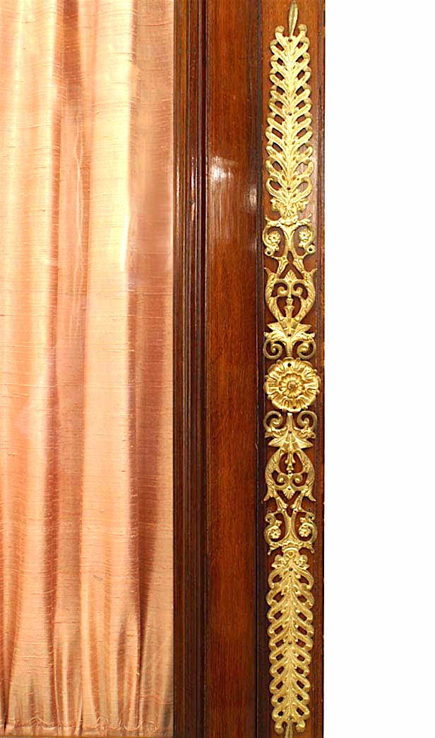 French Empire-style (19th Century) mahogany bookcase cabinet with bronze trim and 2 glass doors.