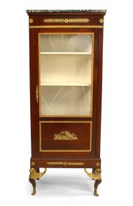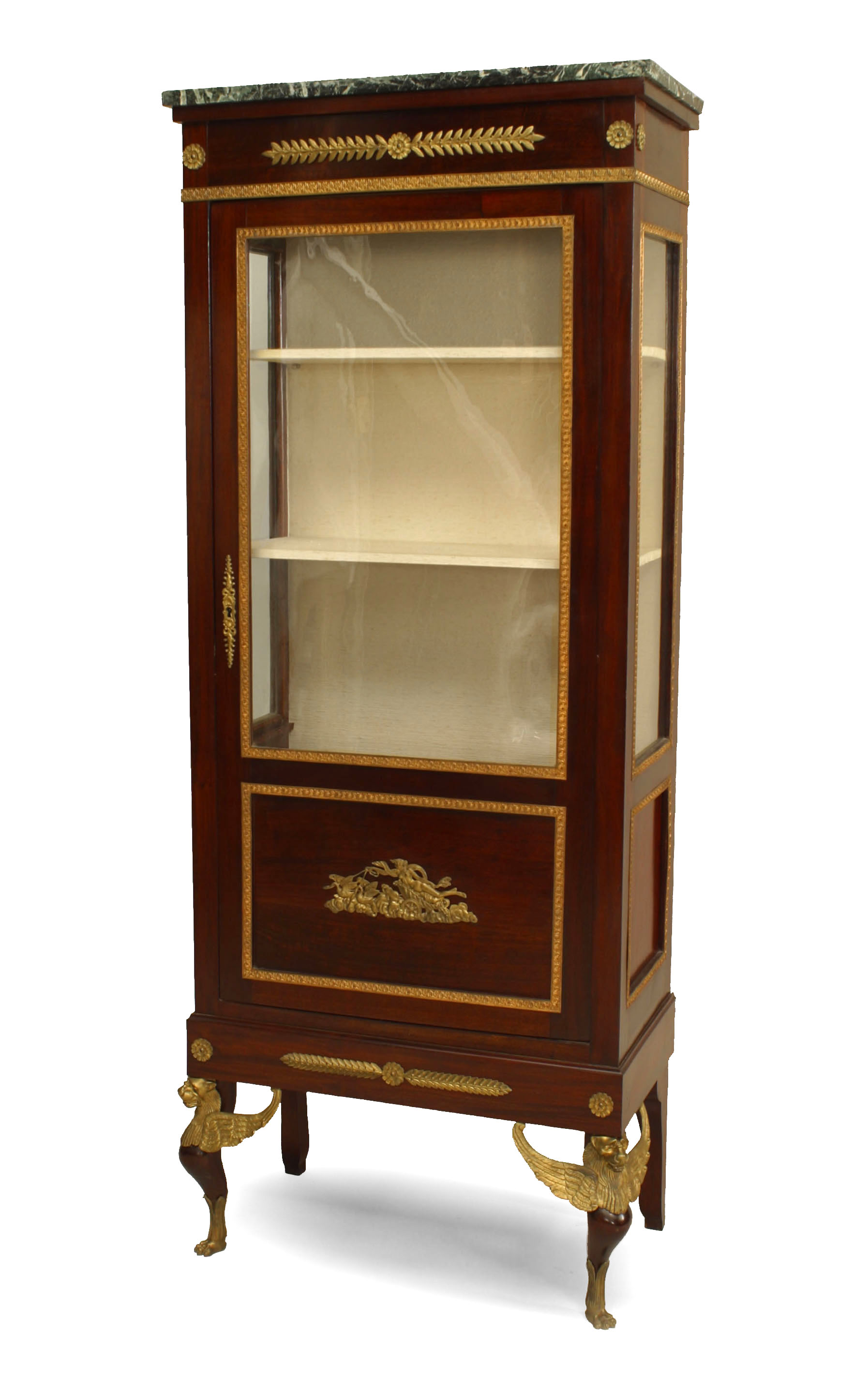 French Empire-style (19th Century) mahogany single door display/vitrine cabinet with gilt bronze trim and front sphinx form legs.