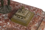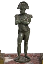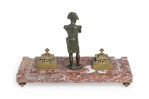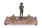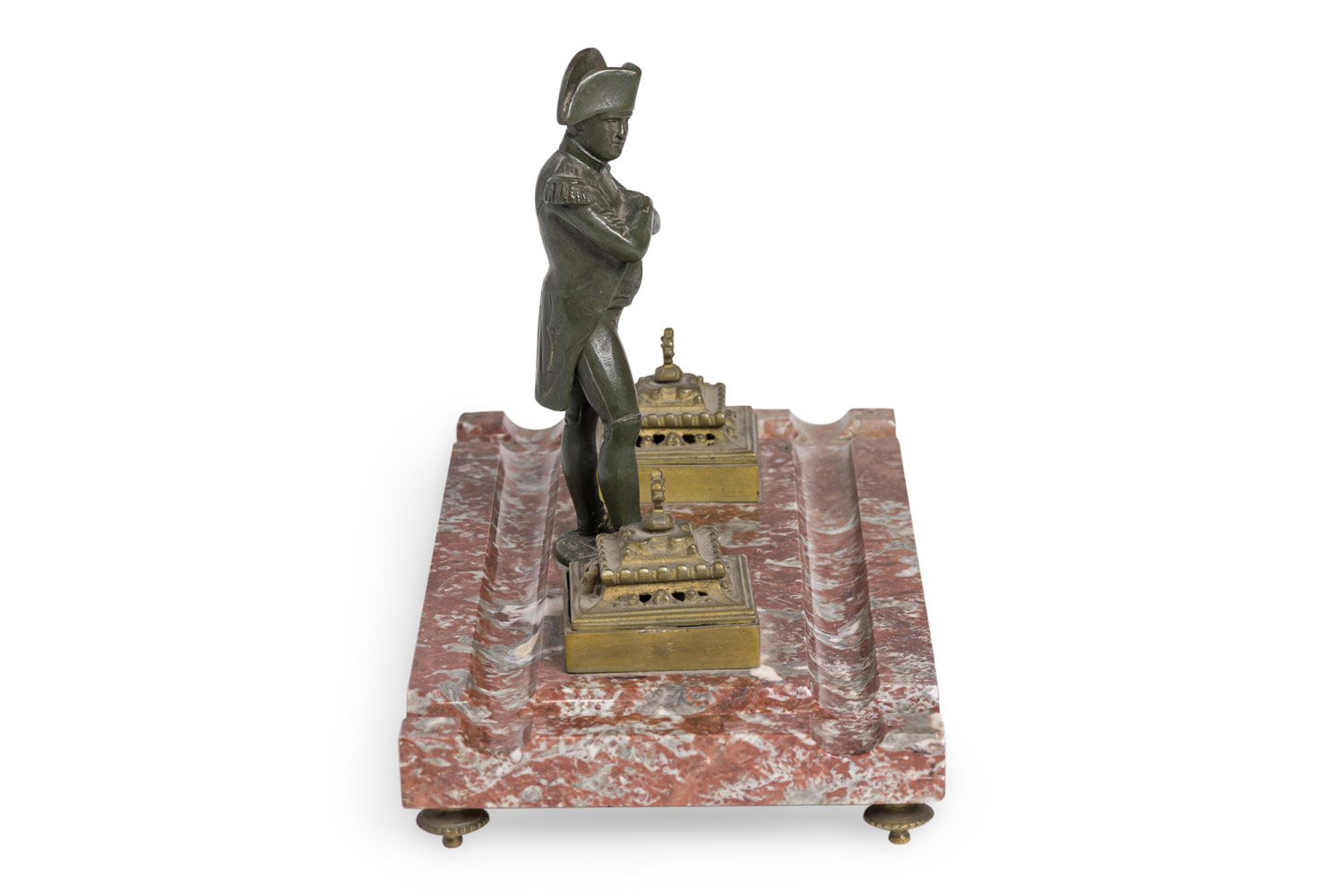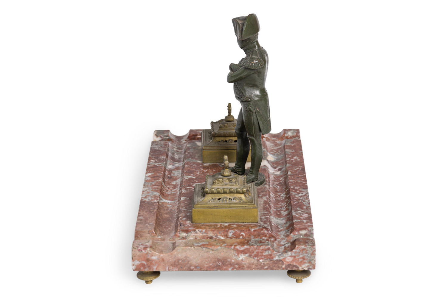 French Empire-style (19th Century) marble base rectangular inkwell with 2 bronze wells and standing figure of Napoleon. (signed)
