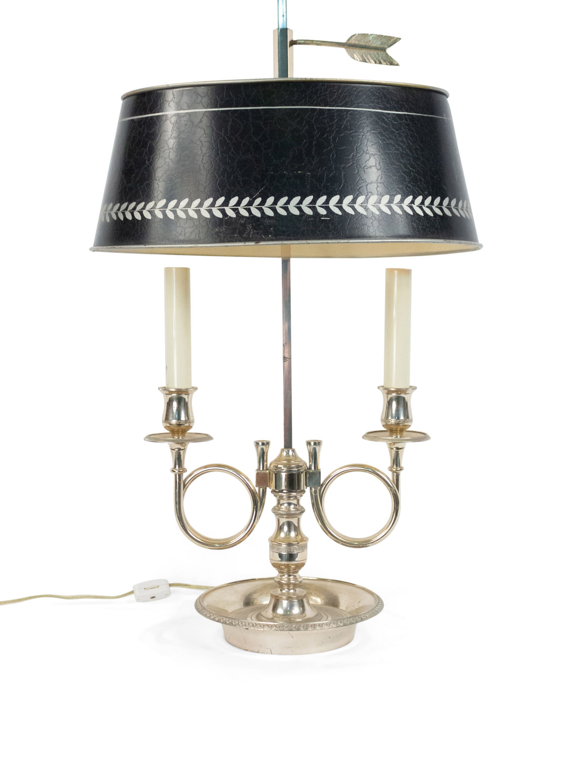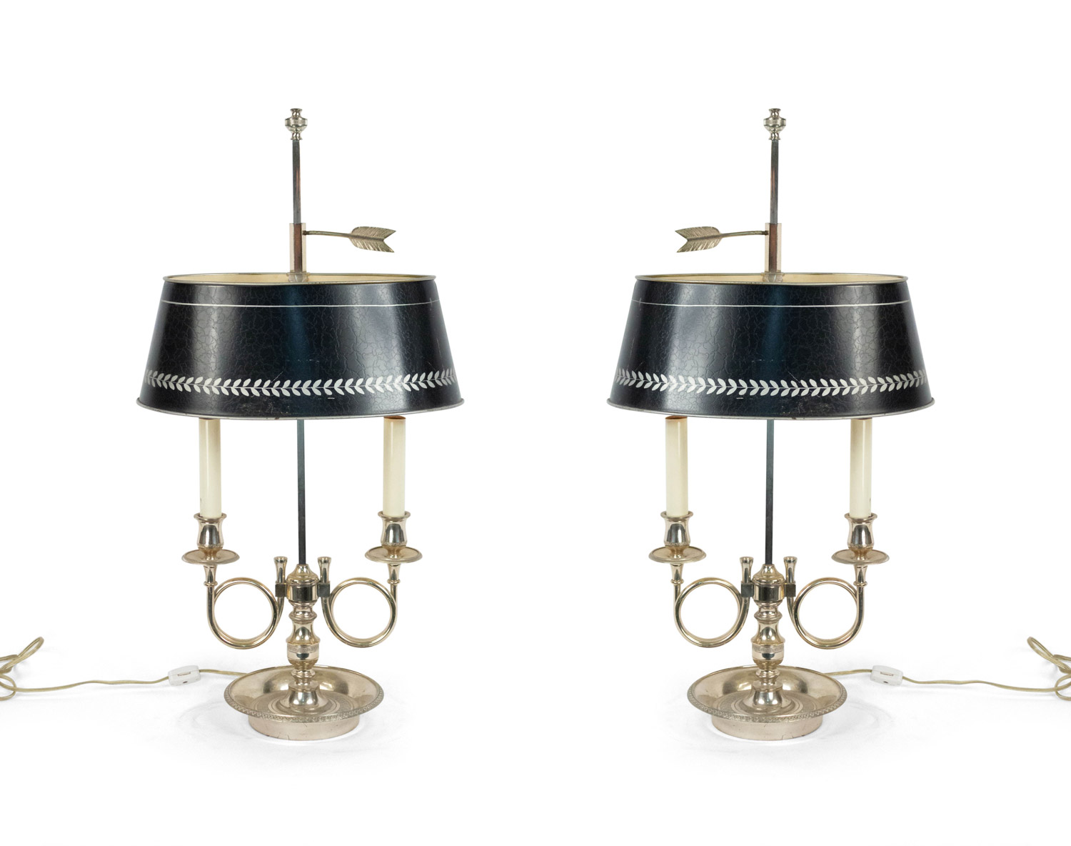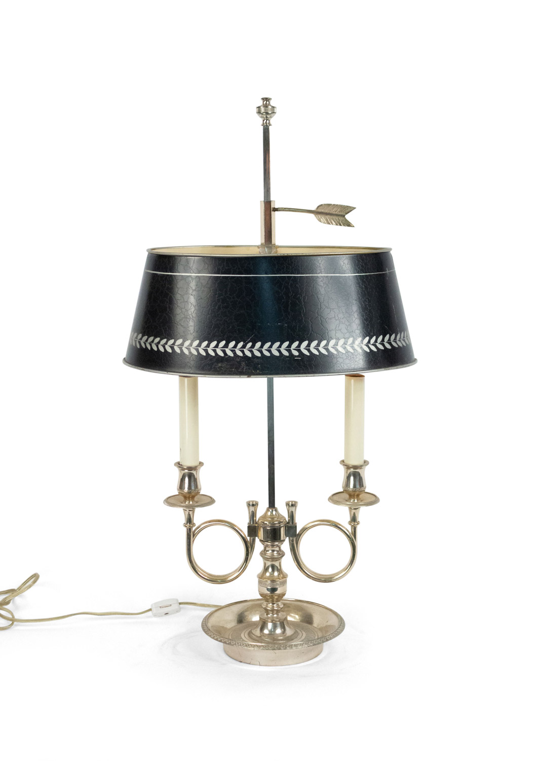 PAIR of French Empire style (20th Century) silver plate 2 arm bouillotte /desk table lamp with oval tole decorated shade and horn motif (PRICED AS PAIR).