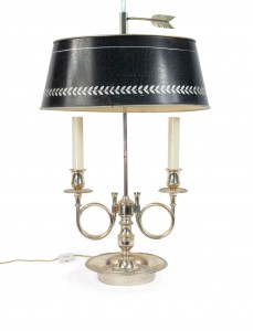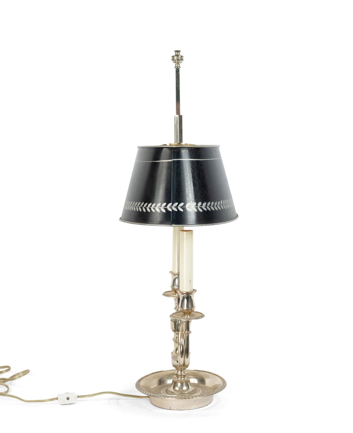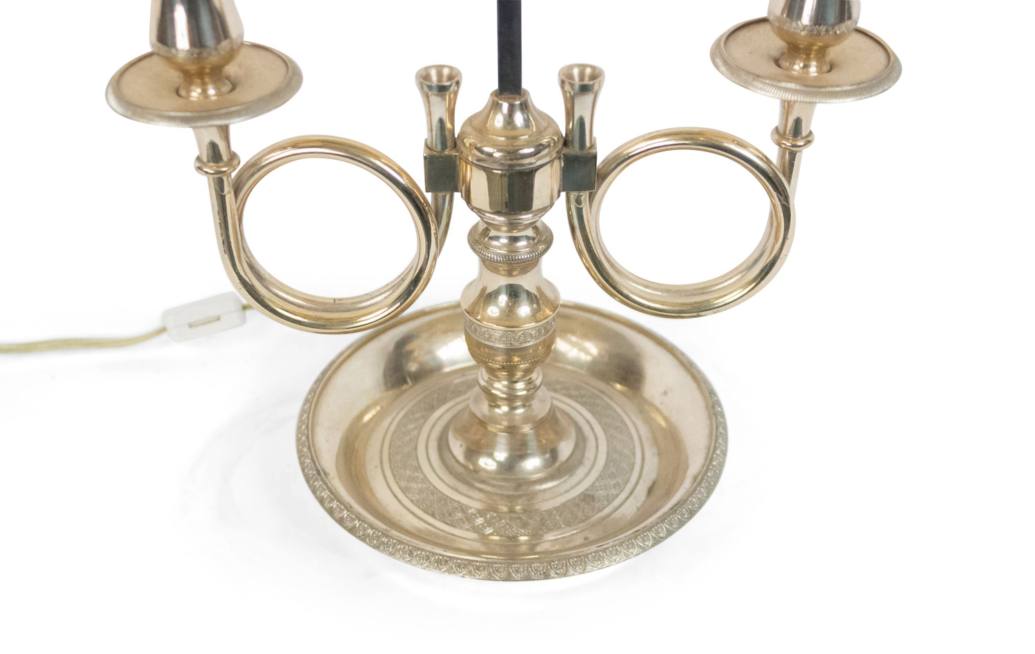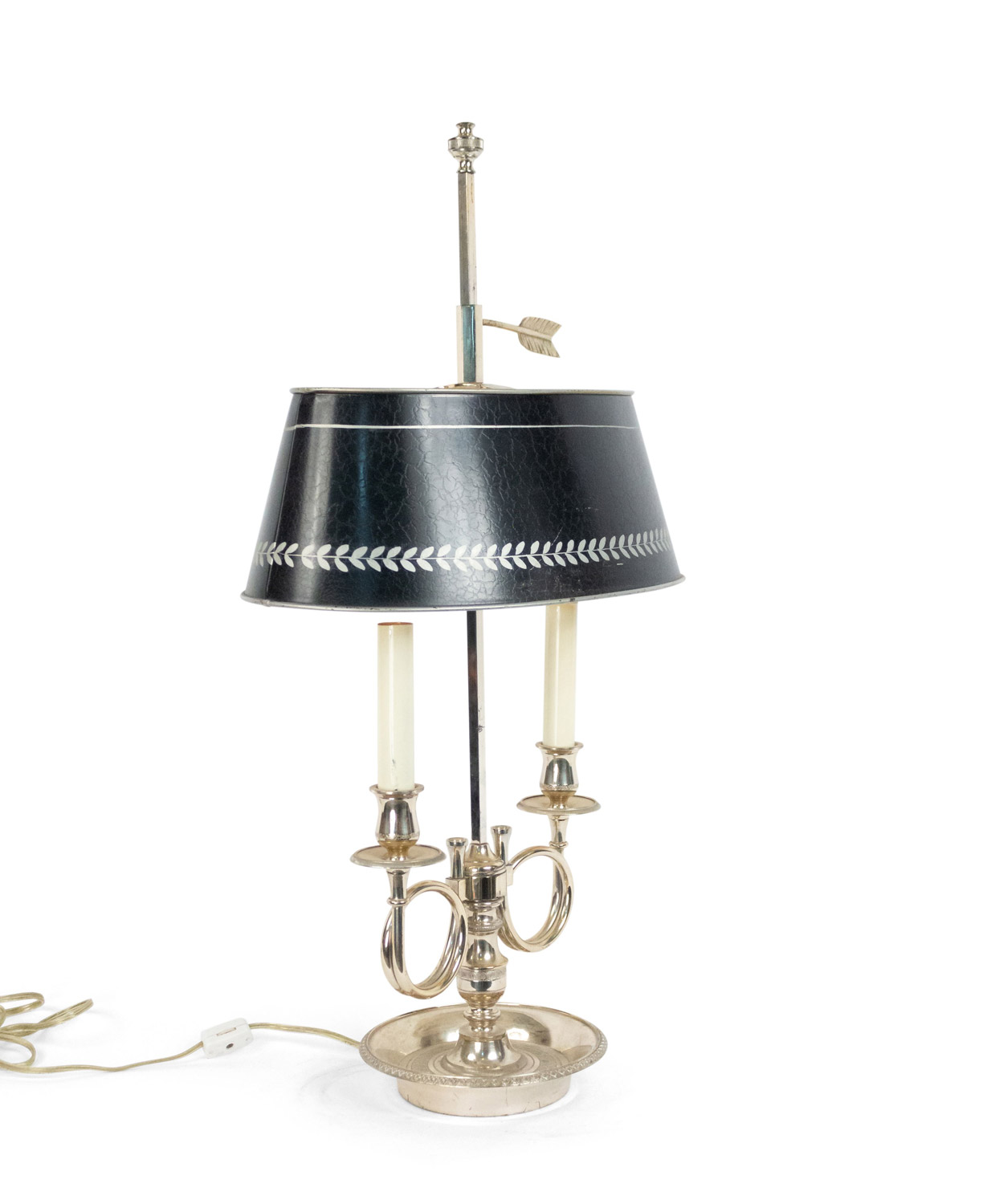 PAIR of French Empire style (20th Century) silver plate 2 arm bouillotte /desk table lamp with oval tole decorated shade and horn motif (PRICED AS PAIR).