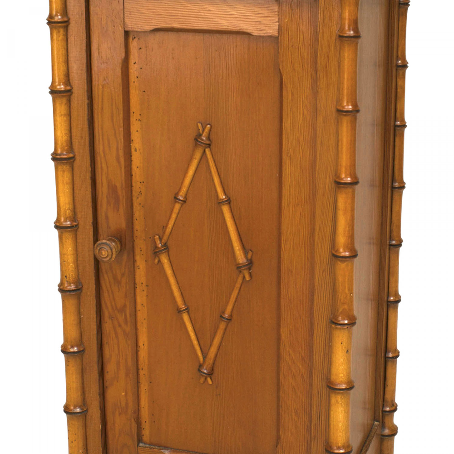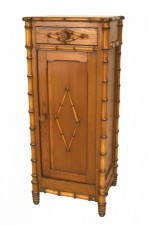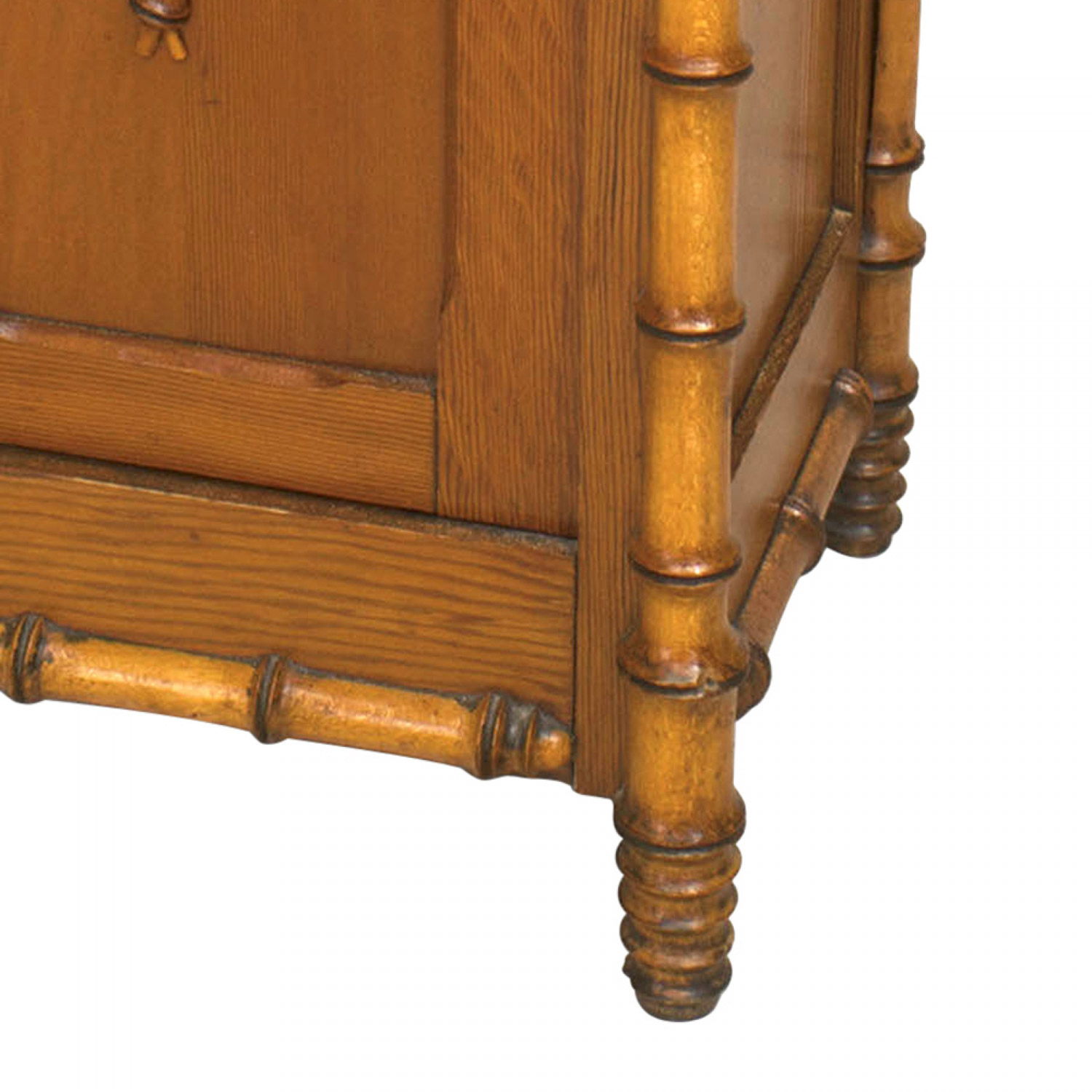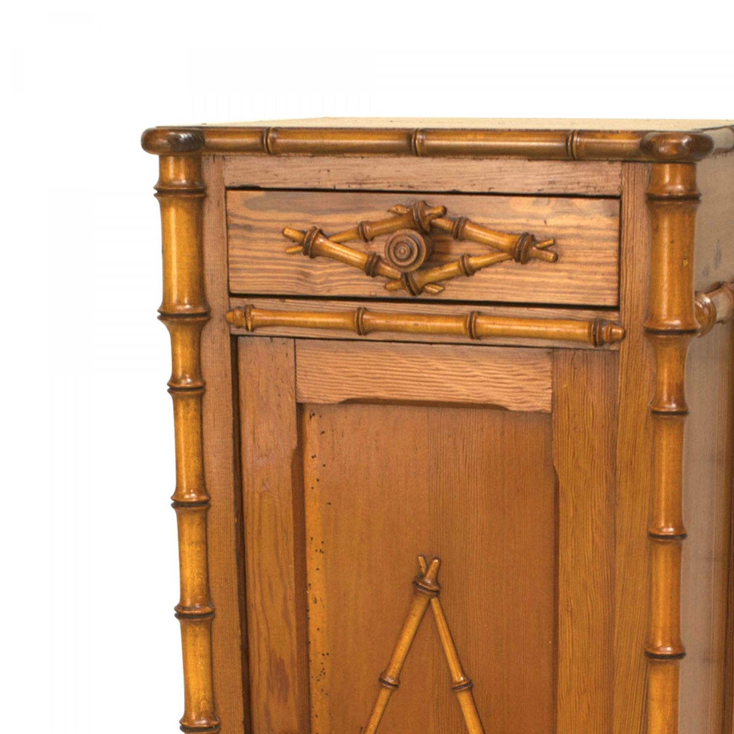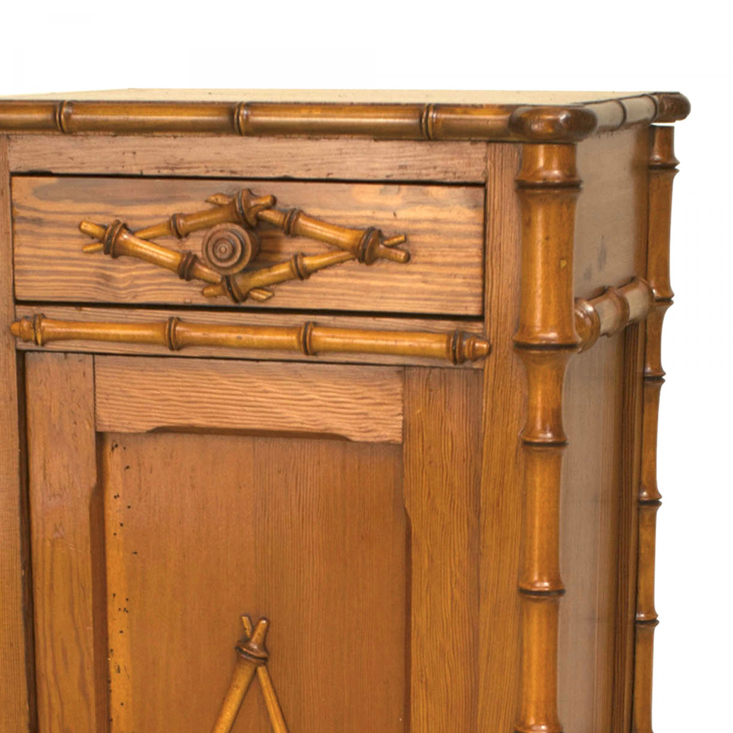 French (late 19th Century) faux bamboo and pine bedside commode with a top drawer above a large door..
