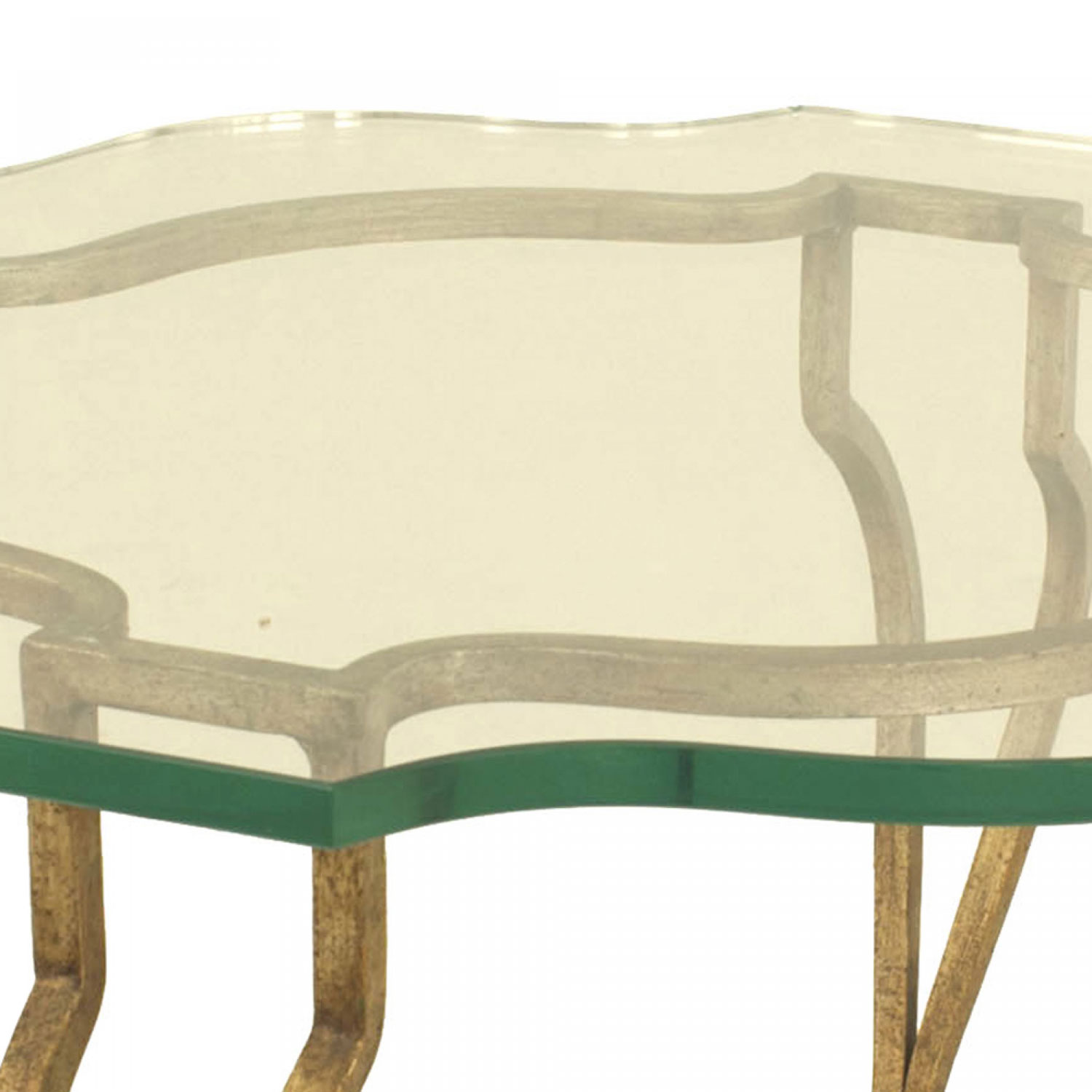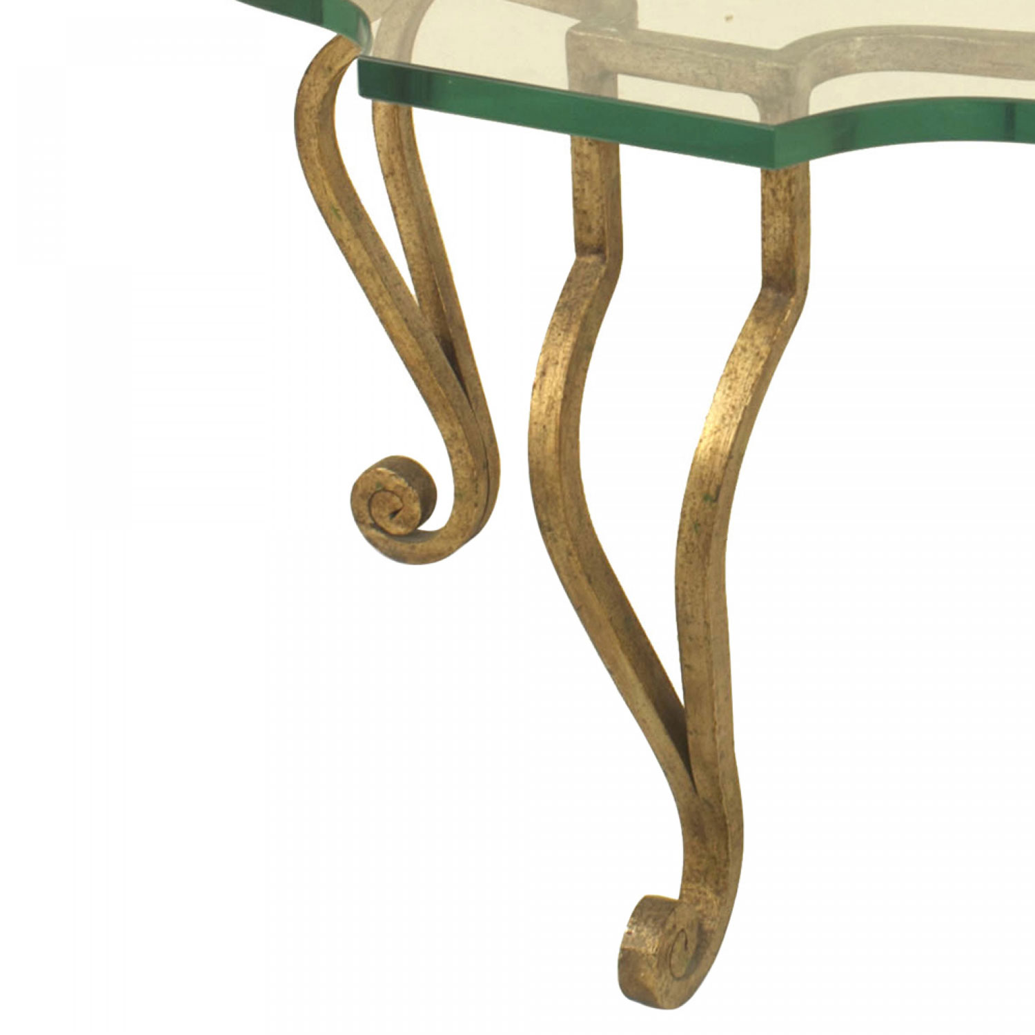 French Mid-Century gilt iron coffee table with four double scroll legs and a shaped glass top. (attributed to MAISON JANSEN).