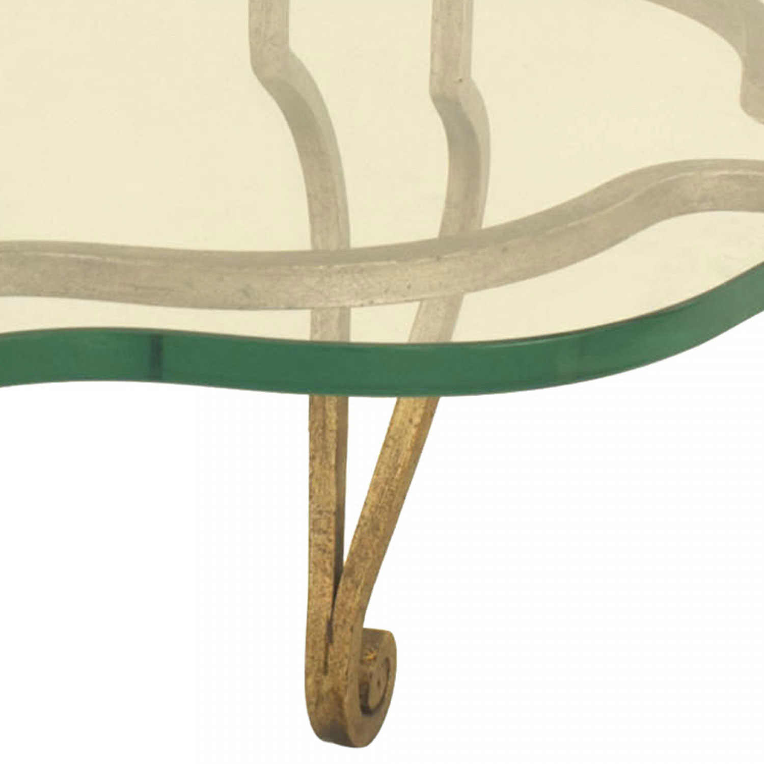 French Mid-Century gilt iron coffee table with four double scroll legs and a shaped glass top. (attributed to MAISON JANSEN)