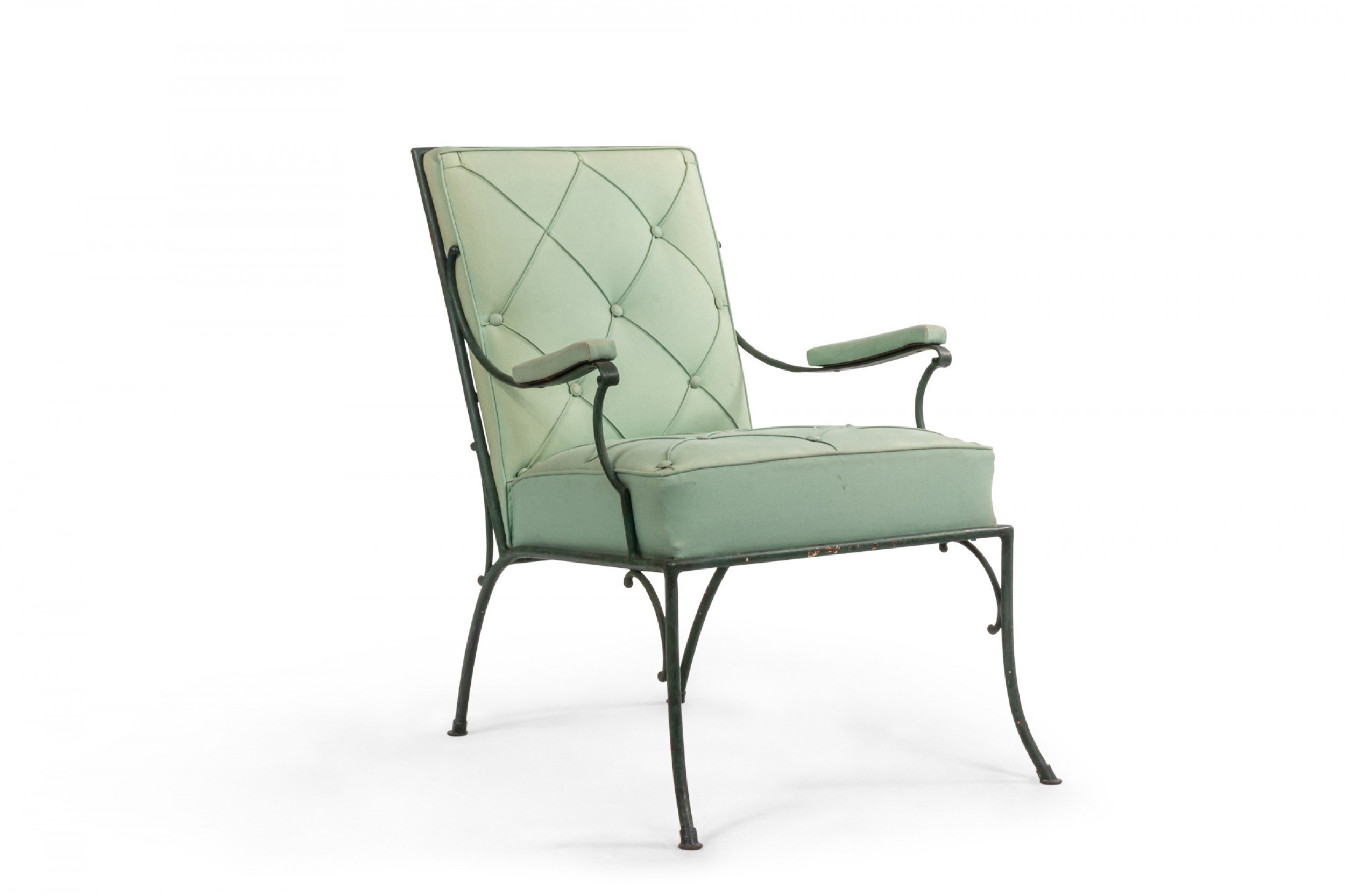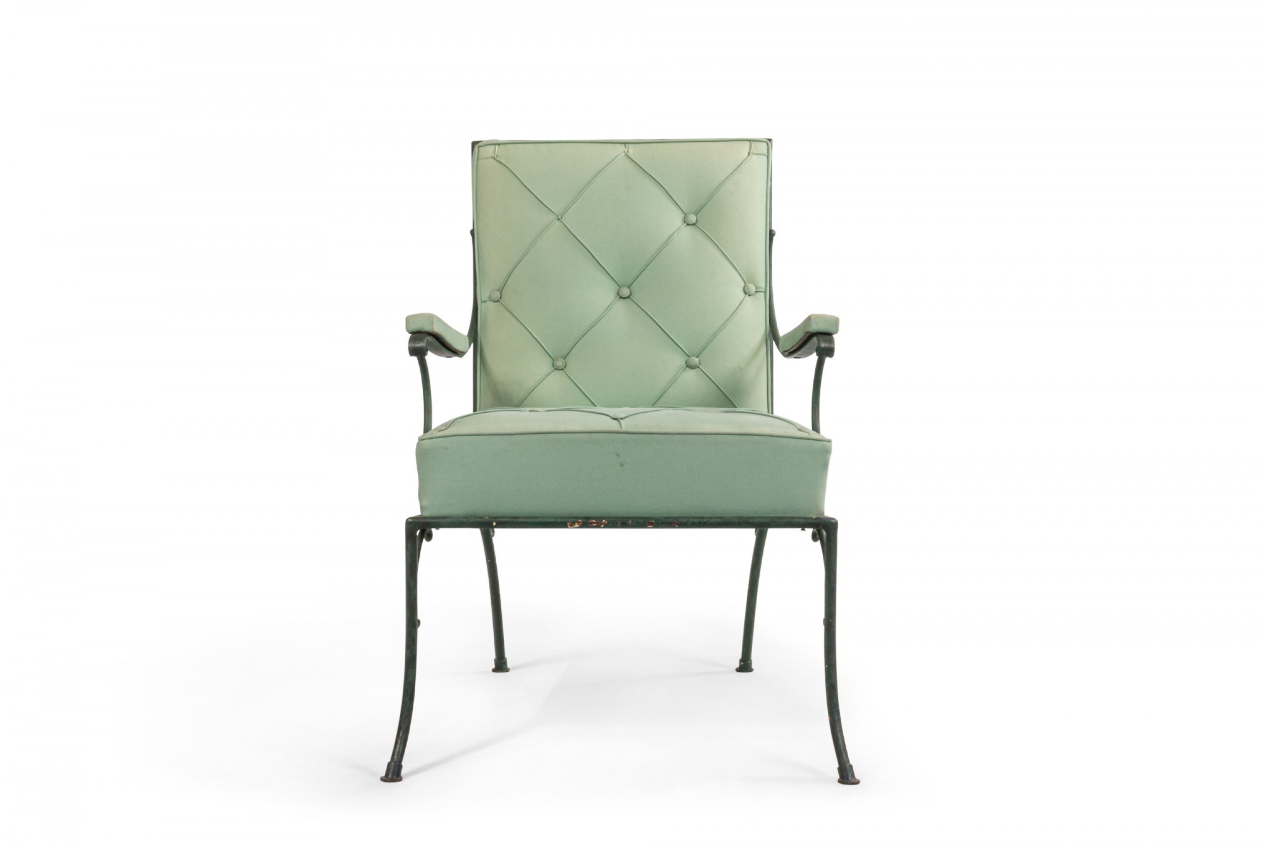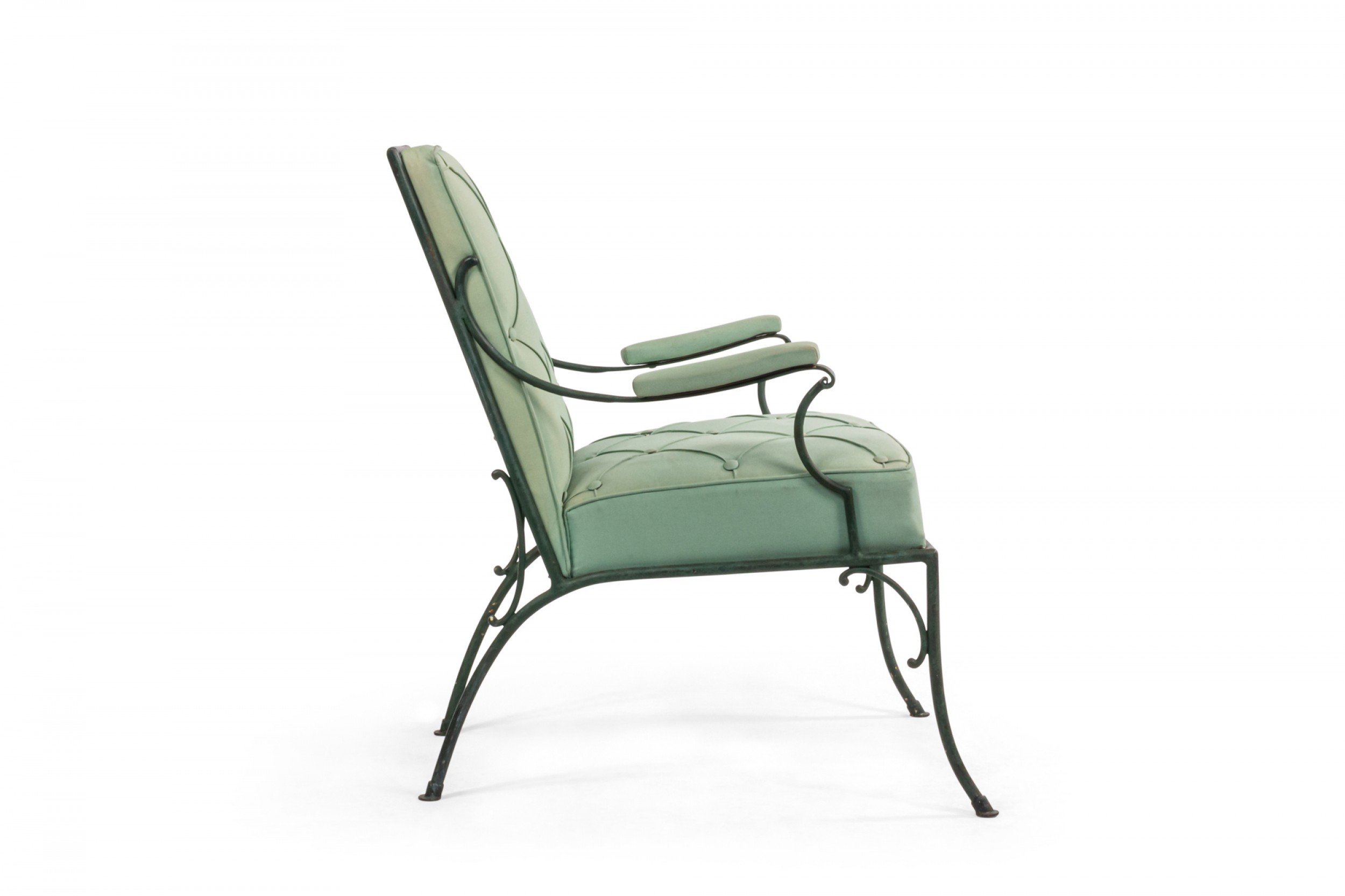 PAIR of French 1940s green painted iron Armchairs with green cotton buttoned cushions