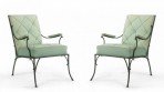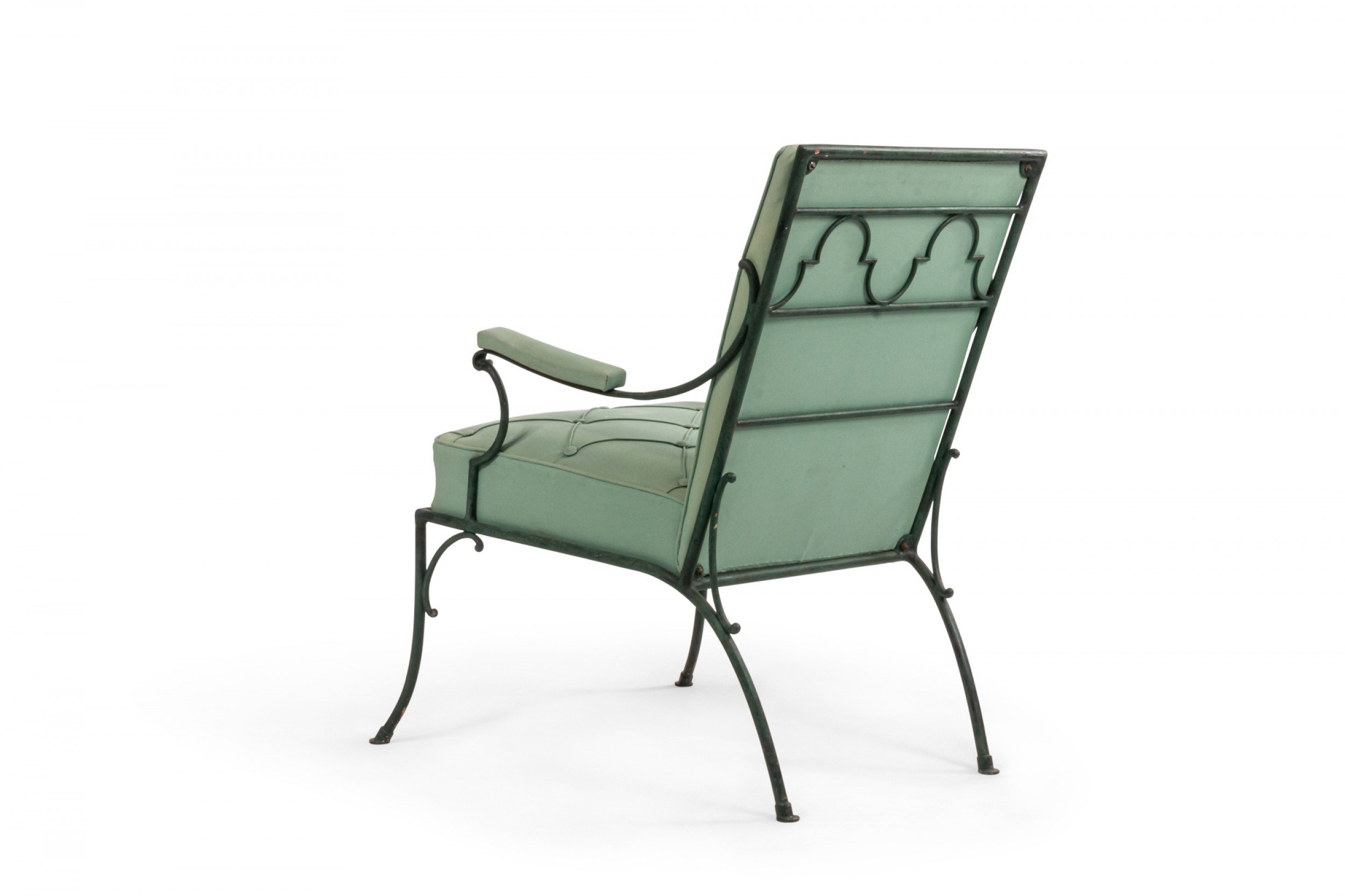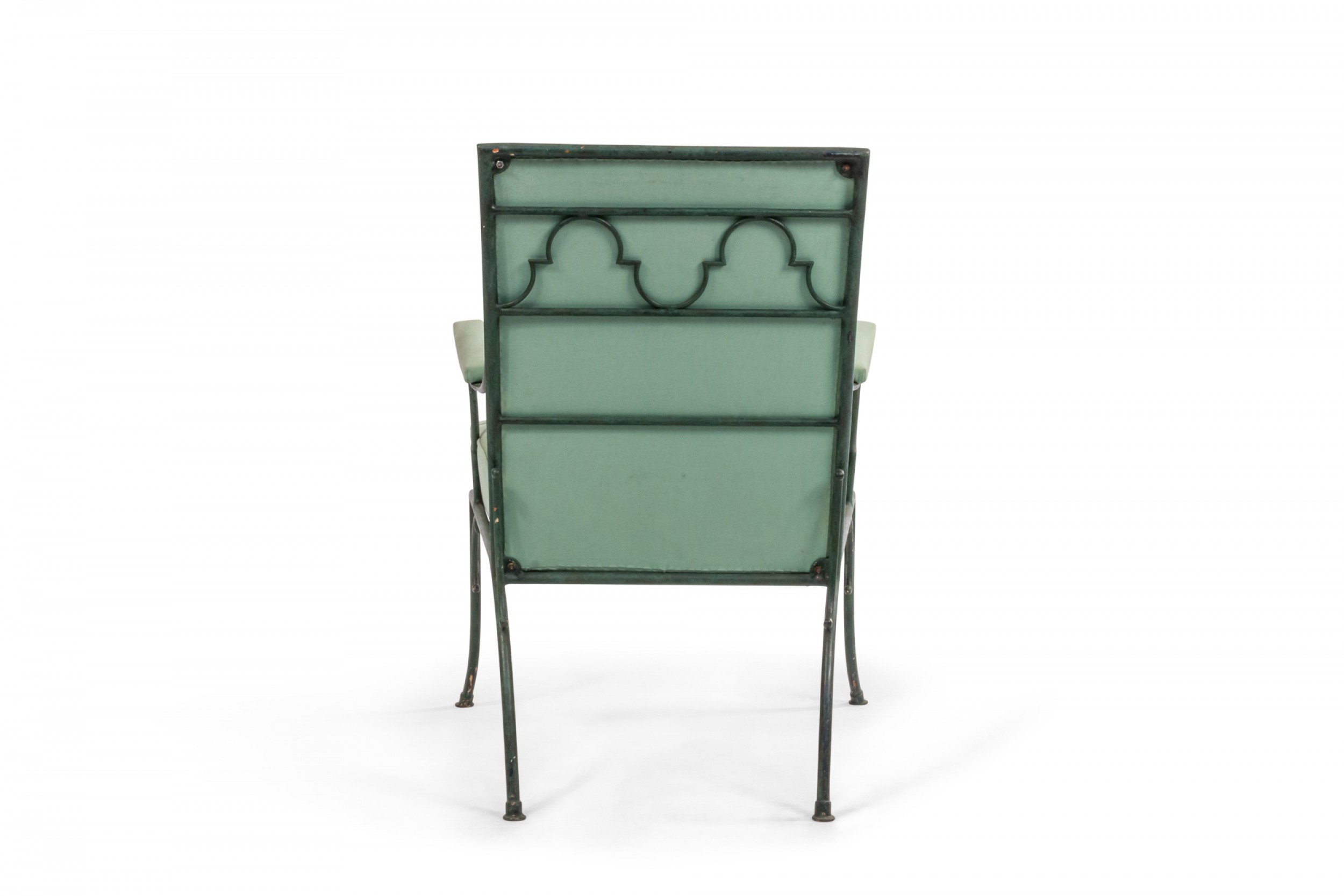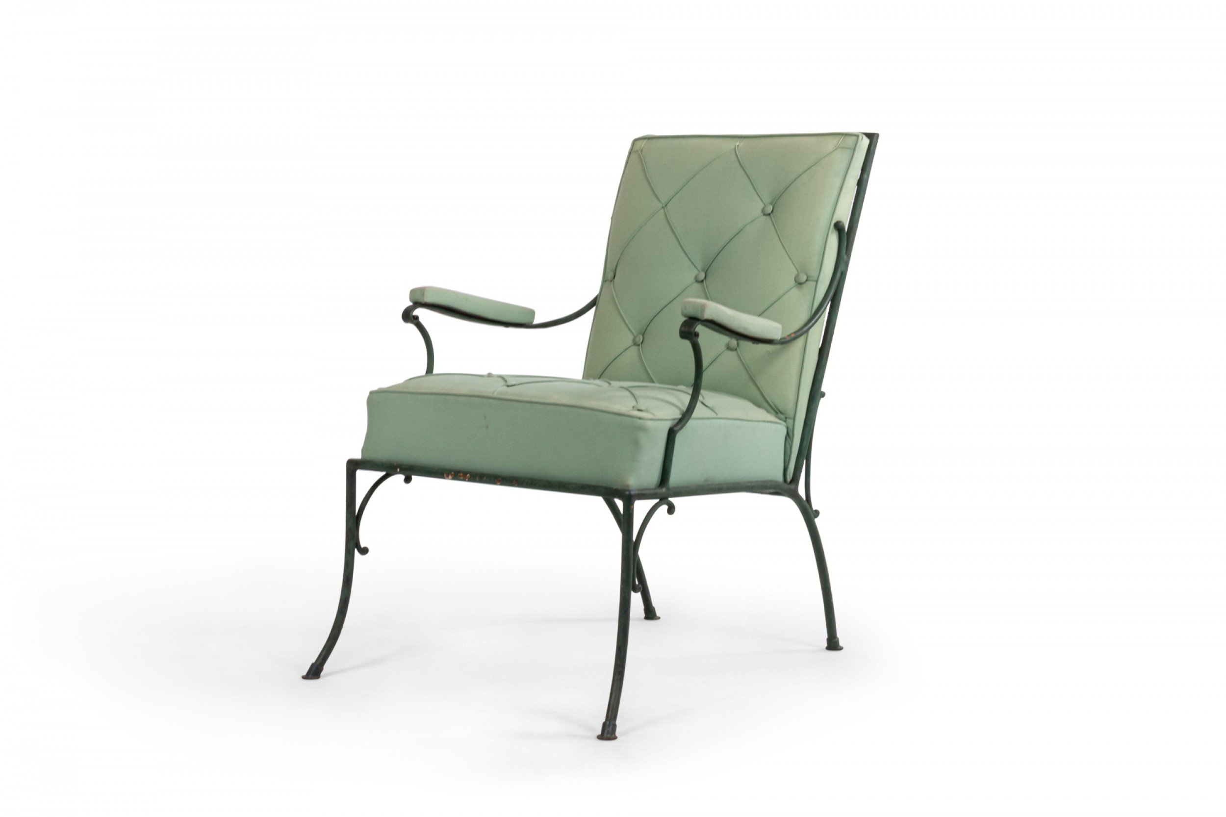 PAIR of French 1940s green painted iron Armchairs with green cotton buttoned cushions