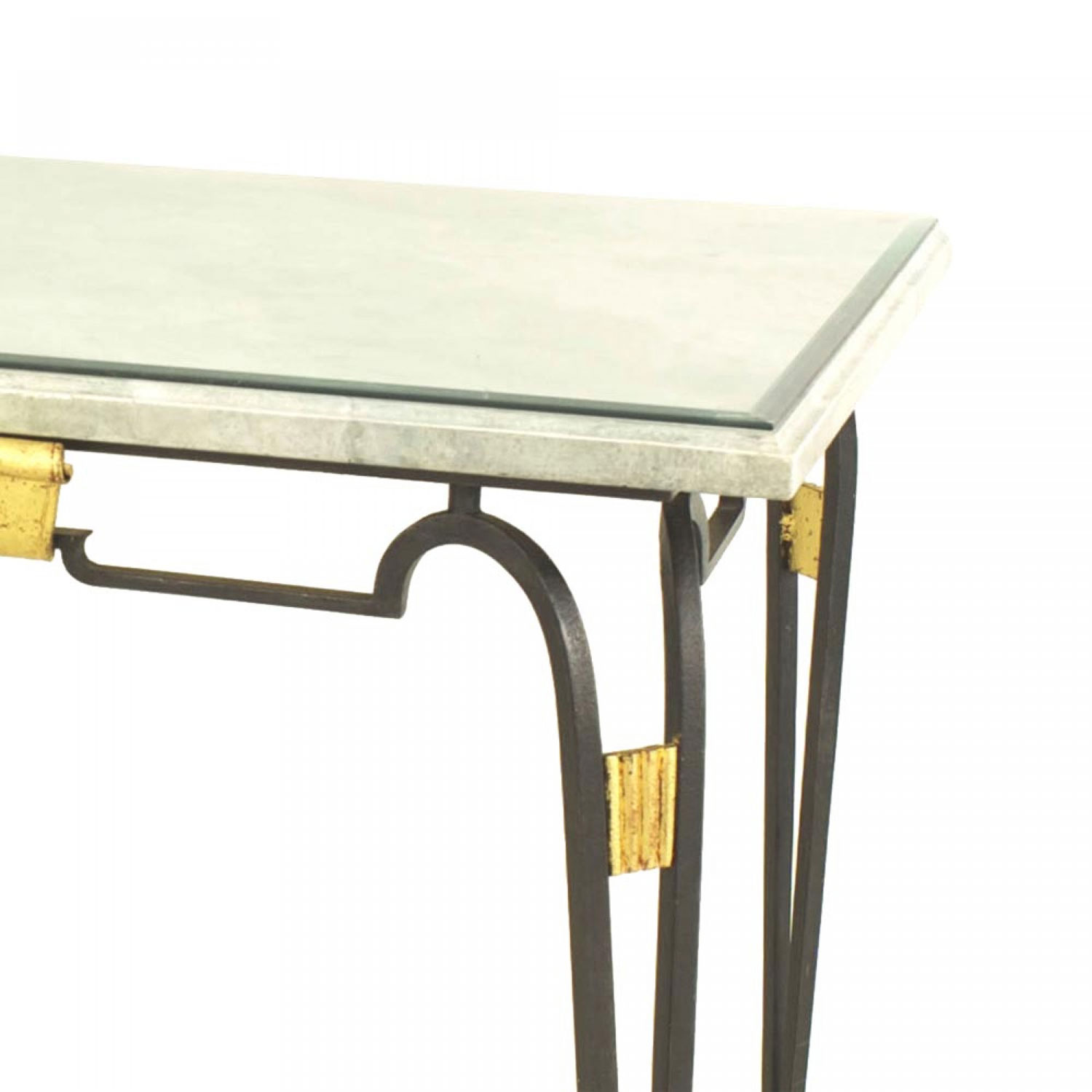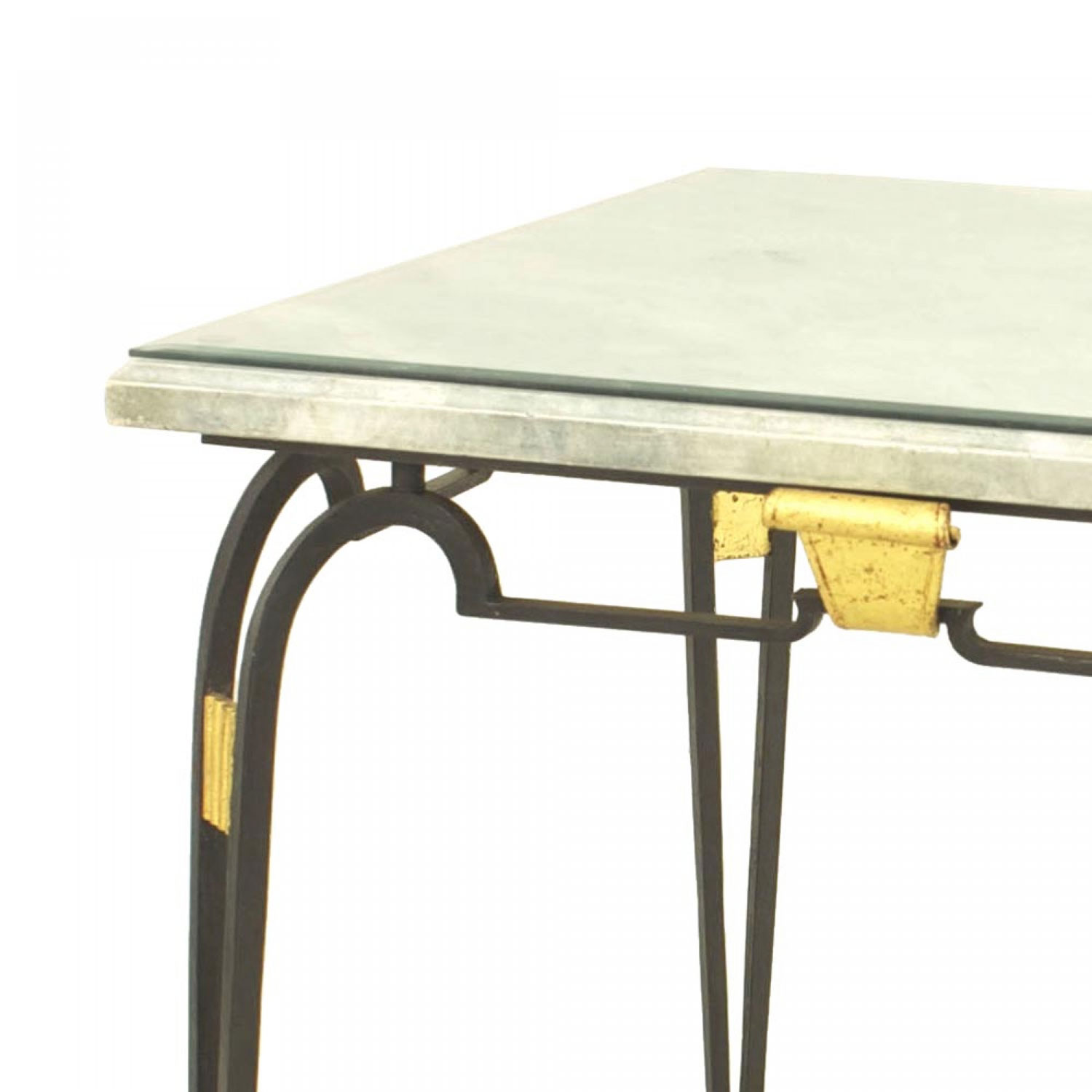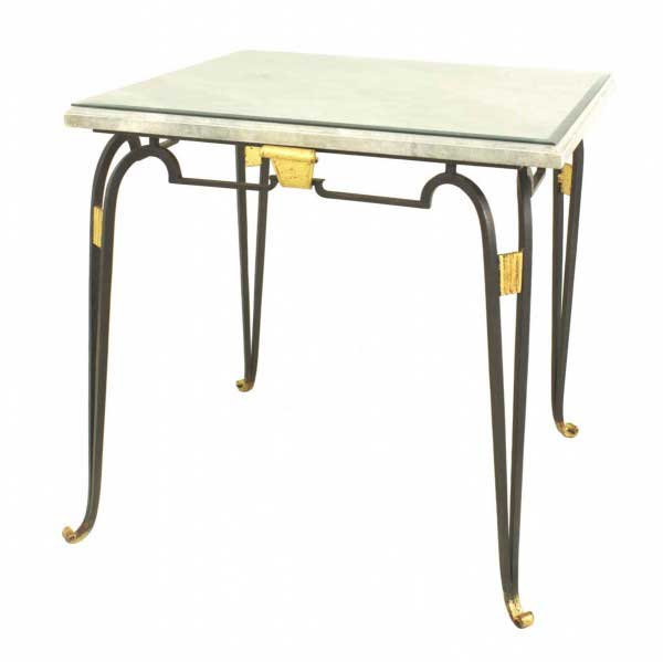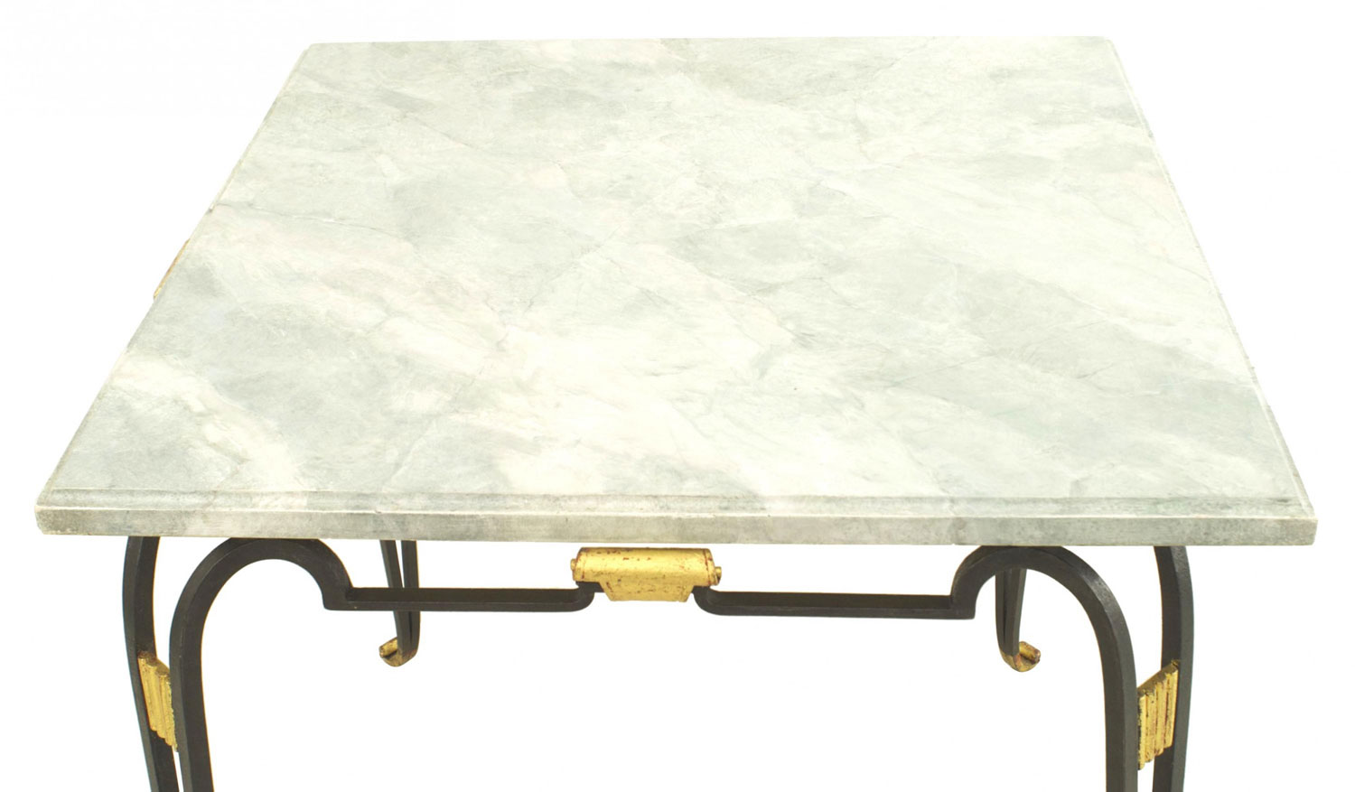 French 1940s square iron game table with open scroll design legs and gilt metal trim supporting a faux green painted travertine top (attributed to RENE PROU)..