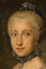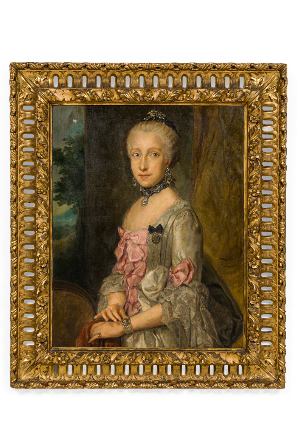 French gilt filigree carved framed oil painting portrait of 18th Century lady wearing pink bow (signed A. BERGNER)