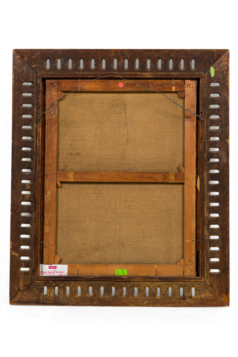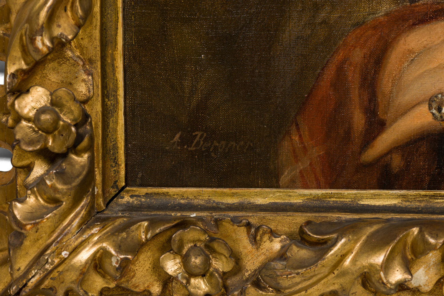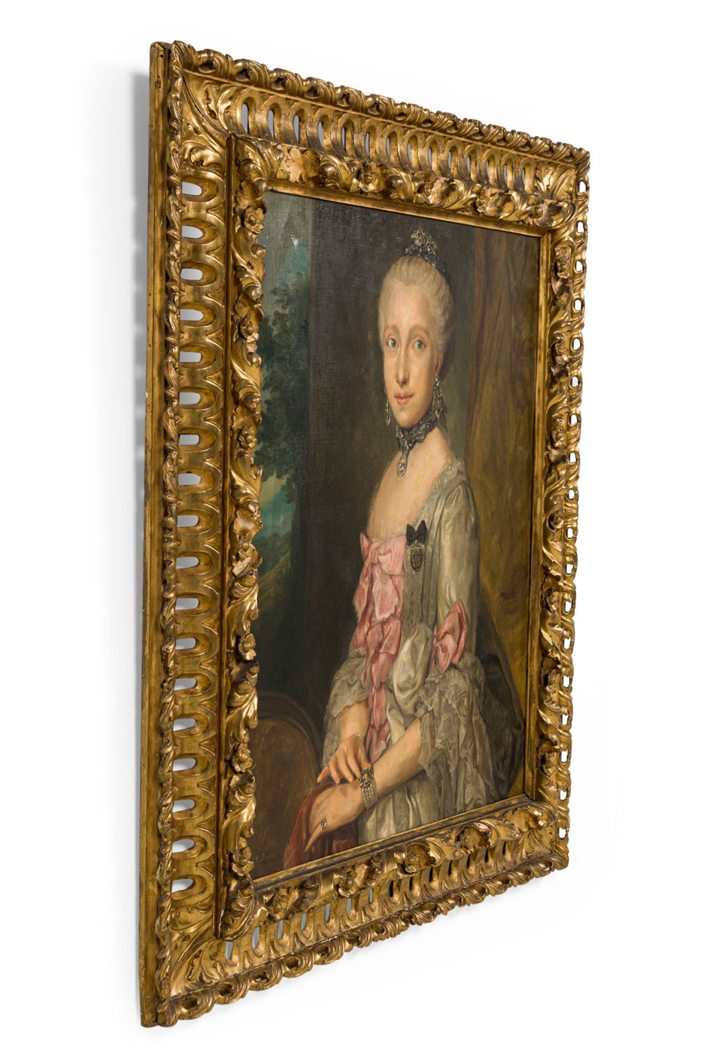 French gilt filigree carved framed oil painting portrait of 18th Century lady wearing pink bow (signed A. BERGNER).