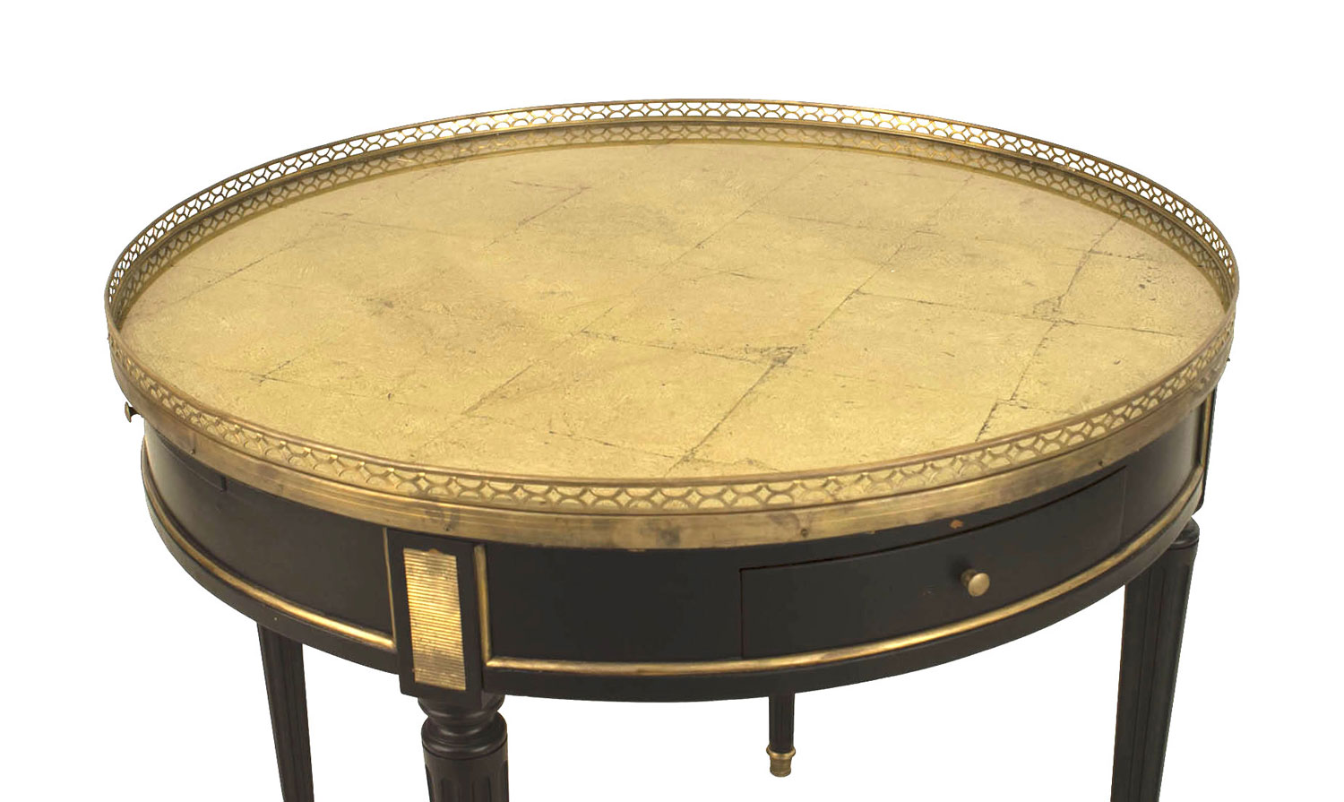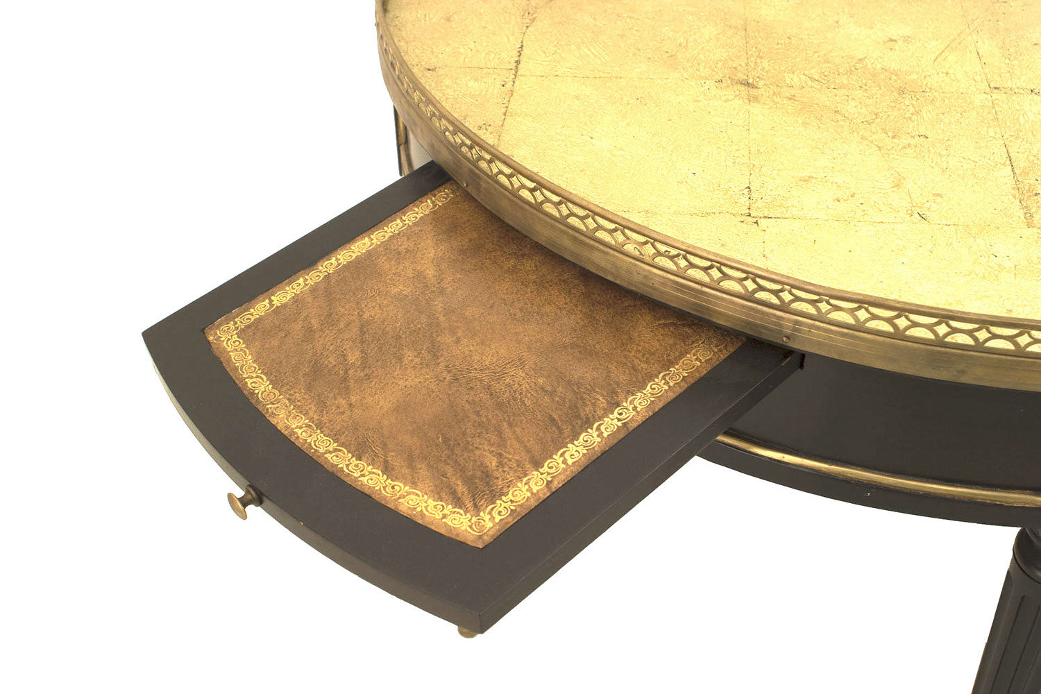 French Louis XVI-style (1940s) round end table with a gold leaf under glass top, having a filigree brass gallery and trim. 2 drawers and 2 pullout side shelves with a leather surface. (Attributed to JANSEN).