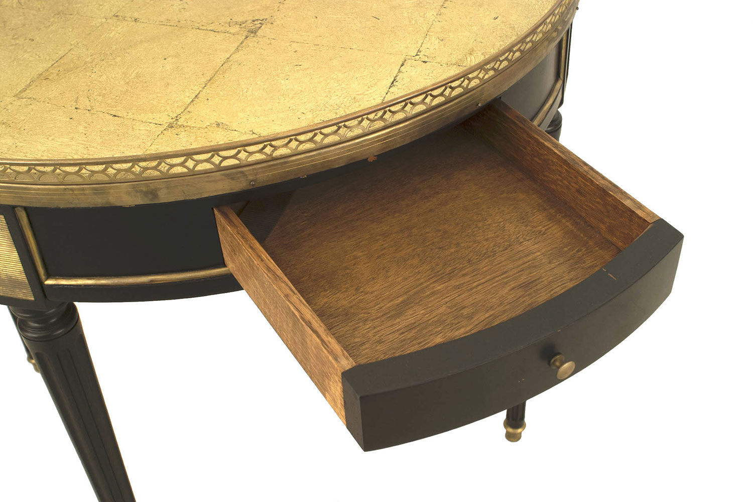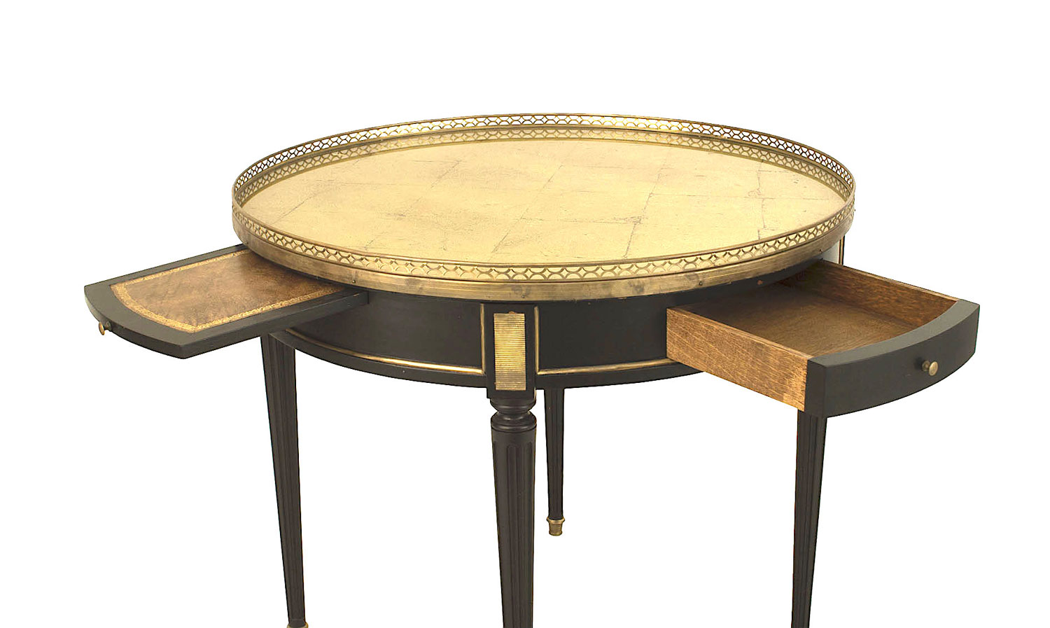 French Louis XVI-style (1940s) round end table with a gold leaf under glass top, having a filigree brass gallery and trim. 2 drawers and 2 pullout side shelves with a leather surface. (Attributed to JANSEN)