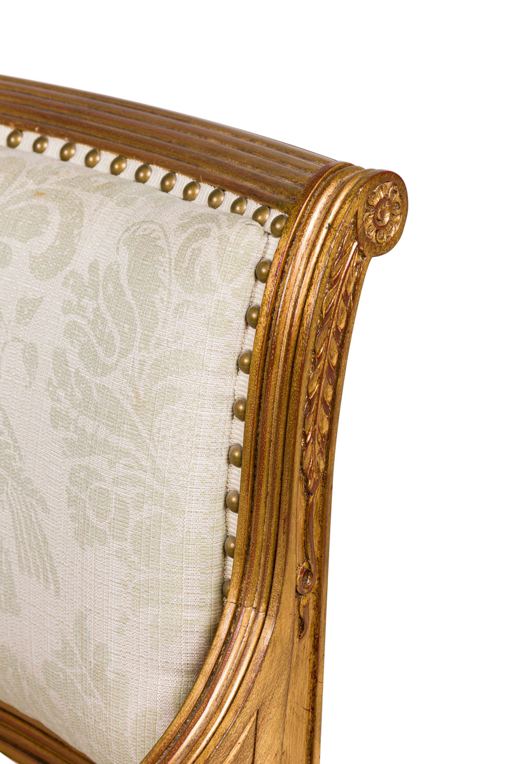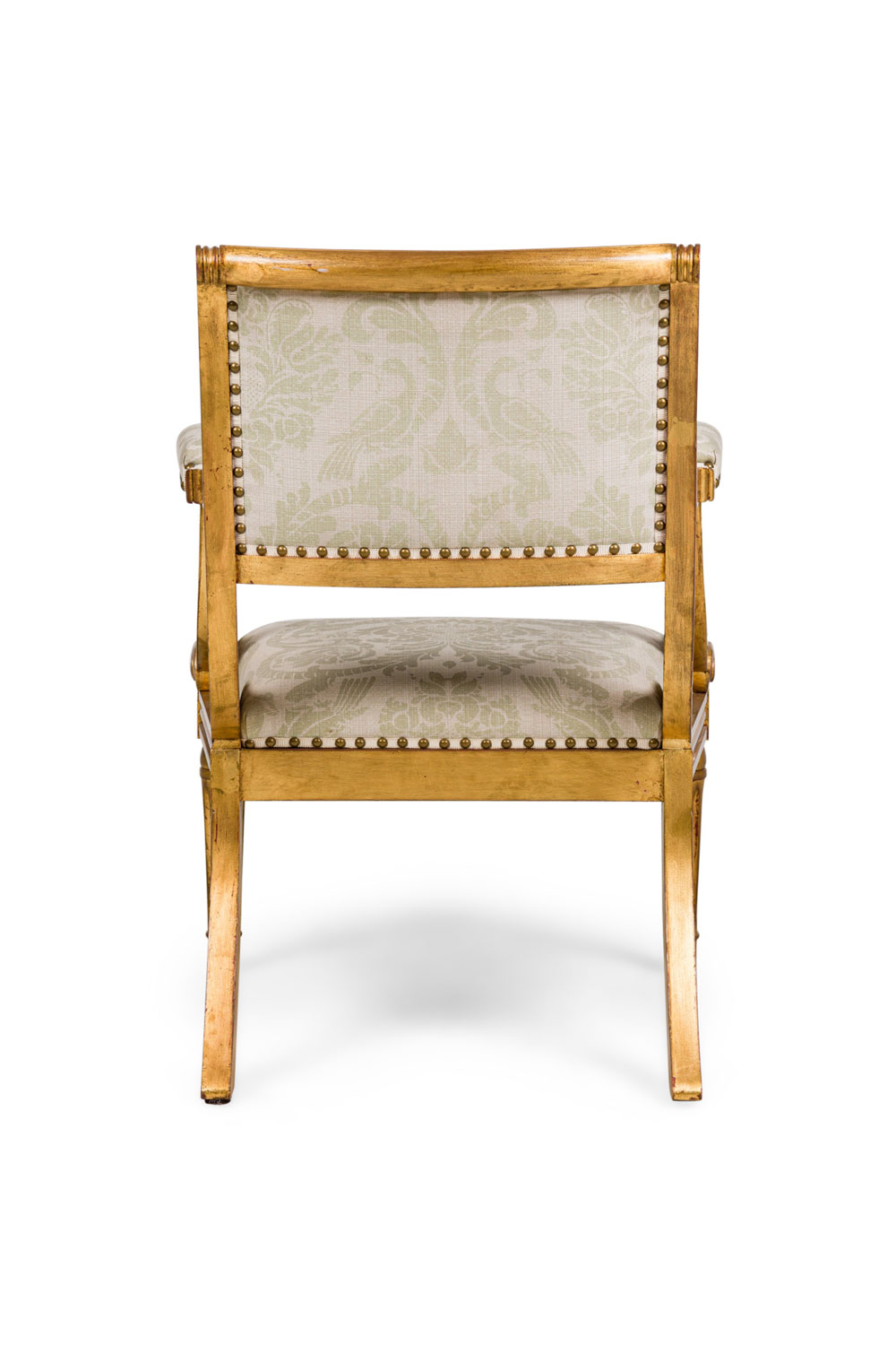 English Regency style (20th Century) carved giltwood armchair with padded scroll armrests and grey damask upholstered seat and back with antique brass decorative nails ending with fluted sabre form legs