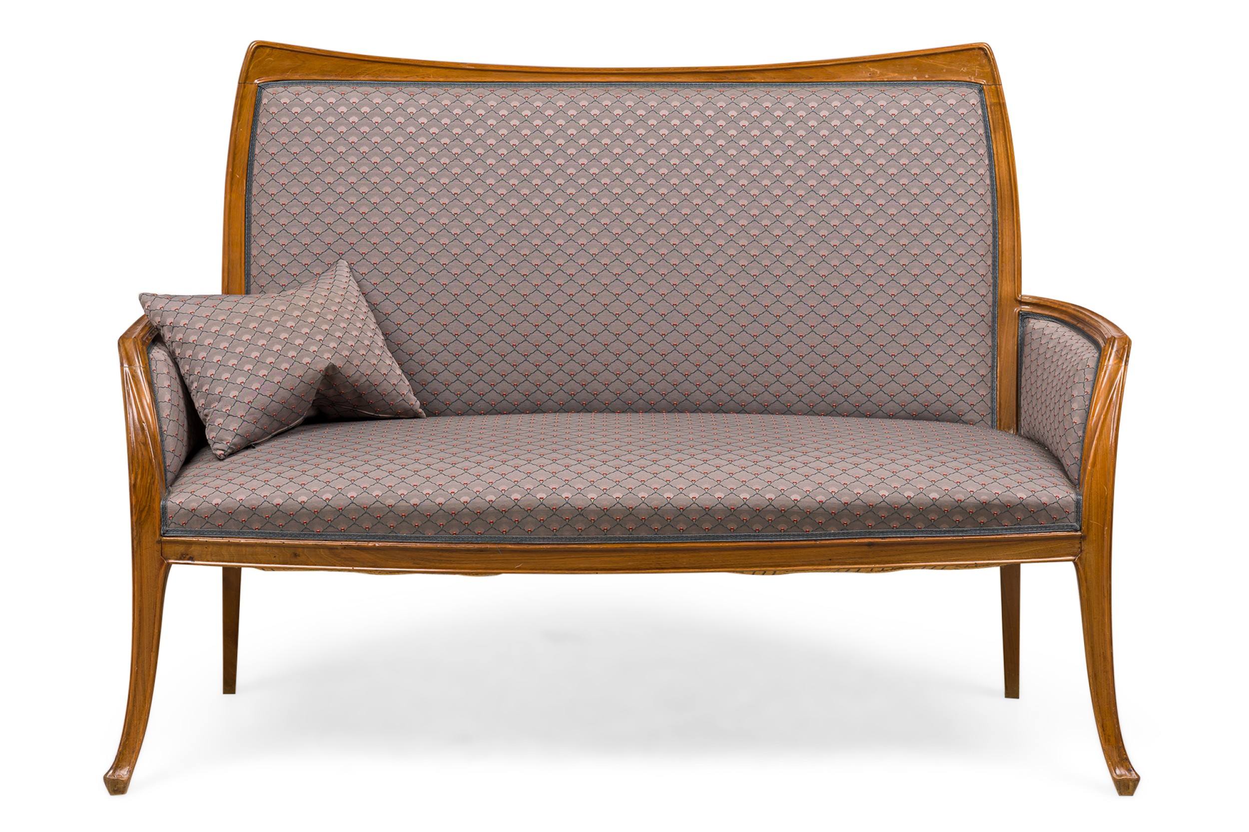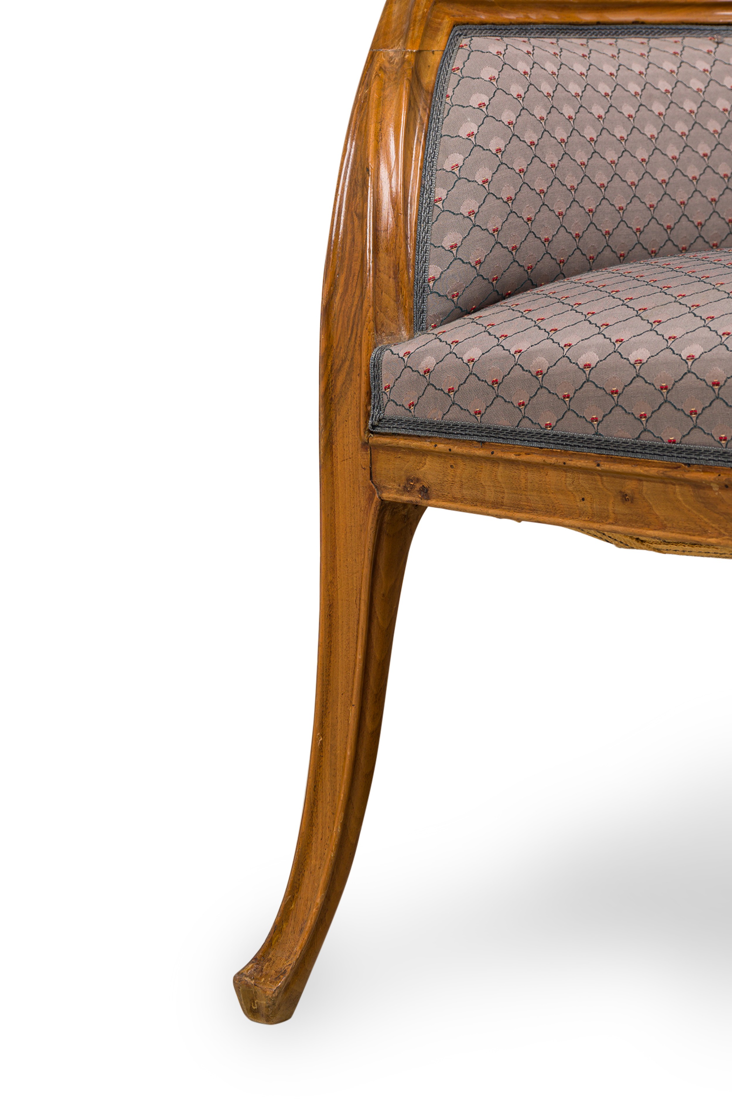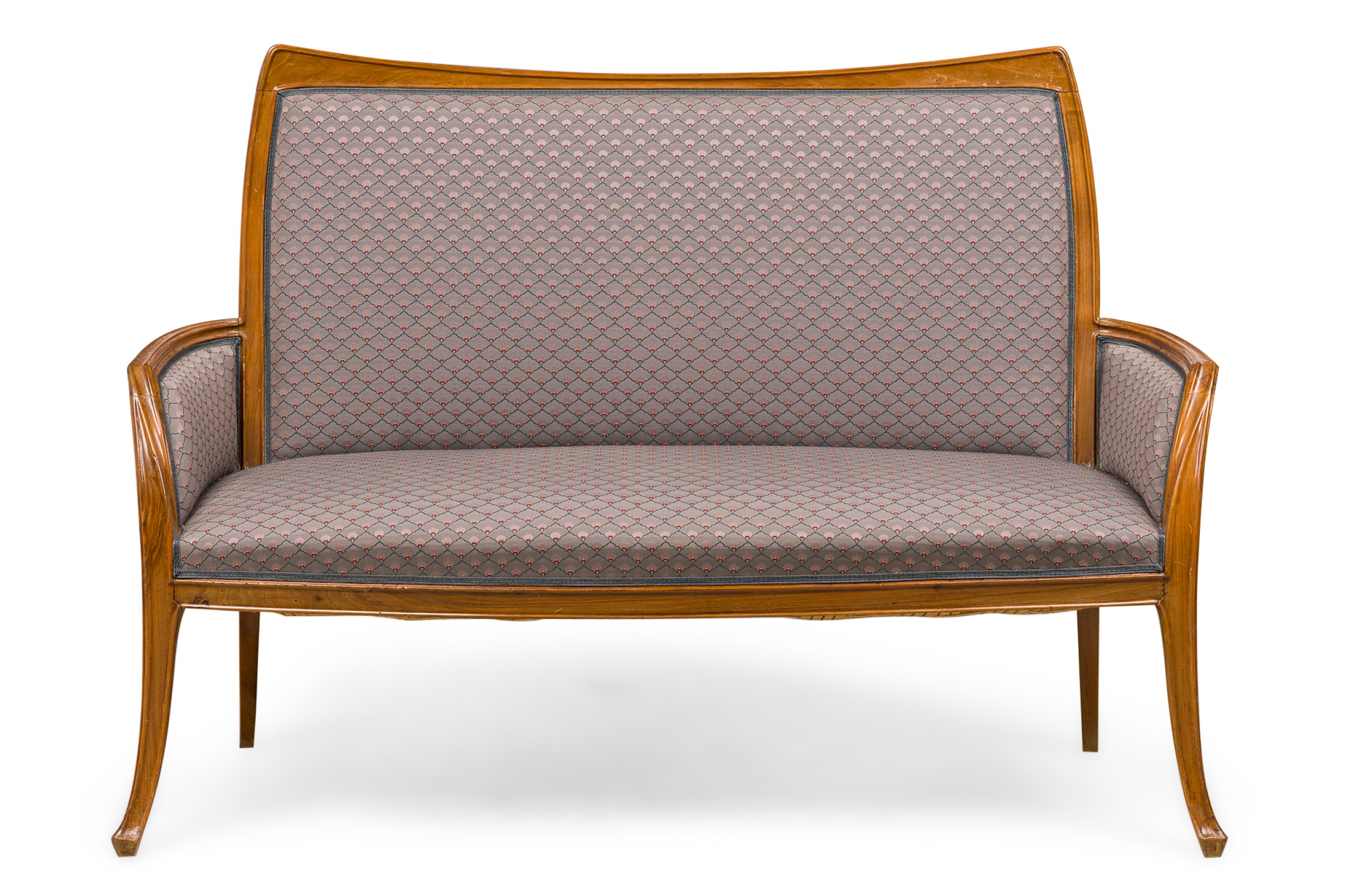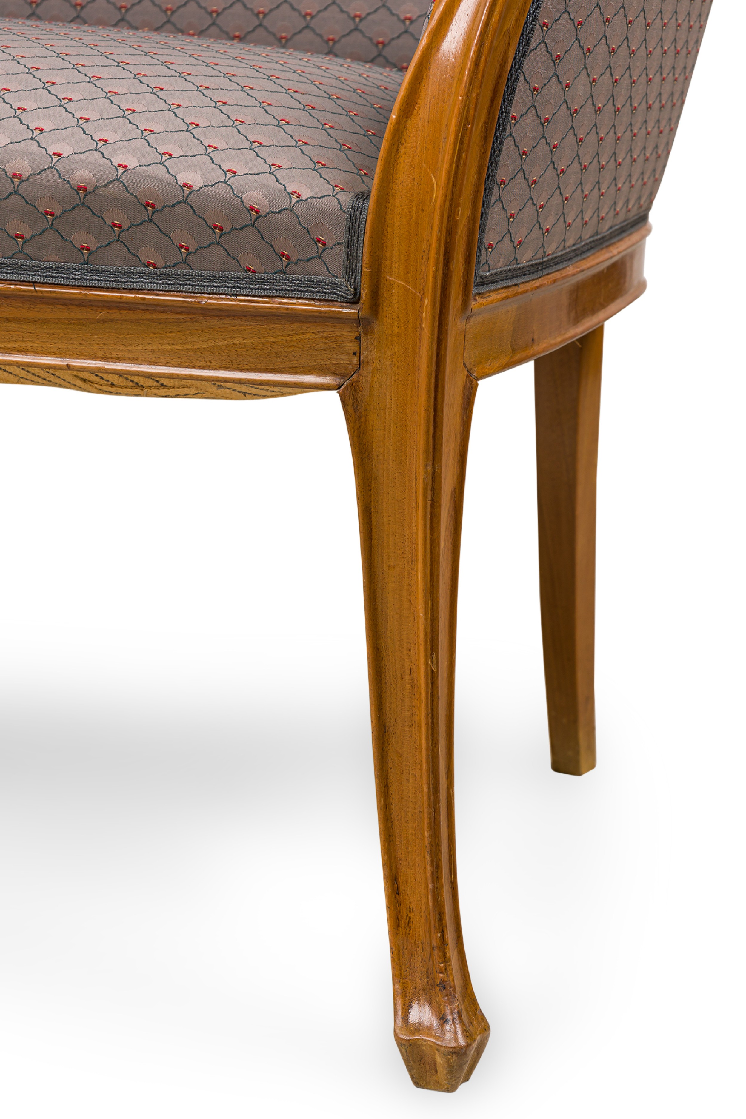 Style: Art Nouveau Materials & Techniques: Fabric, upholstered, walnut Category: Seating Condition: Wear to frame finish Good; Wear consistent with age and use
