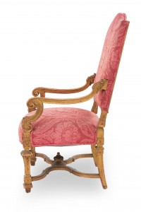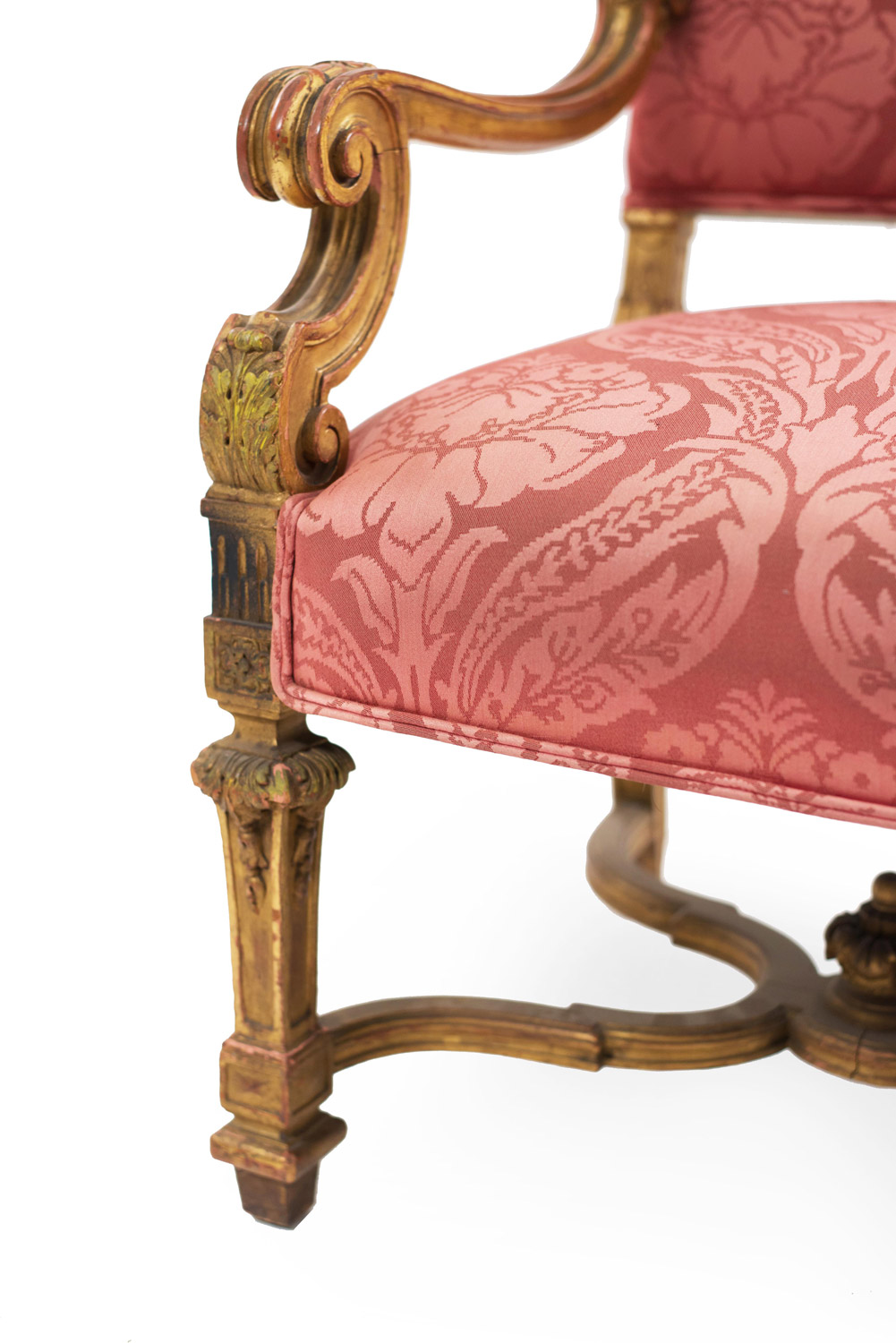 SET of 9 French Louis XIV style (19th Century) gilt chairs with rose damask upholstery. 2 arm chairs: 24½"w 21"d 44½"h, 7 side chairs (PRICED AS SET).