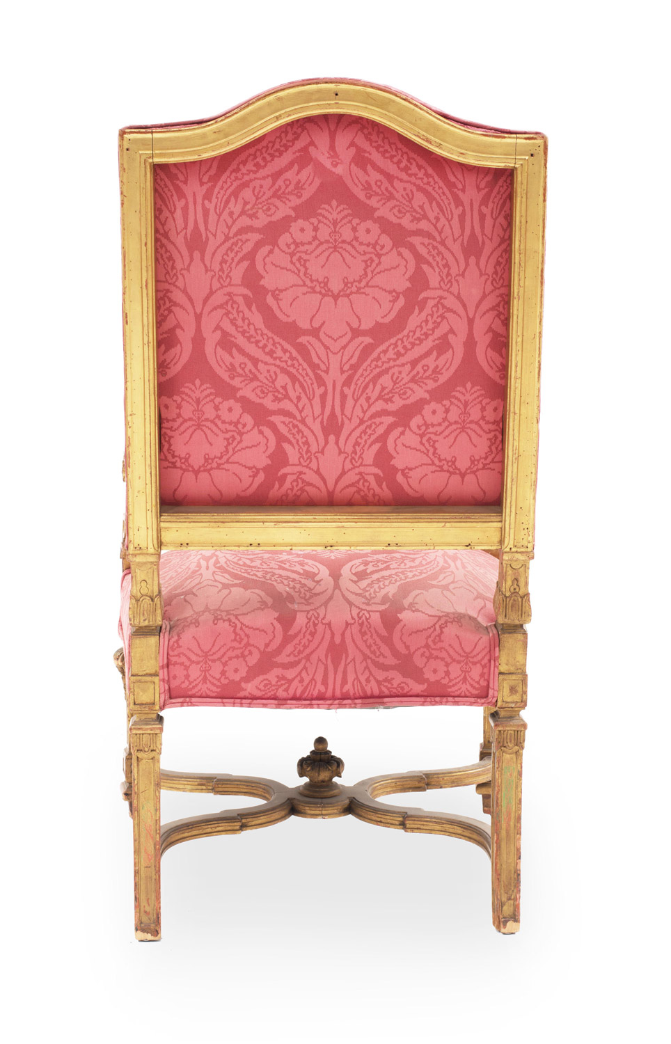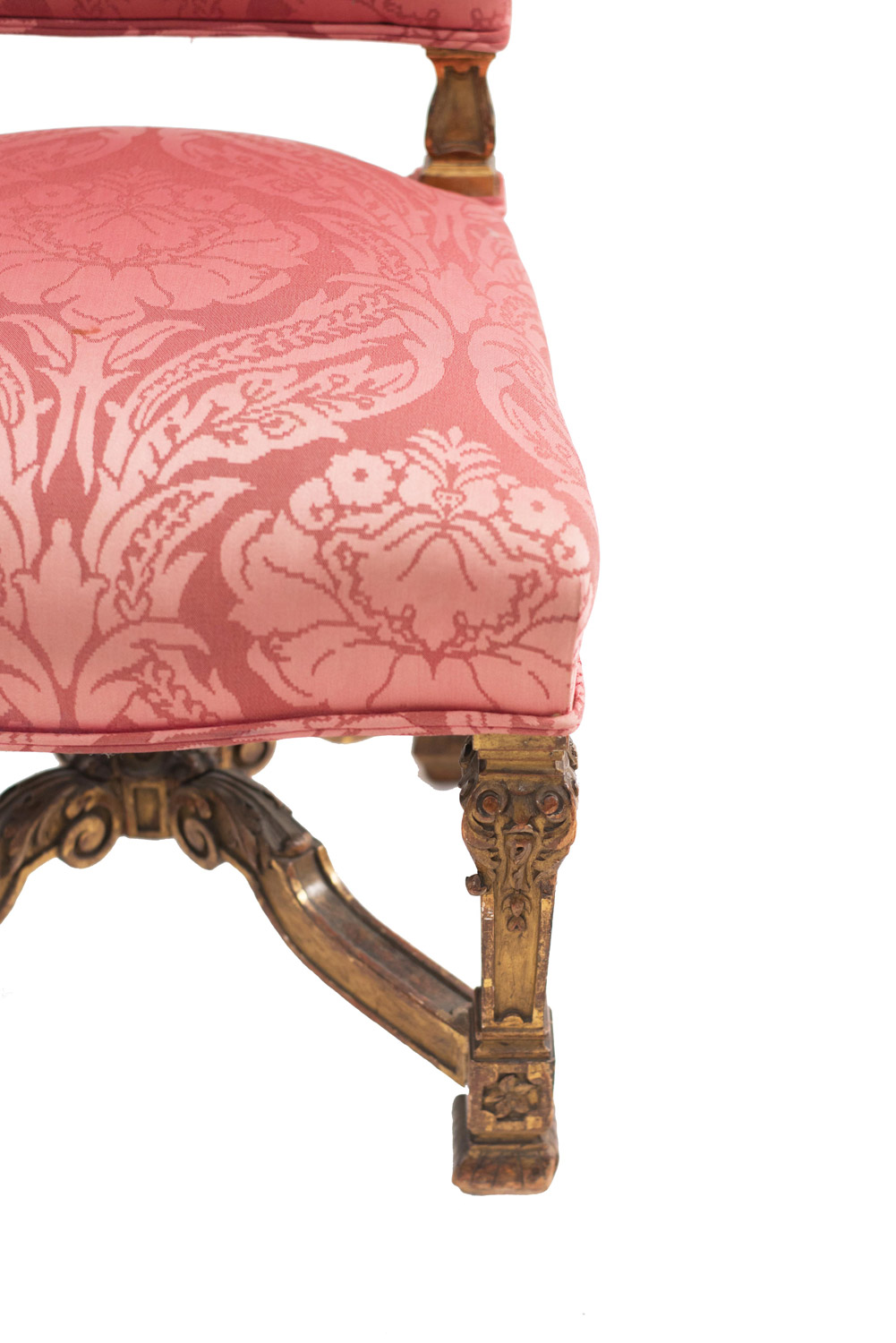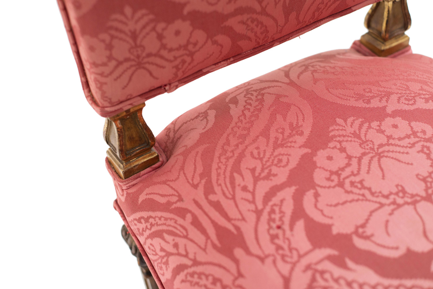 SET of 9 French Louis XIV style (19th Century) gilt chairs with rose damask upholstery. 2 arm chairs: 24½"w 21"d 44½"h, 7 side chairs (PRICED AS SET)..