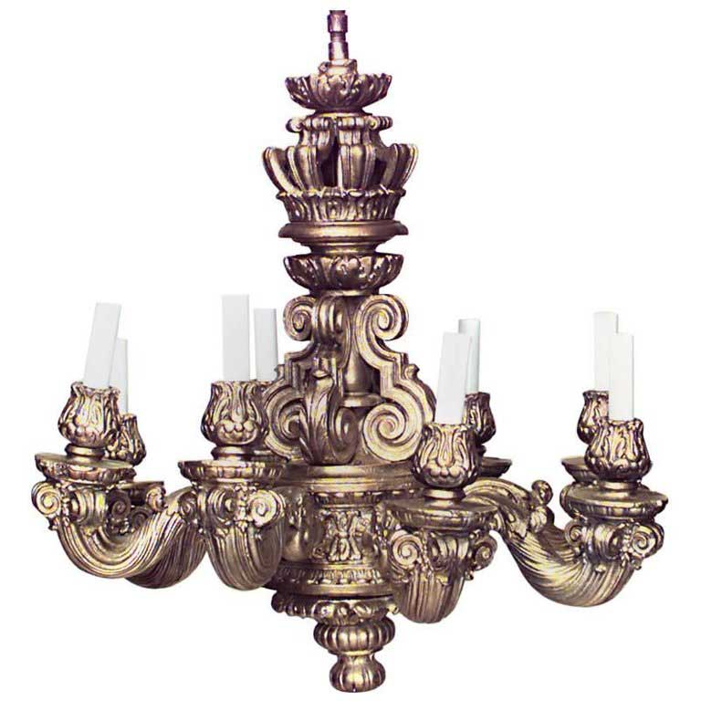 French Louis XIV-style (19th Century) wood & gesso gold painted 8 arm chandelier with swirl cornucopia design arms..