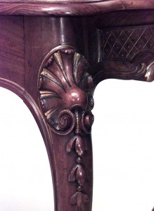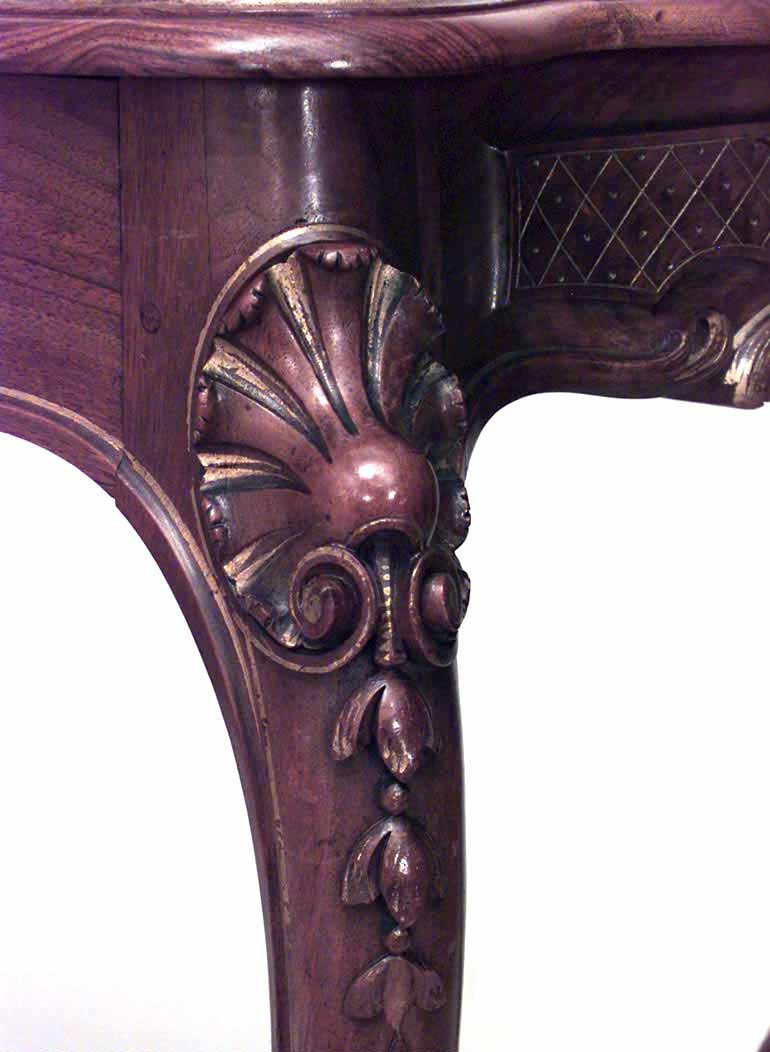 French Louis XV-style (19th Century) walnut and gilt trimmed console table with shell stretcher.