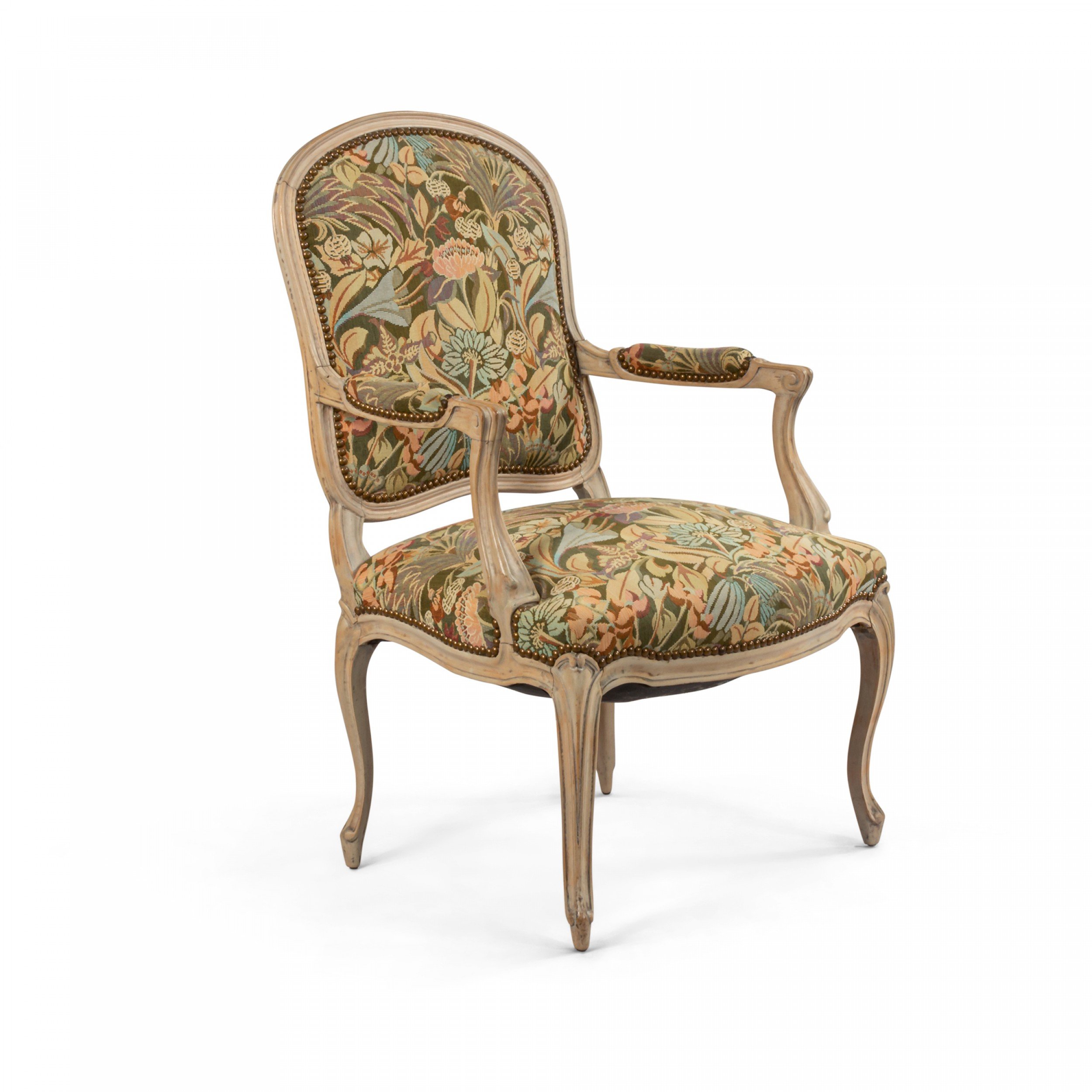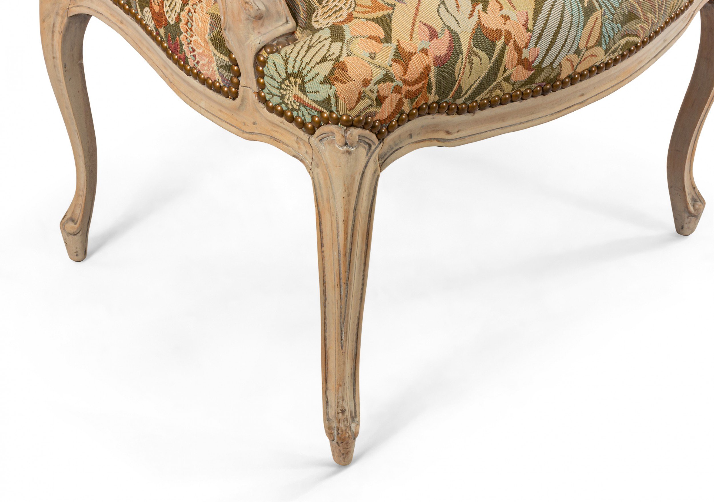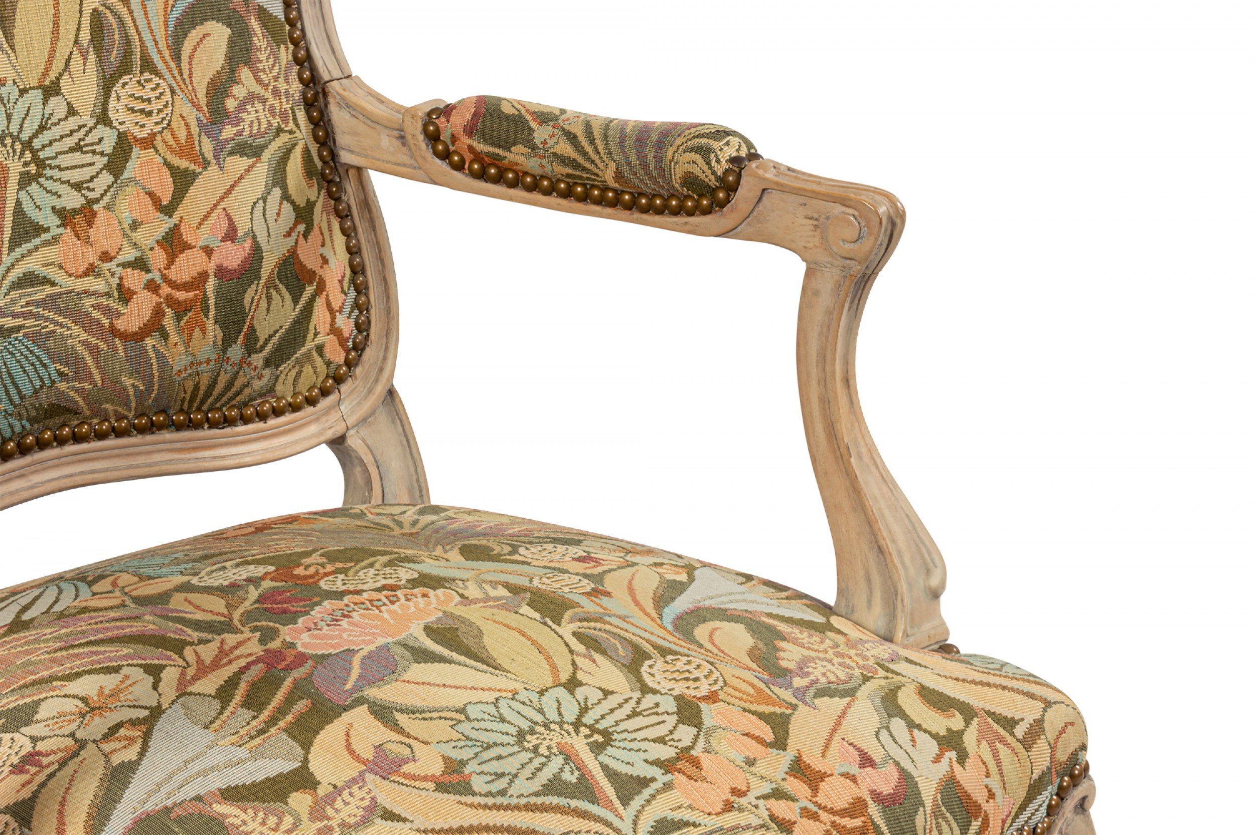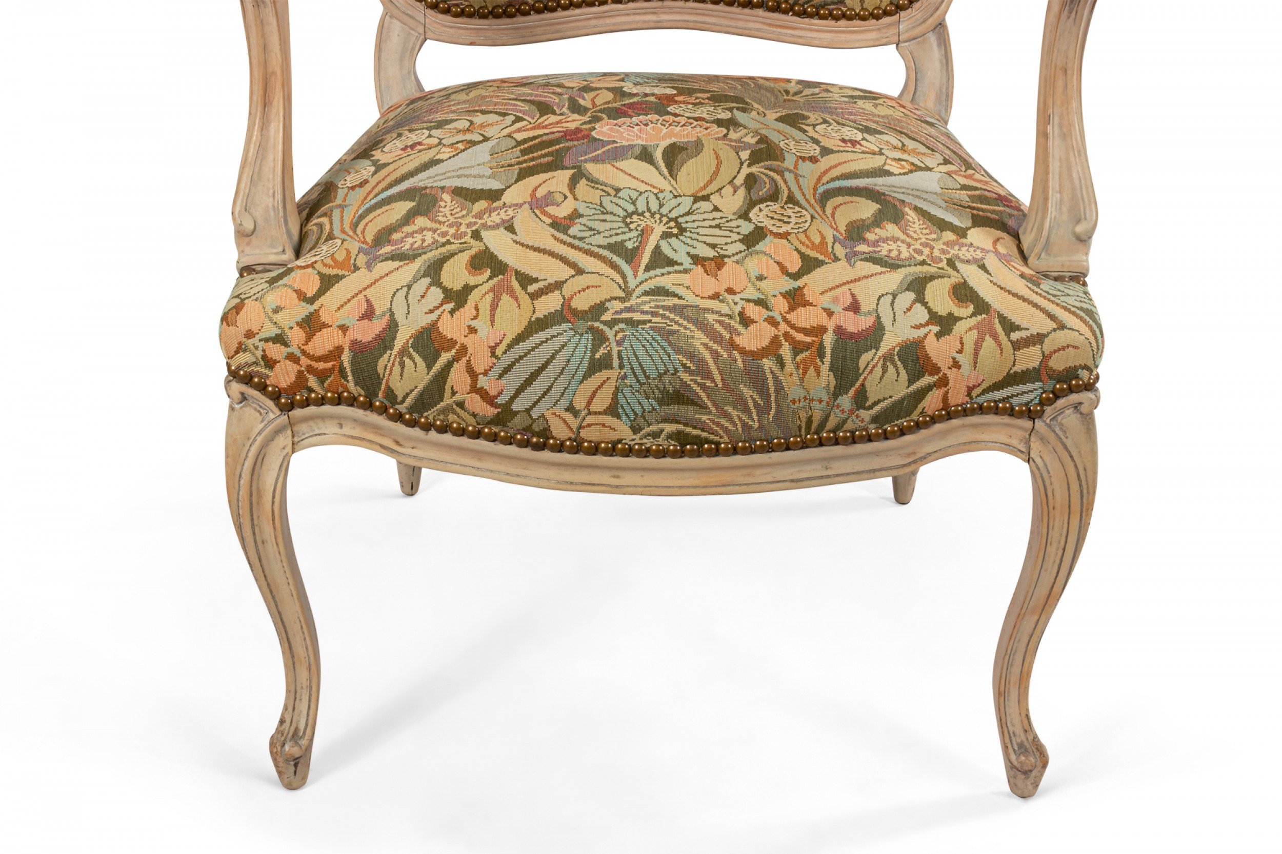 PAIR of French Louis XV style (20th Cent) bleached open Armchairs with tapestry style upholstered seat and back