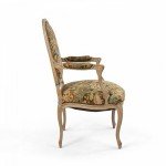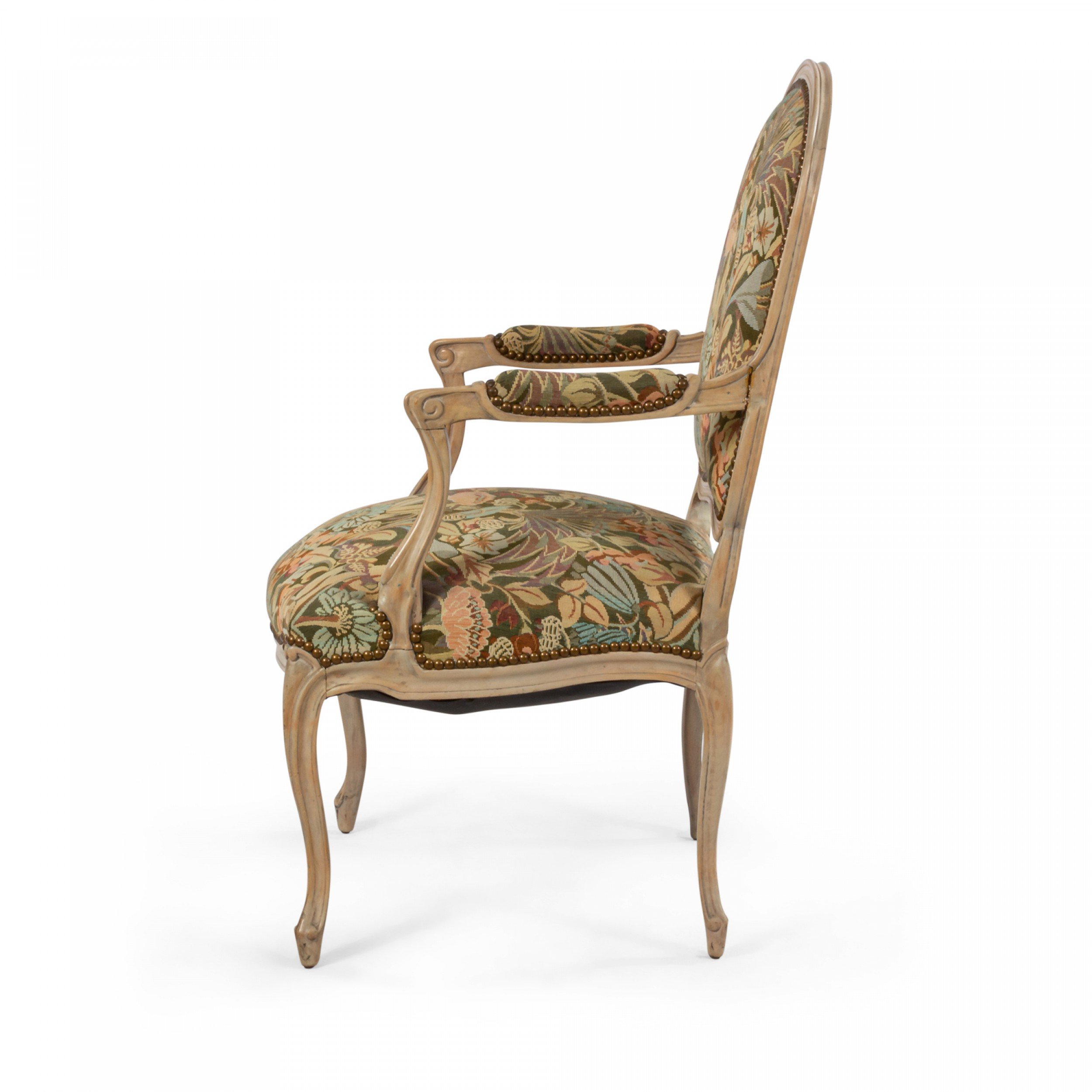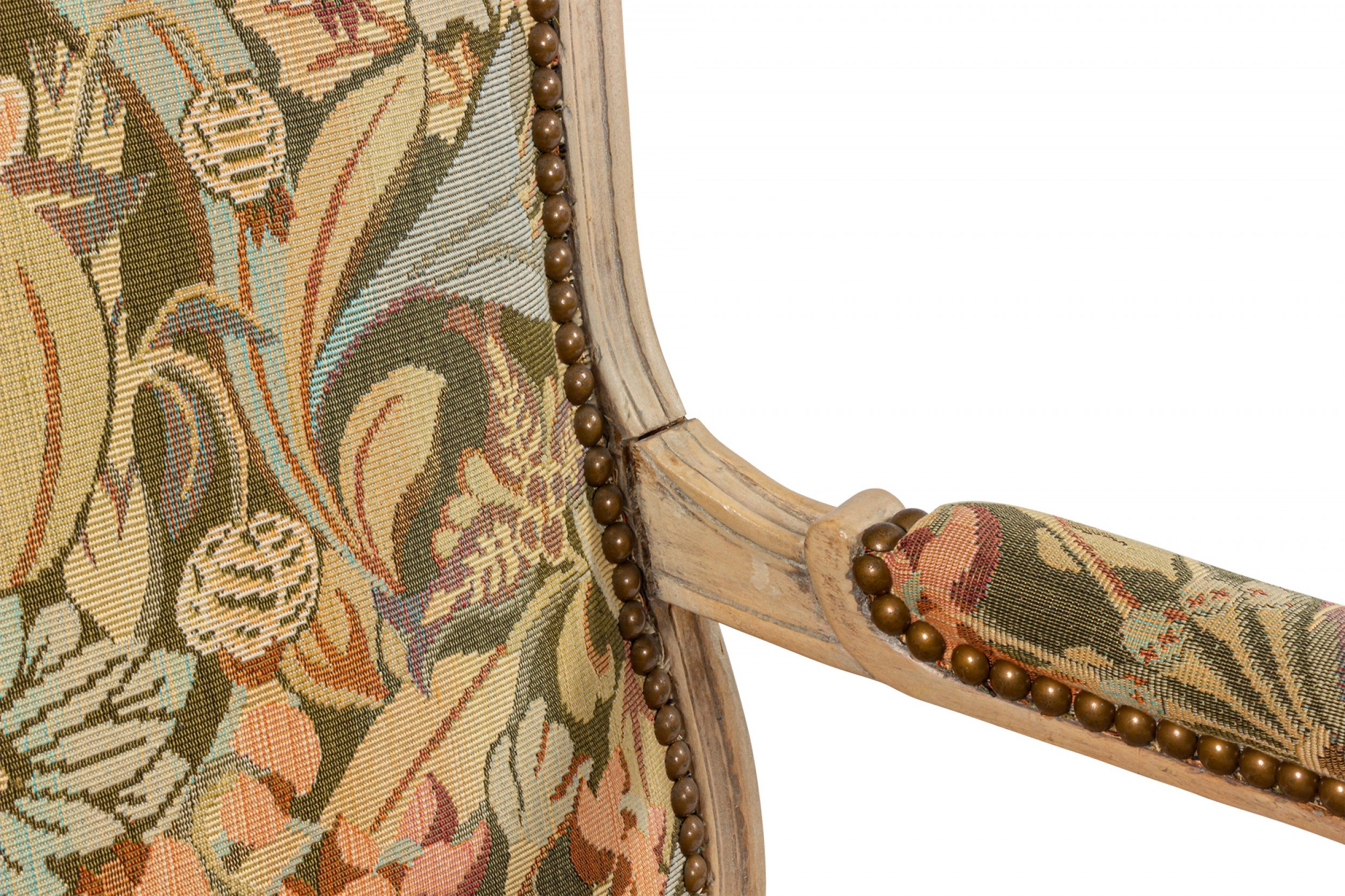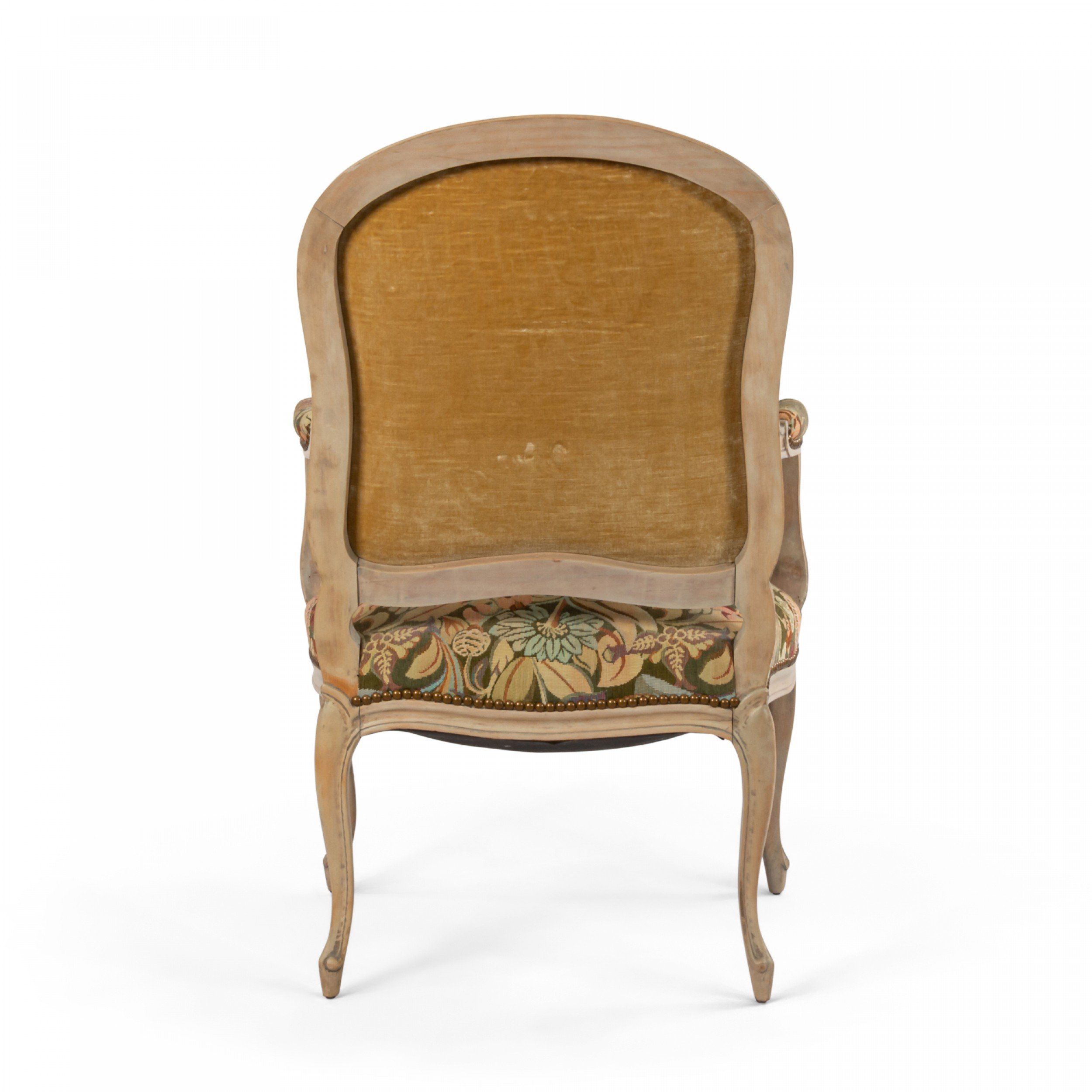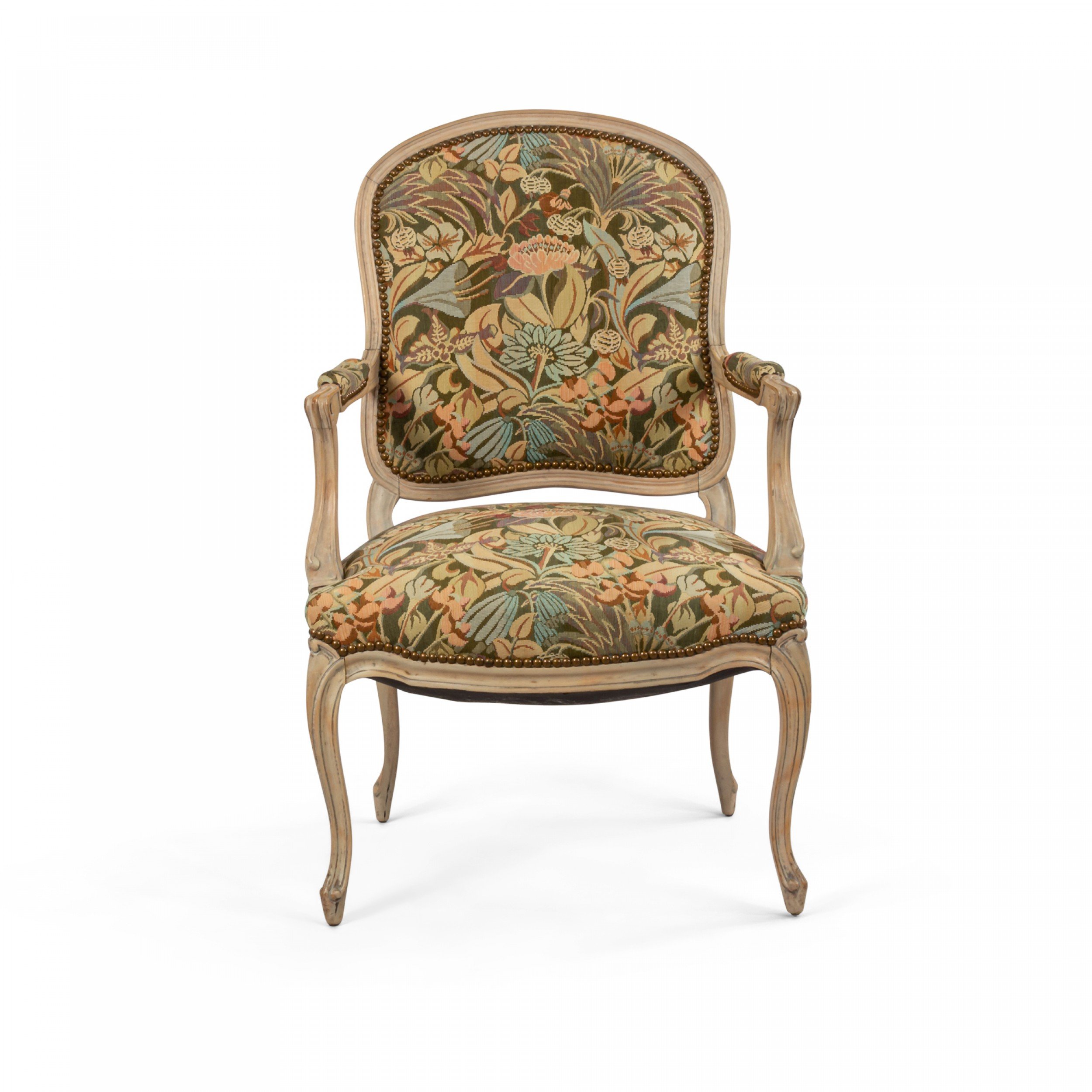 PAIR of French Louis XV style (20th Cent) bleached open Armchairs with tapestry style upholstered seat and back