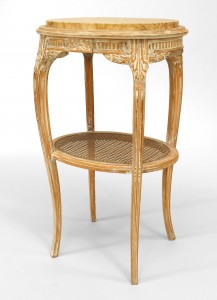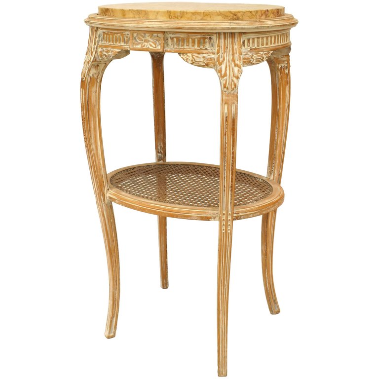 French Louis XV-style (19th Century) bleached oval end table with cane shelf and marble top.