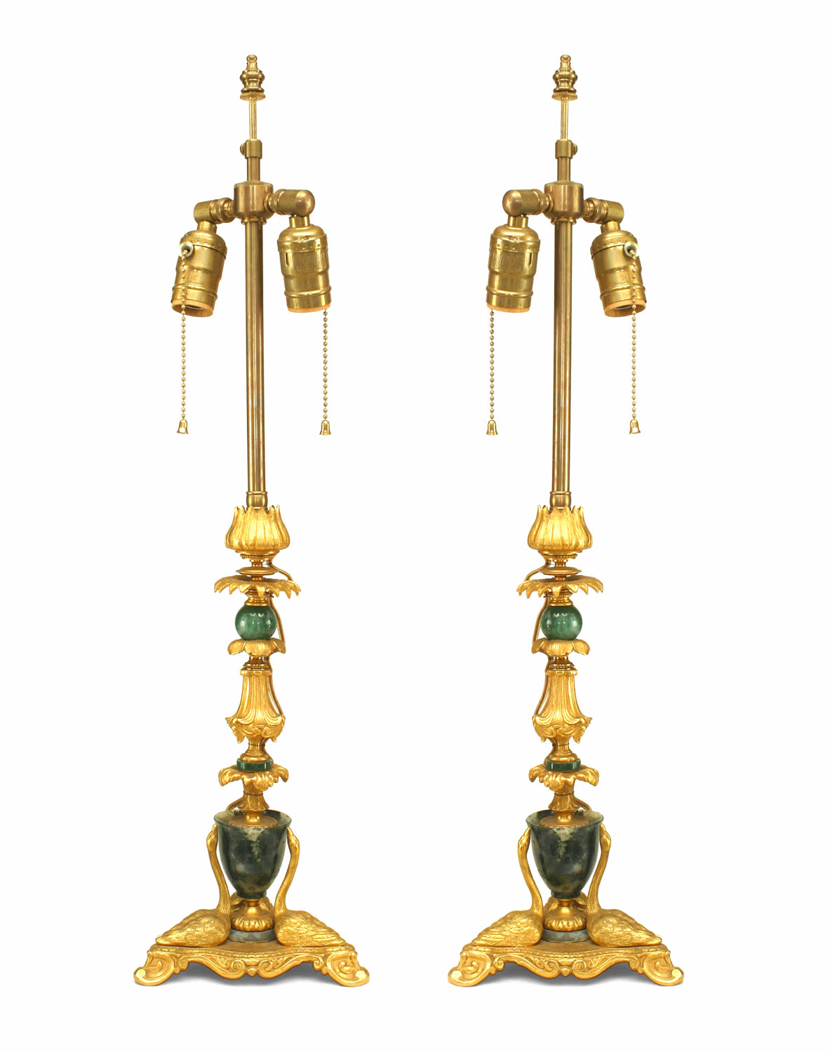 PAIR of French Louis XV style (1940s) bronze dore and green agate table lamps with 3 swans at base (PRICED AS PAIR).